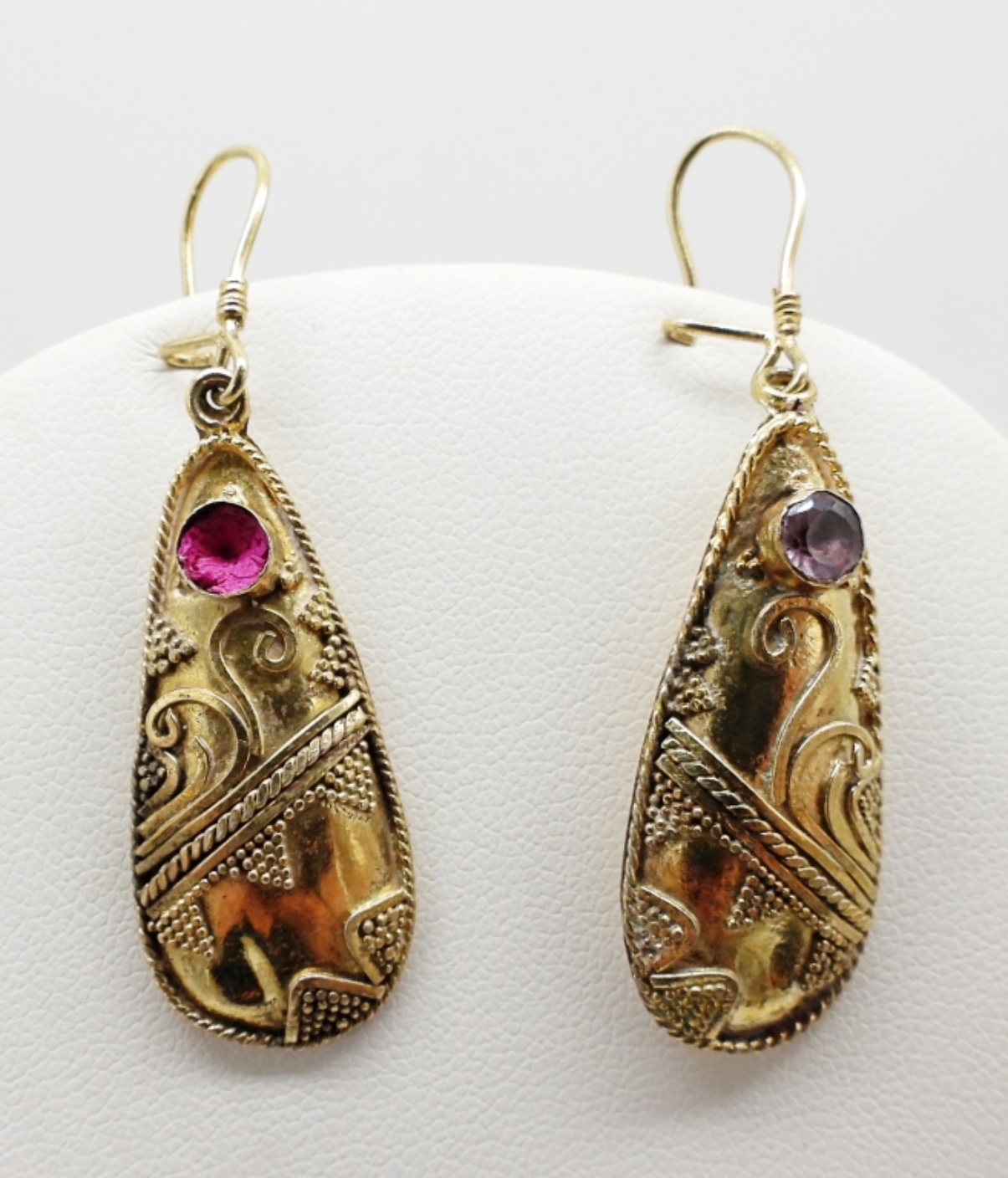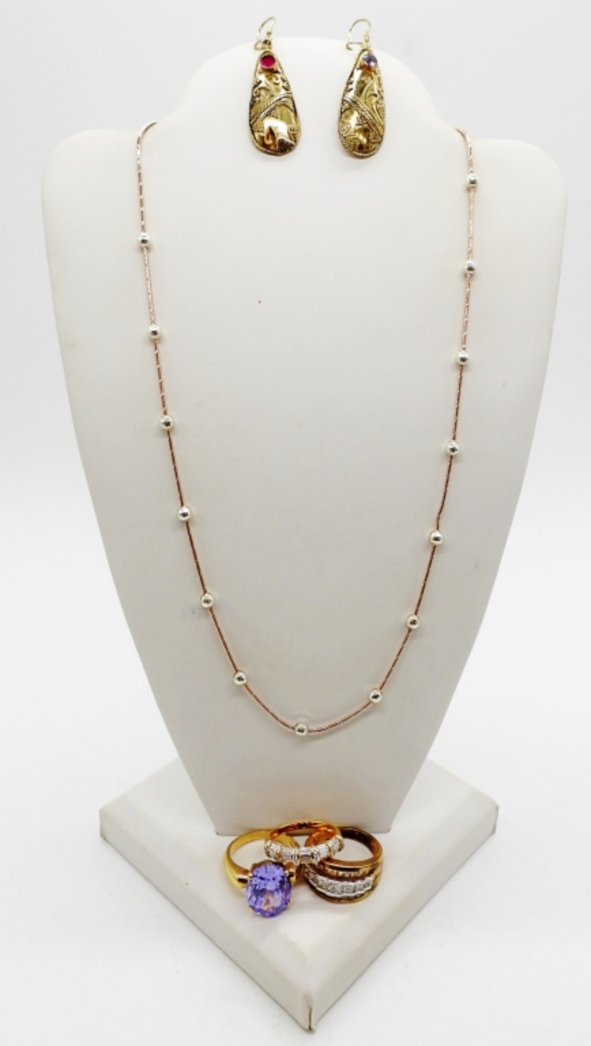 STERLING, GOLD TONE JEWELRY. 3 RINGS, SIZE 8. PIERCED EARRINGS, 2″ LONG (ONE MISSING IT’S GEMSTONE). GOLD AND SILVER TONE 925 NECKLACE, 18″ (17.7 DWT)