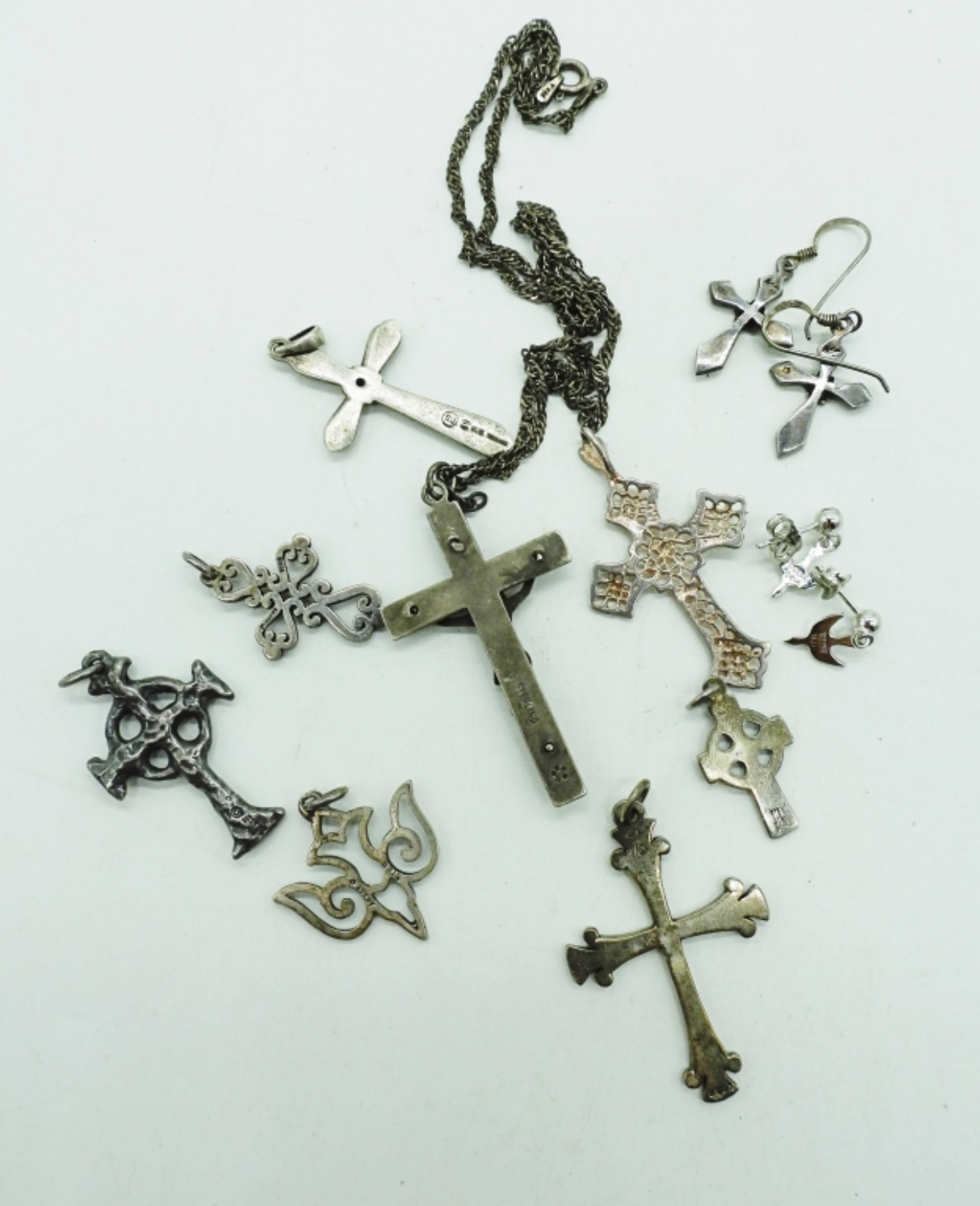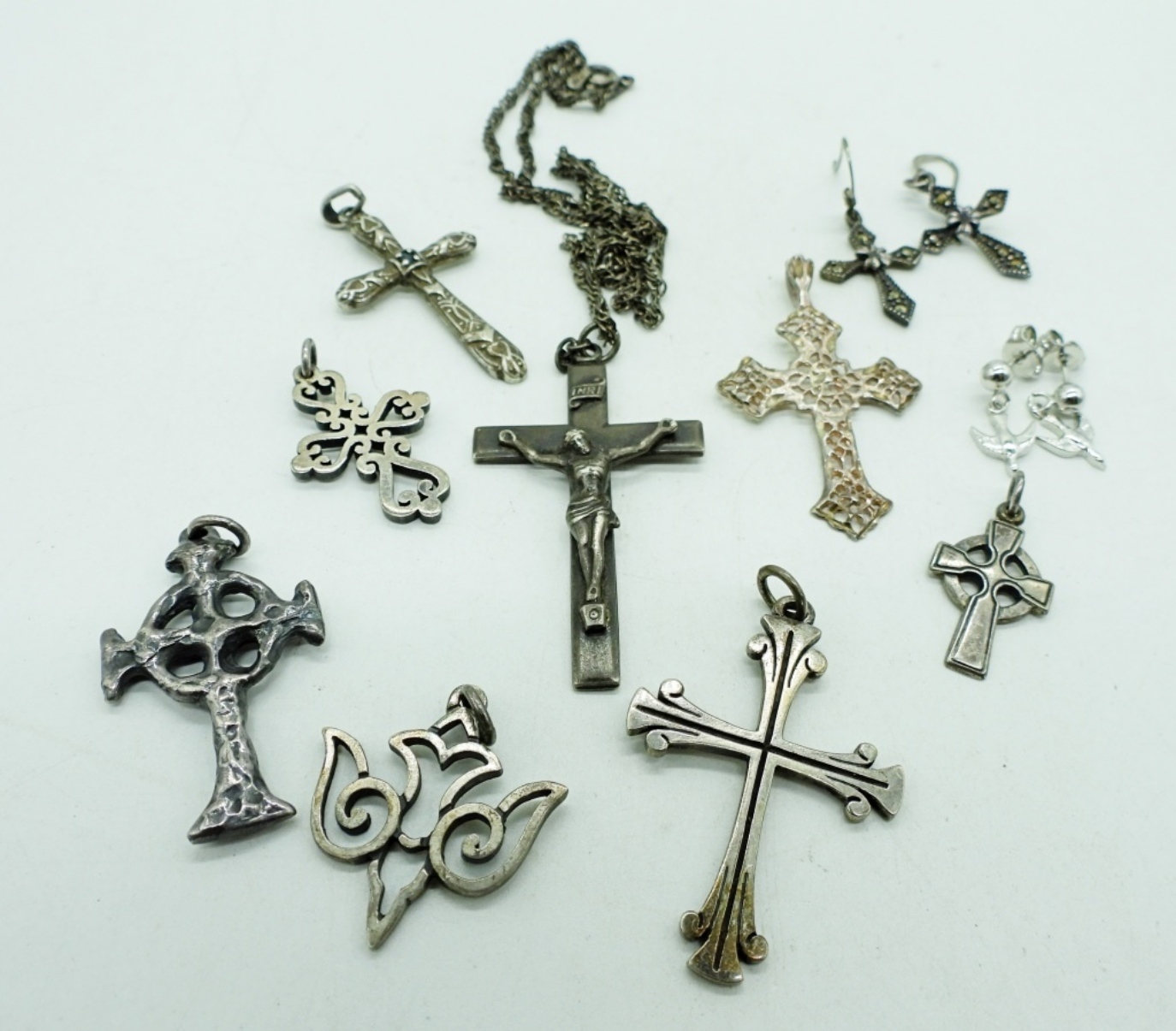TEN RELIGIOUS PENDANTS AND PIERCED EARRINGS. 1″ – 2″. CHAIN IS 18″ (23.3 DWT)