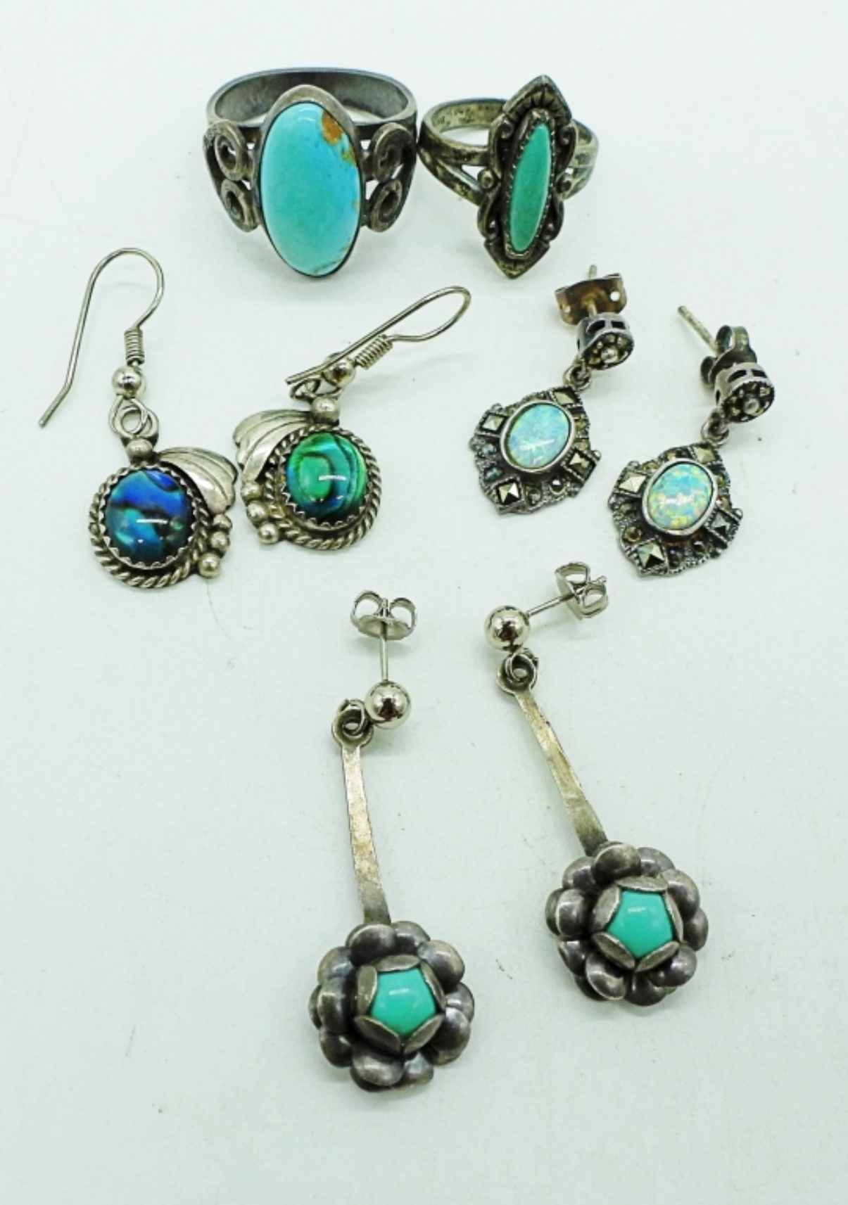 TWO TURQUOISE RINGS, SIZE 5 & 9. PIERCED TURQUOISE EARRINGS. ONE PAIR PIERCED ABALONE EARRINGS. ONE PAIR PIERCED OPAL AND MARCASITE EARRINGS. (14.2 DWT)