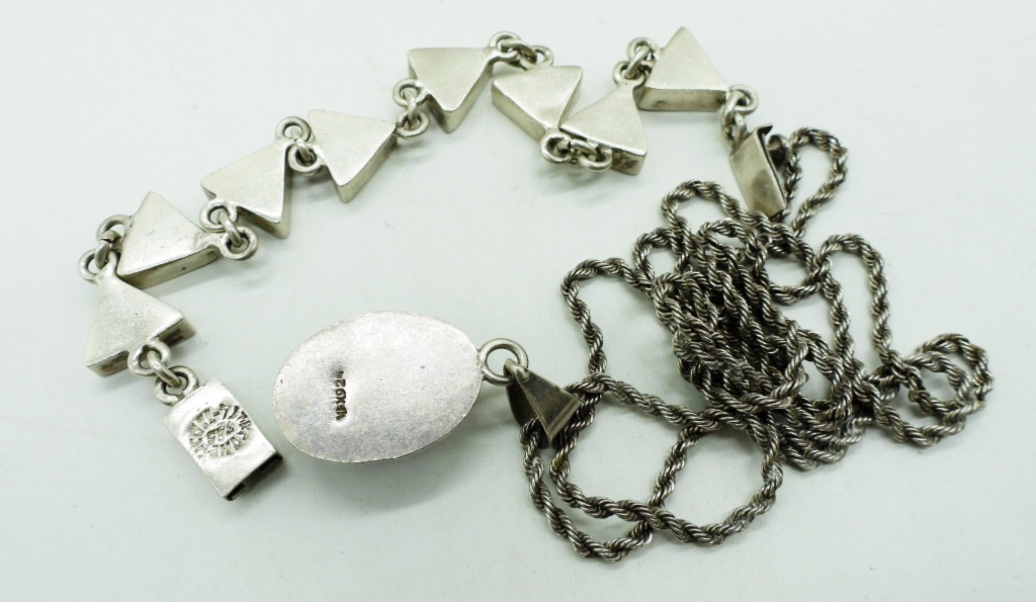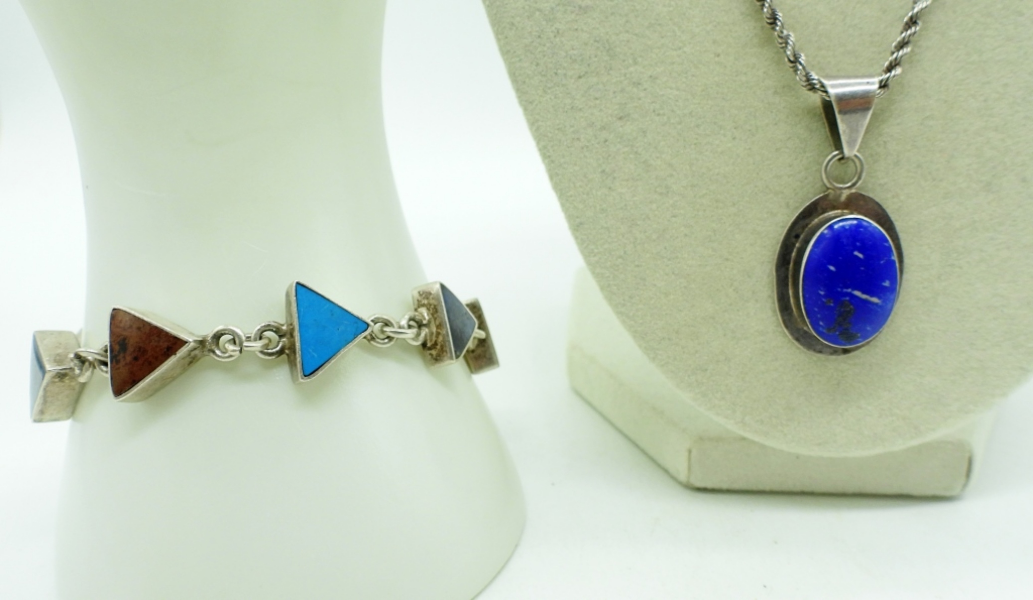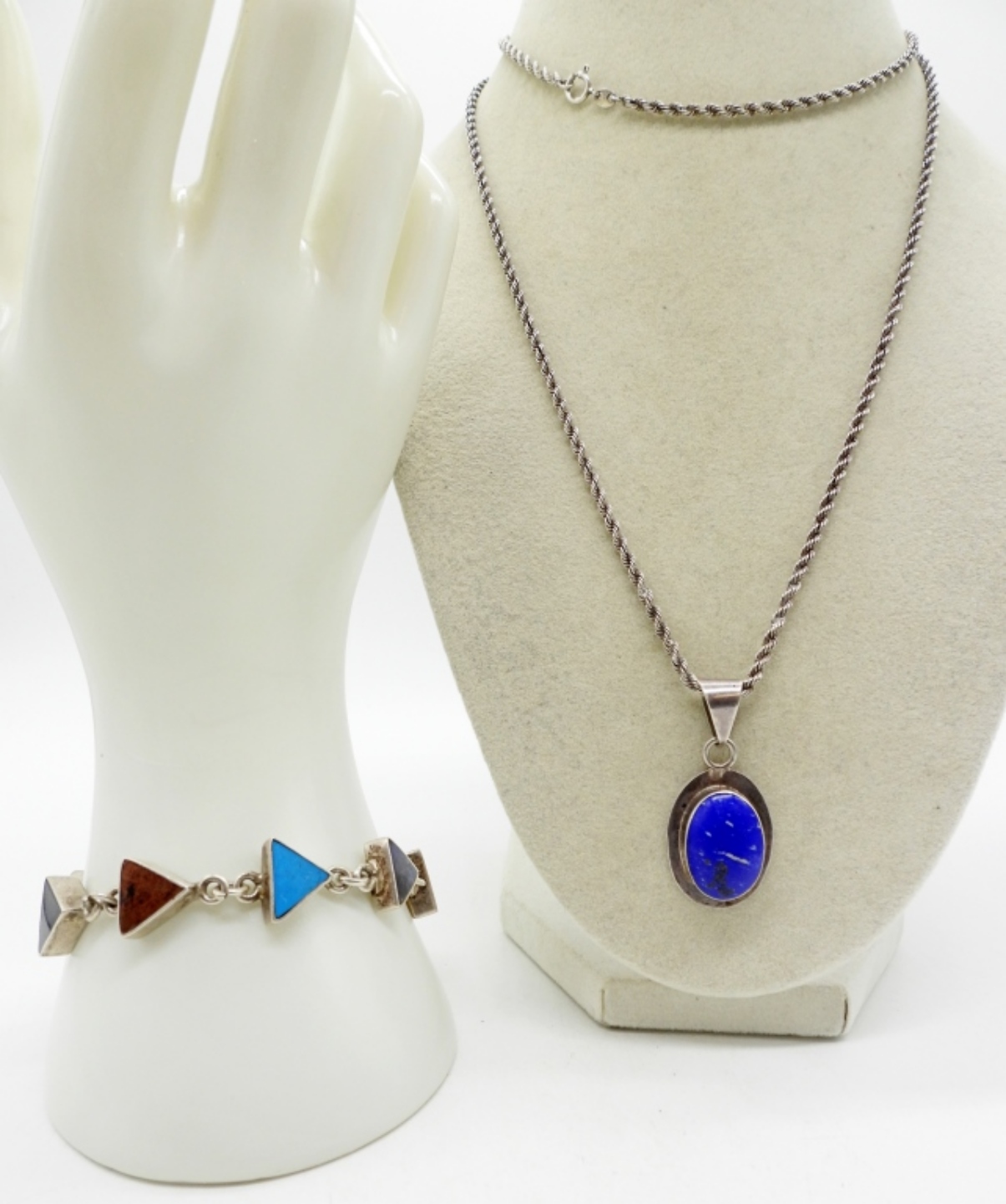 VINTAGE STERLING, MEXICO BRACELET & NECKLACE. LAPIS LAZULI, MALACHITE, ONYX, TURQUOISE & MORE GEMSTONES. 7.5″ & 30″. (27 DWT)