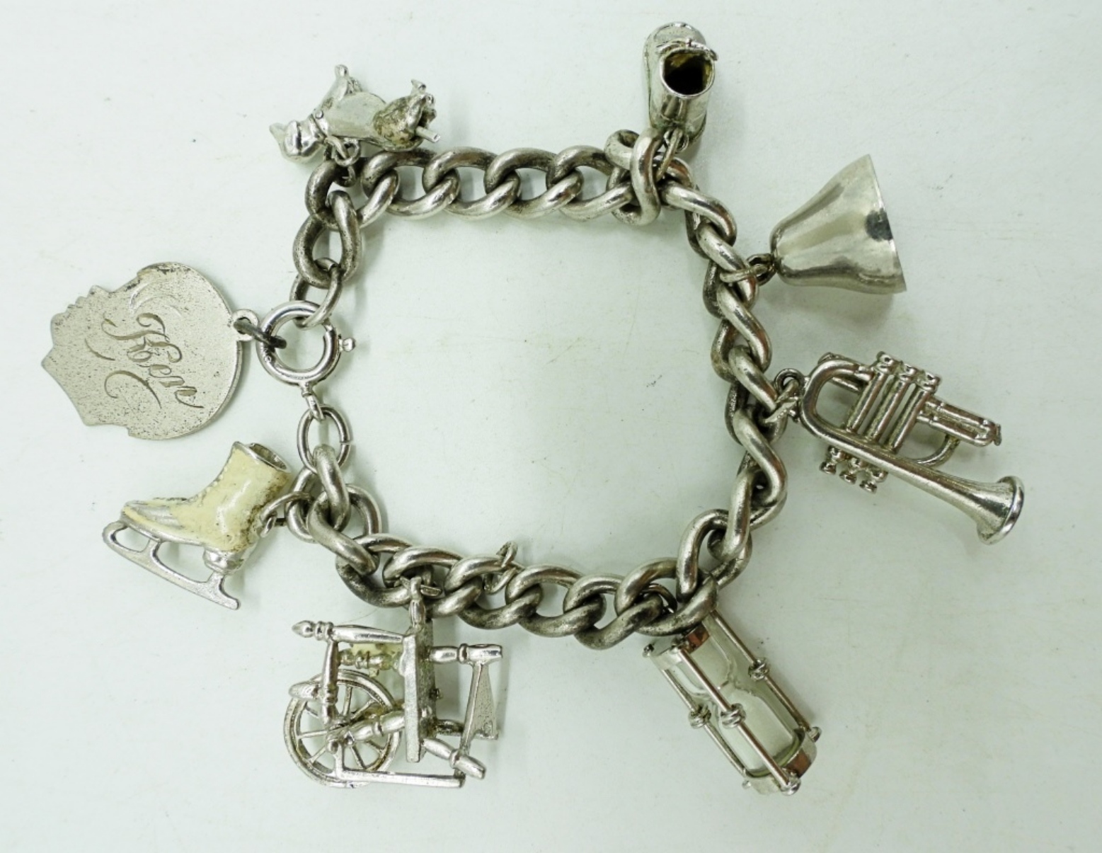 6″ VINTAGE STERLING CHARM BRACELET, 8 CHARMS. (27.2 DWT)