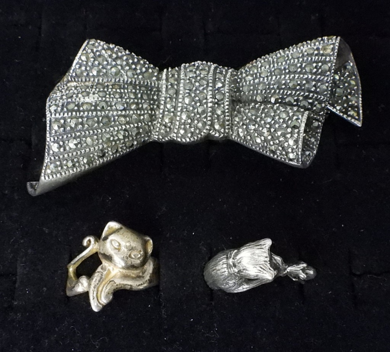 TWO STERLING CAT RINGS, SIZES 7-8. ONE LARGE MARCASITE STERLING BOW BROOCH. 3″ WIDE, 1.5″ LONG. (19.7 DWT)