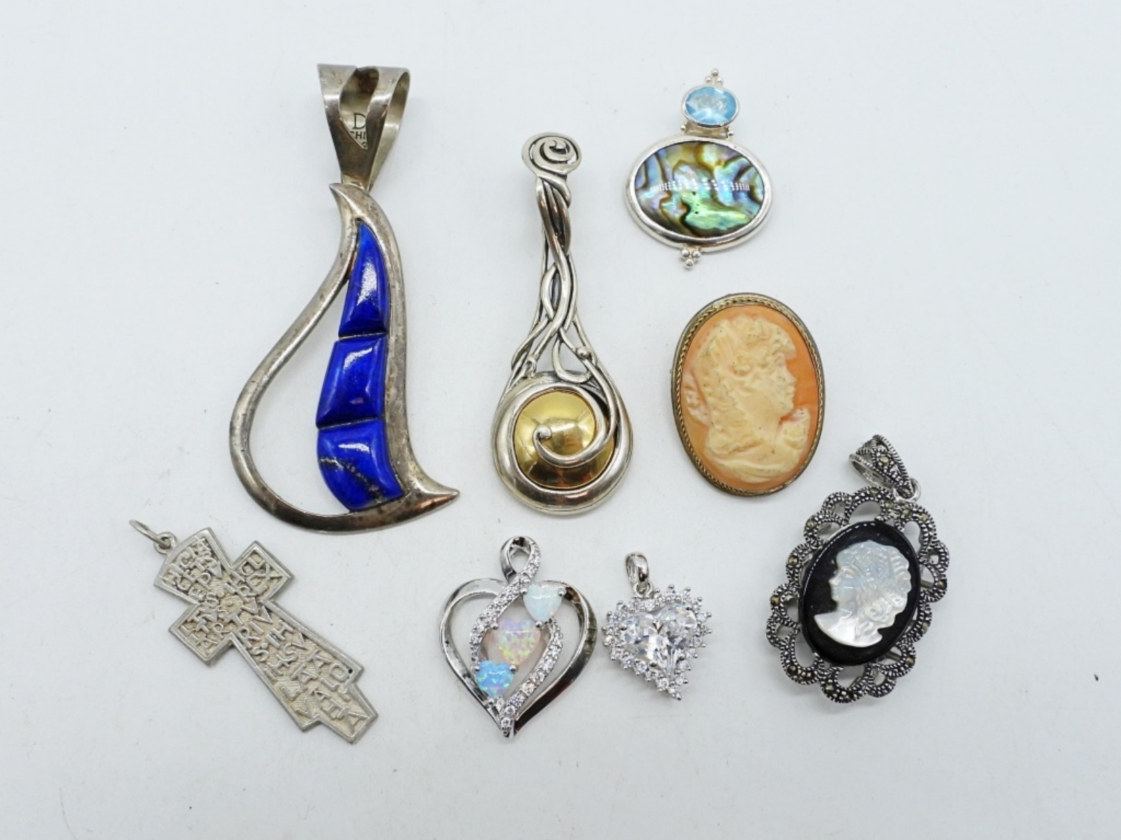 EIGHT STERLING PENDANTS. CAMEO, ONYX, MOP, OPAL, ABALONE. .5″ – 3″. (25.8 DWT)