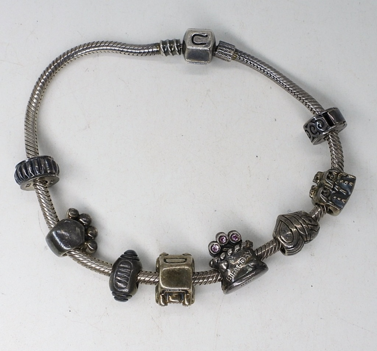 VINTAGE STERLING CHARM BRACELET, SIMILAR TO A PANDORA. 8 CHARMS. 8.5″. (25.8 DWT)