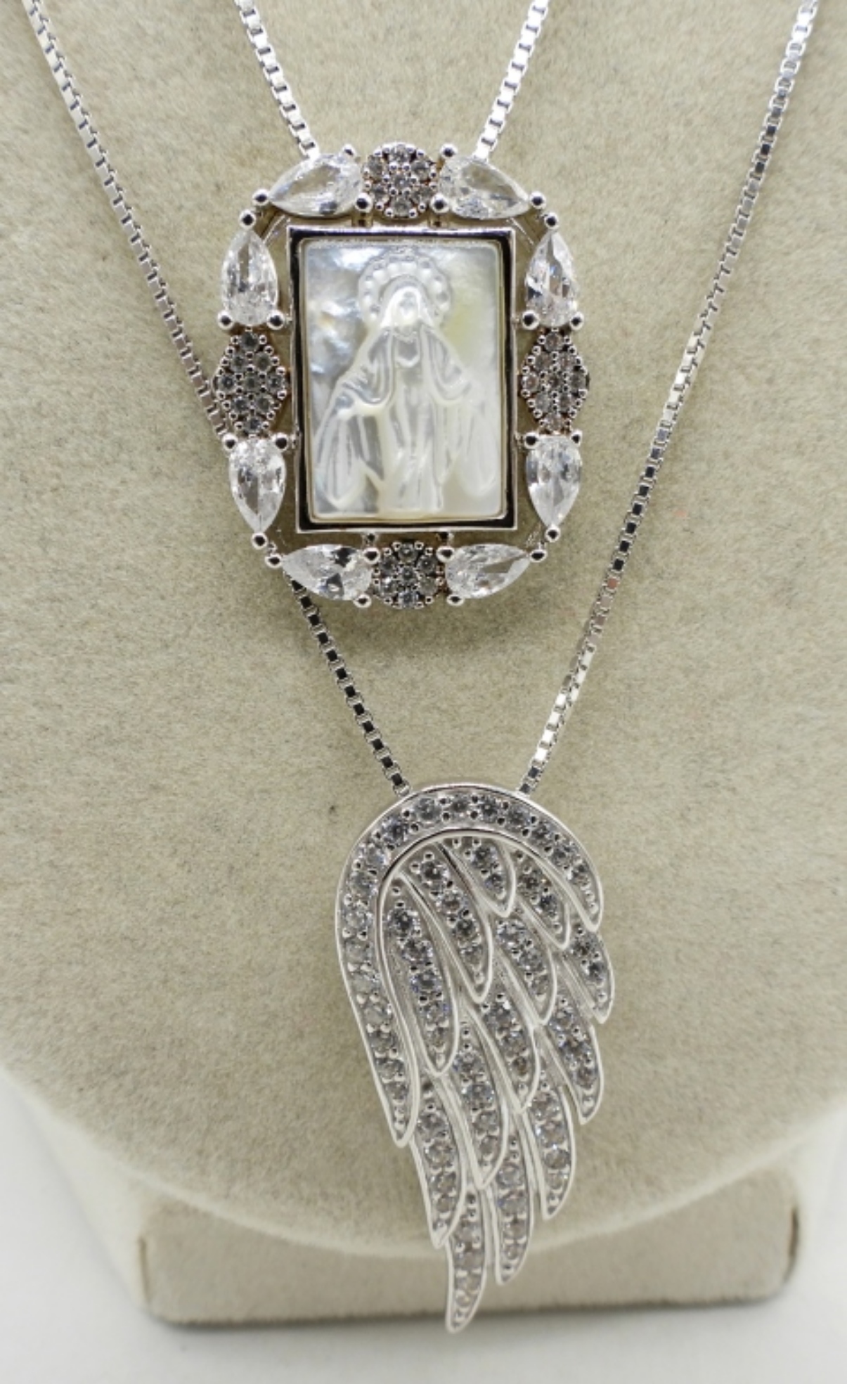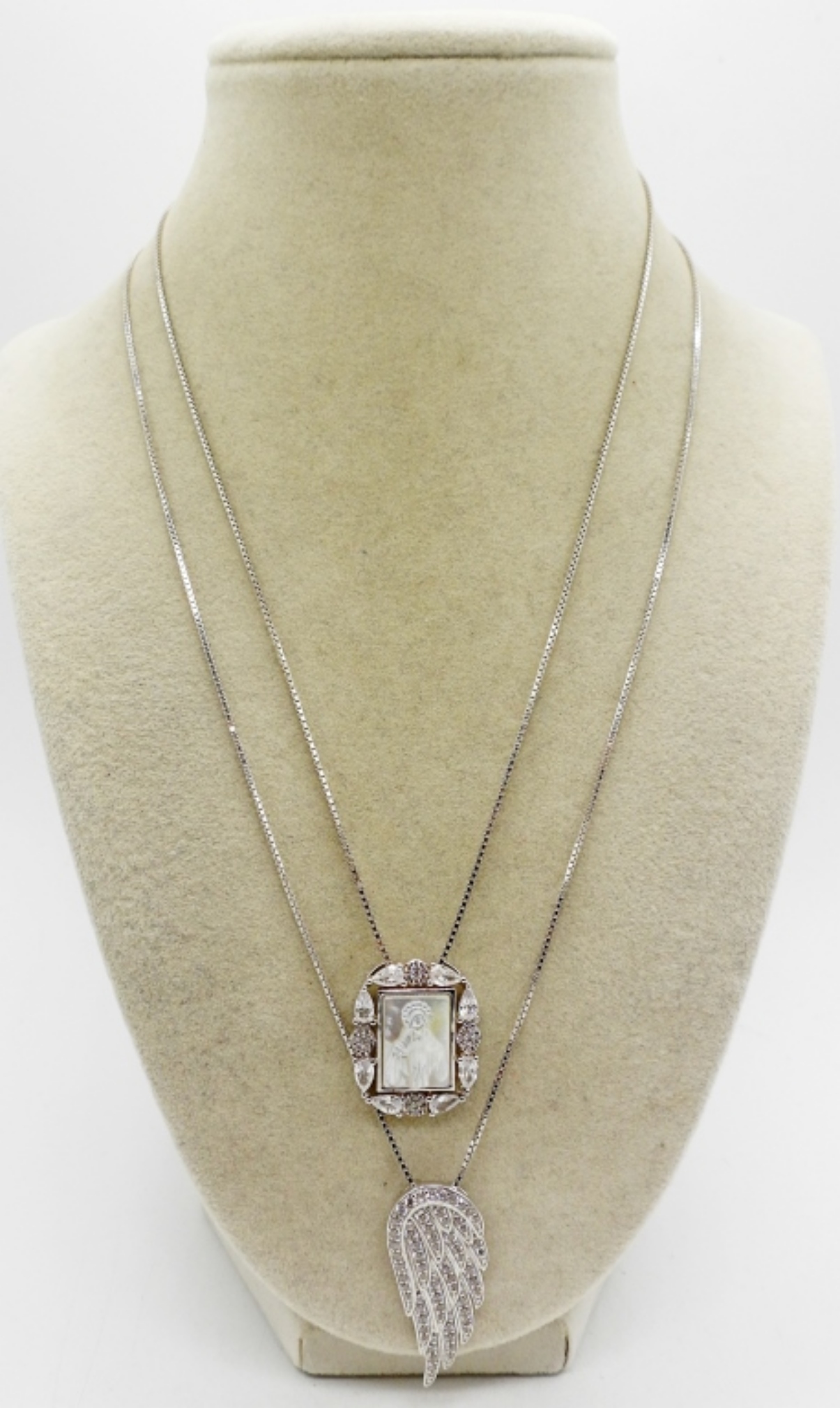 TWO STERLING NECKLACES, SIMULATED DIAMONDS AND MOTHER OF PEARL. 20″ & 22″. (9.5 DWT)