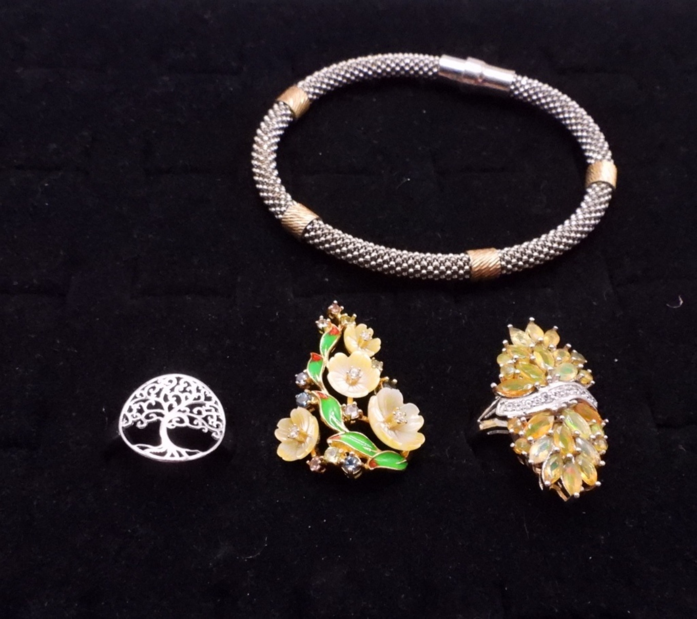 THREE STERLING FASHION RINGS. GOLD TONE FLORAL, OPAL & TREE OF LIFE. STERLING & GOLD TONE BRACELET. RINGS ARE 7 & 8. 7.5″ BRACELET. (17.6 DWT)