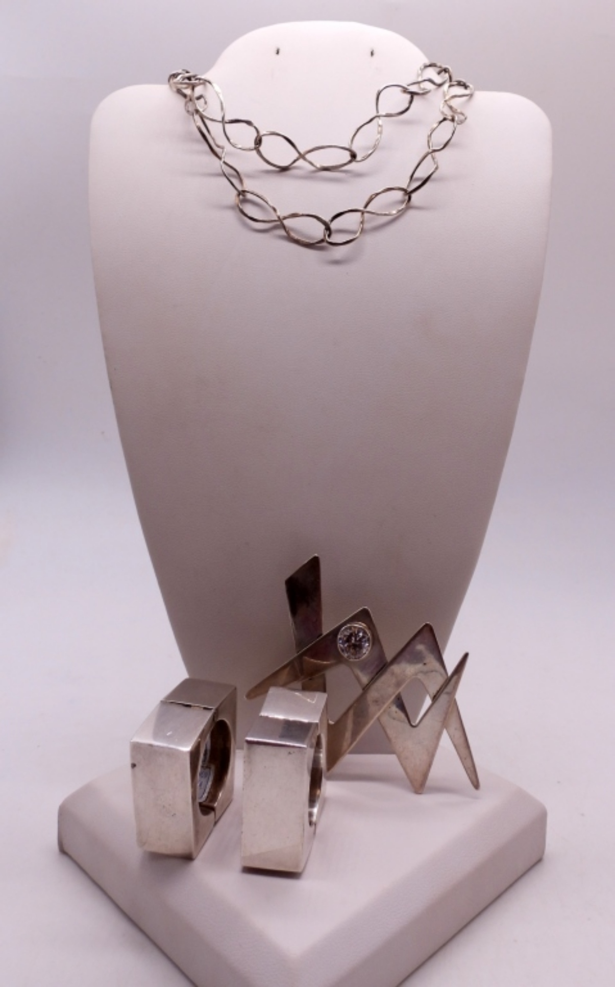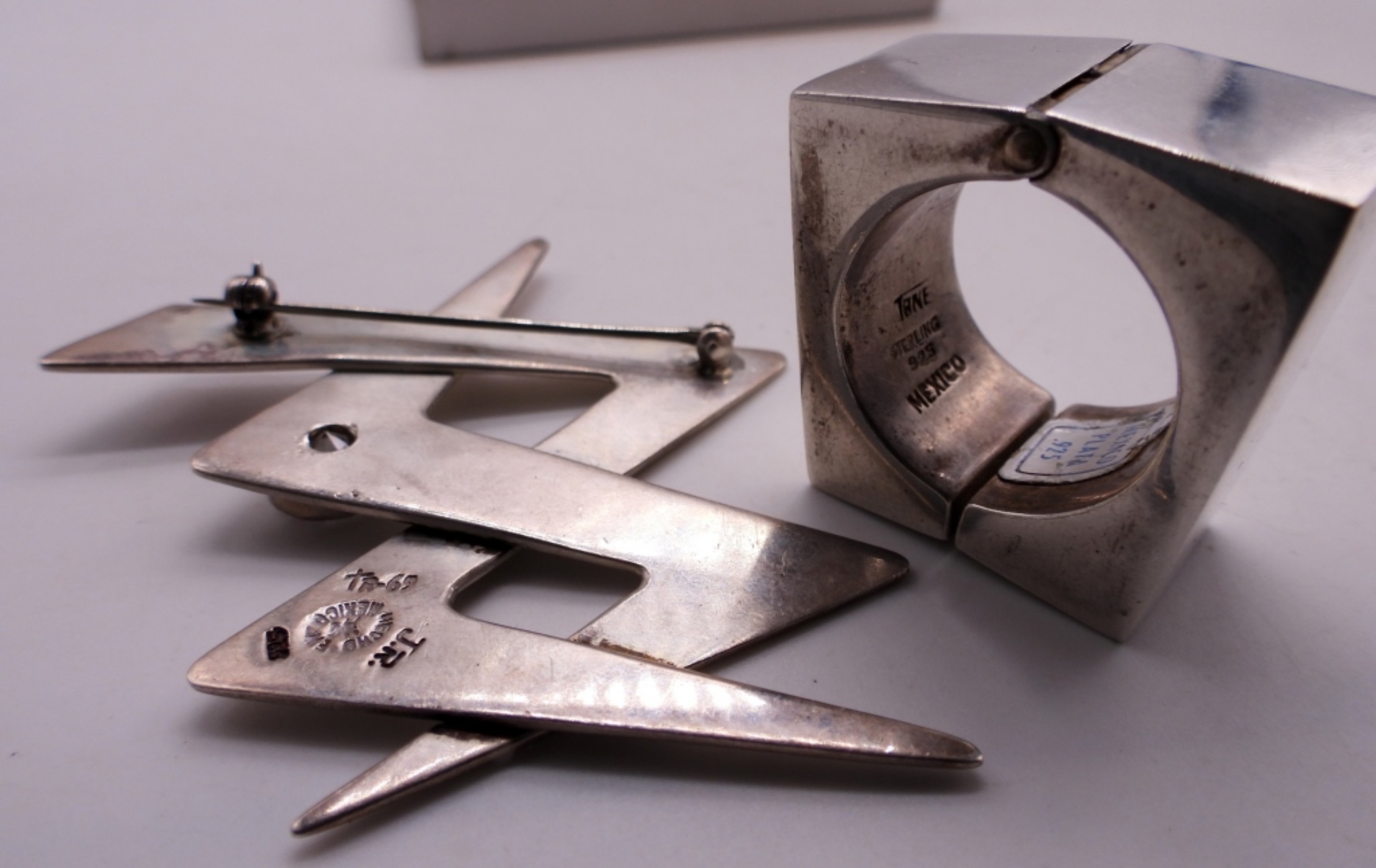 TAXCO STERLING BROOCH “TR-69 HECHO EN MEXICO JR”, 2.5″. MEXICO PLATA ODDLY SHAPED PIERCED EARRINGS. 22″ STERLING NECKLACE. (38.2 DWT)