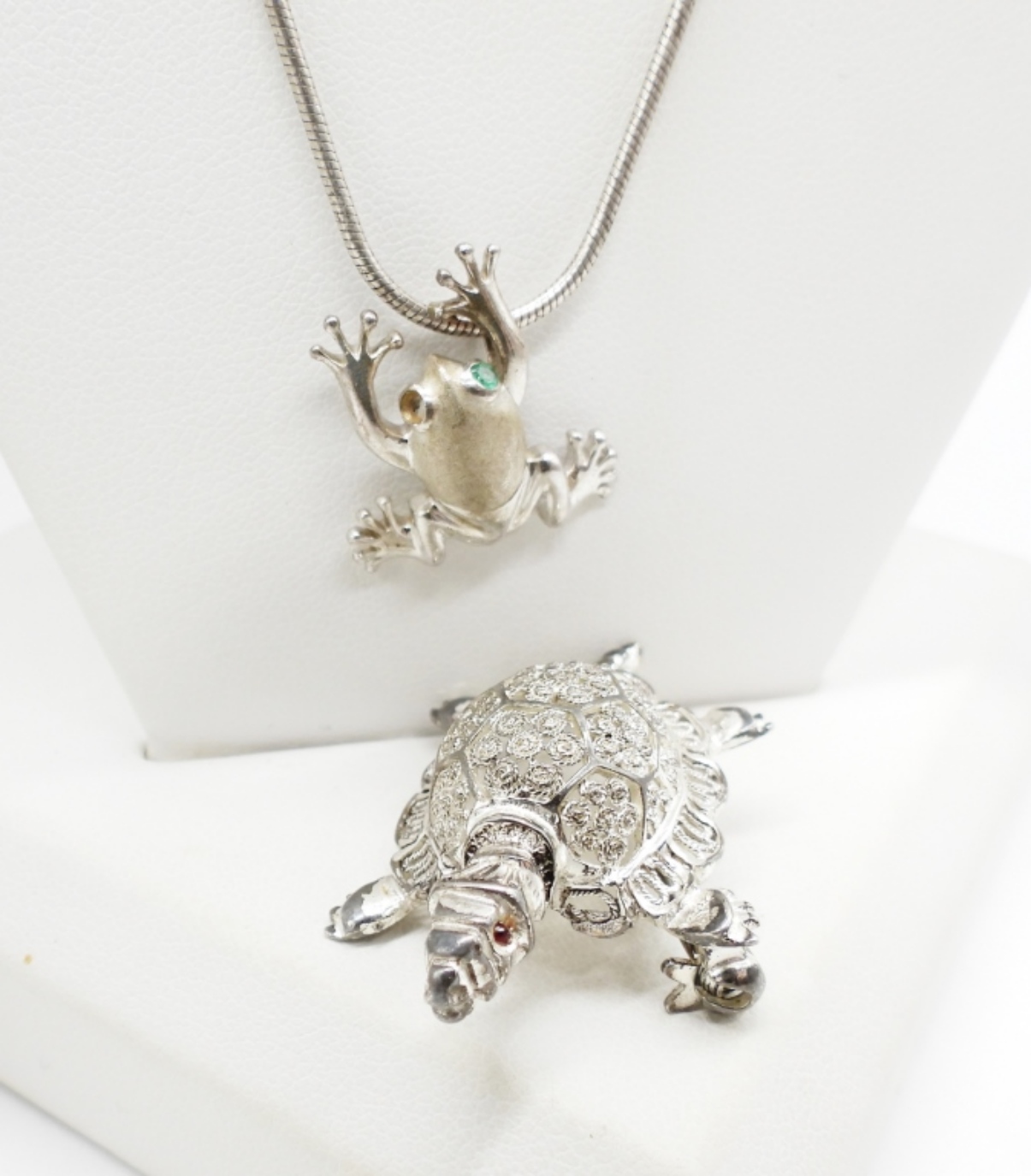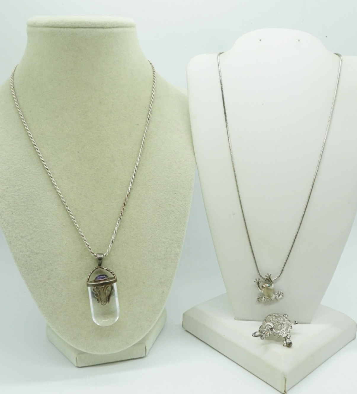 TWO STERLING NECKLACES, 18″ & 20″. CUTE TURTLE PIN, 1.5″ LONG. (16.1 DWT)