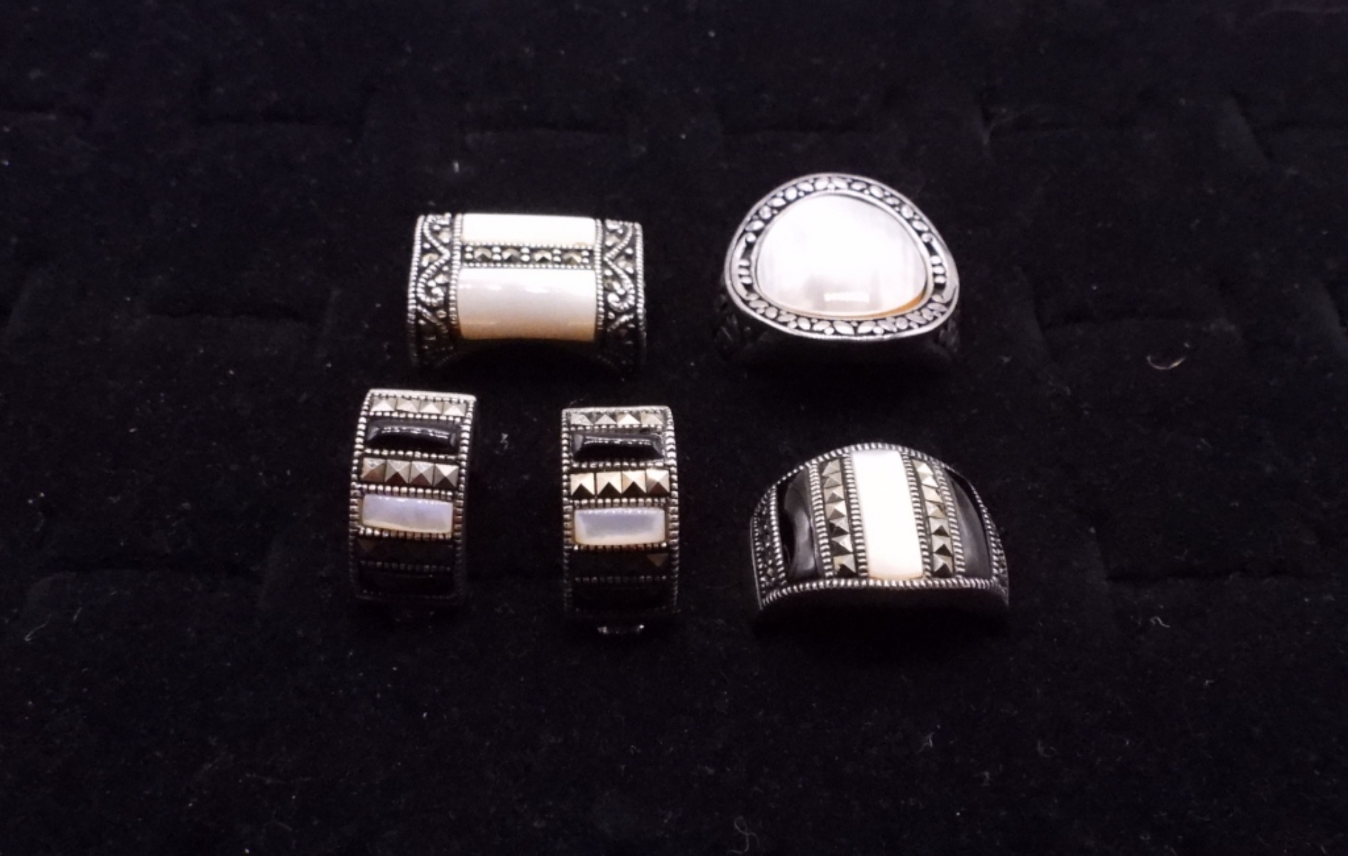 ALL STERLING. MOTHER OF PEARL, MARCASITE & BLACK ONYX RING WITH MATCHING PIERCED EARRINGS, 6. TWO OTHER MOTHER OF PEARL RINGS, SIZE 6. (23 DWT)
