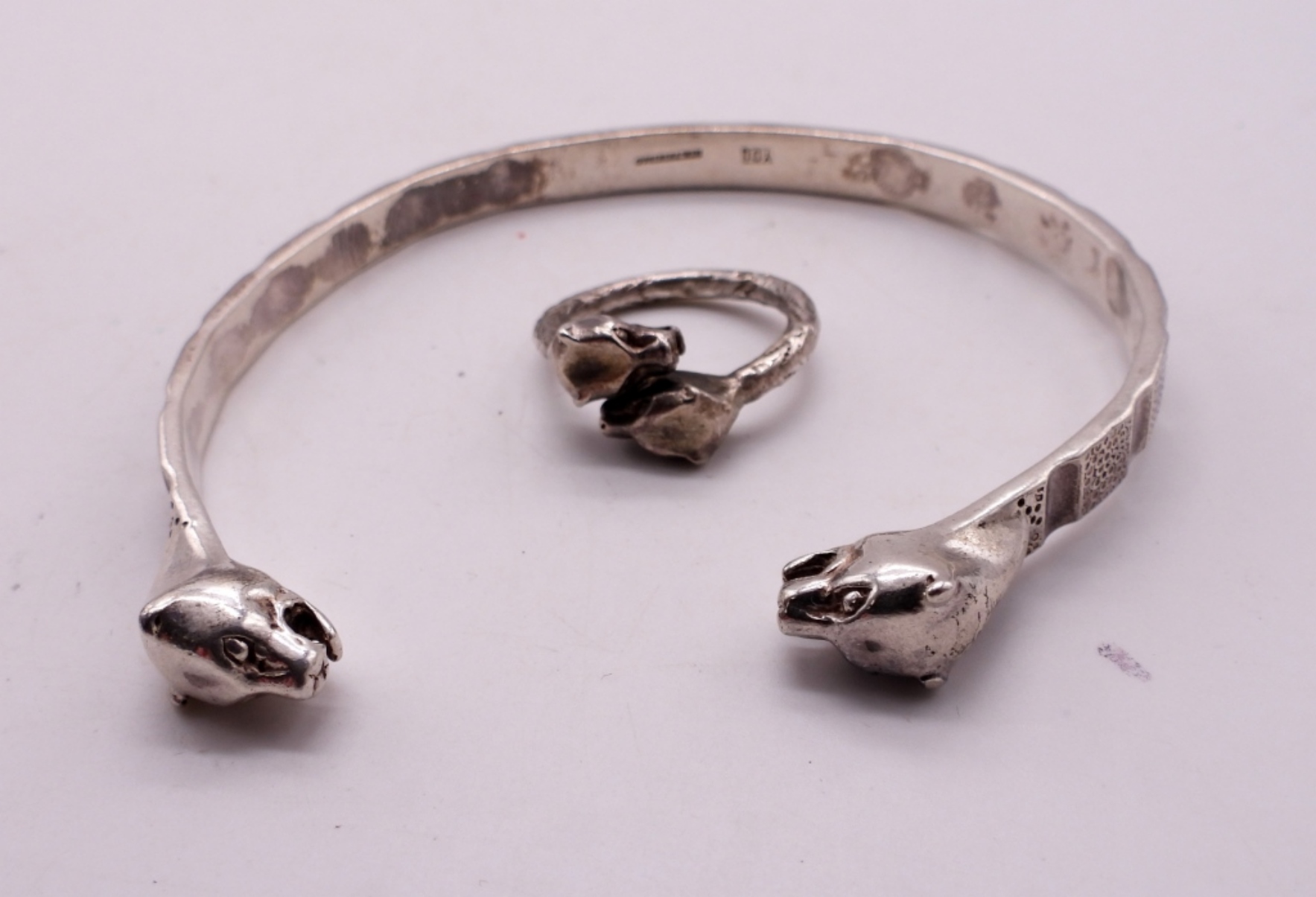 TRINIDAD! STERLING PANTHER HEAD BRACELET AND RING (6-7 ADJ.). BRACELET 7″. (24.8 DWT)