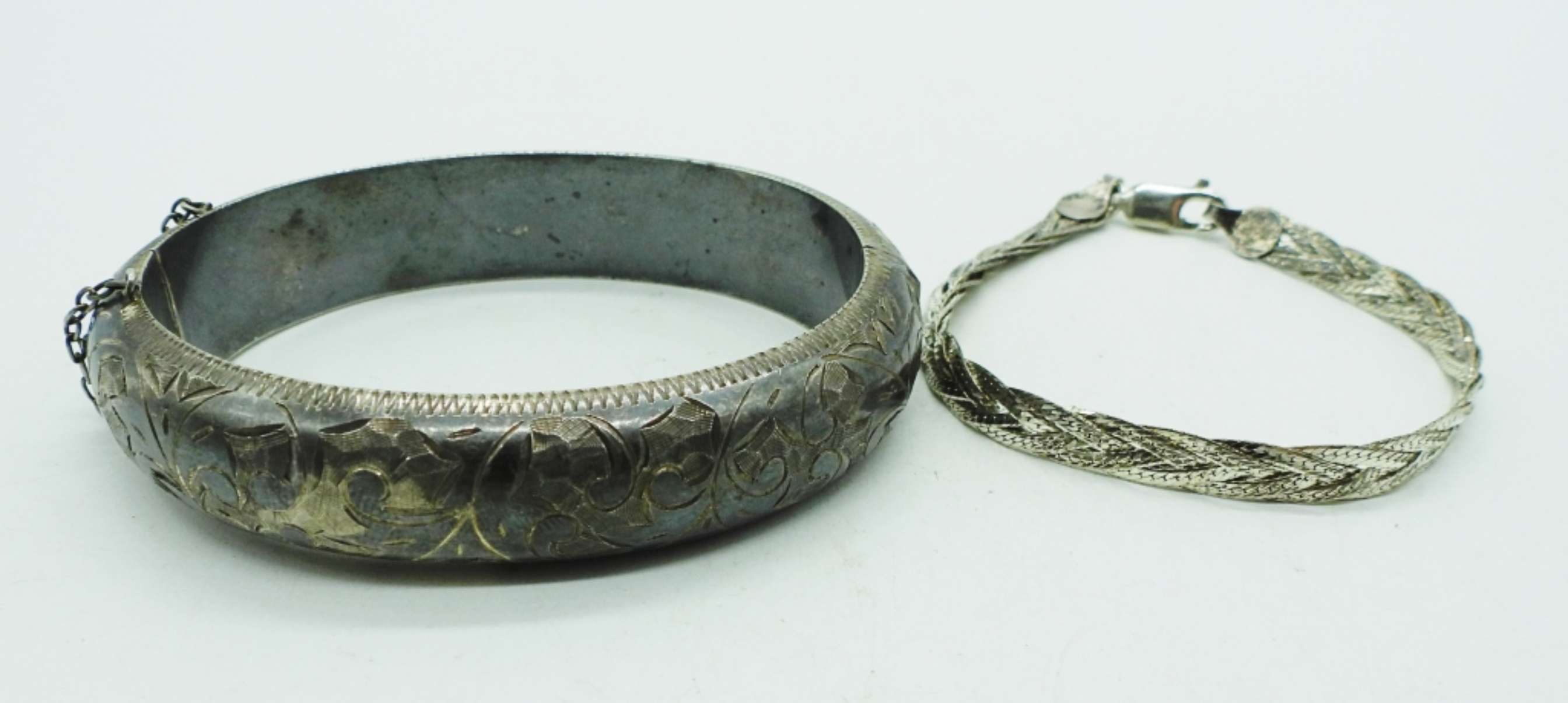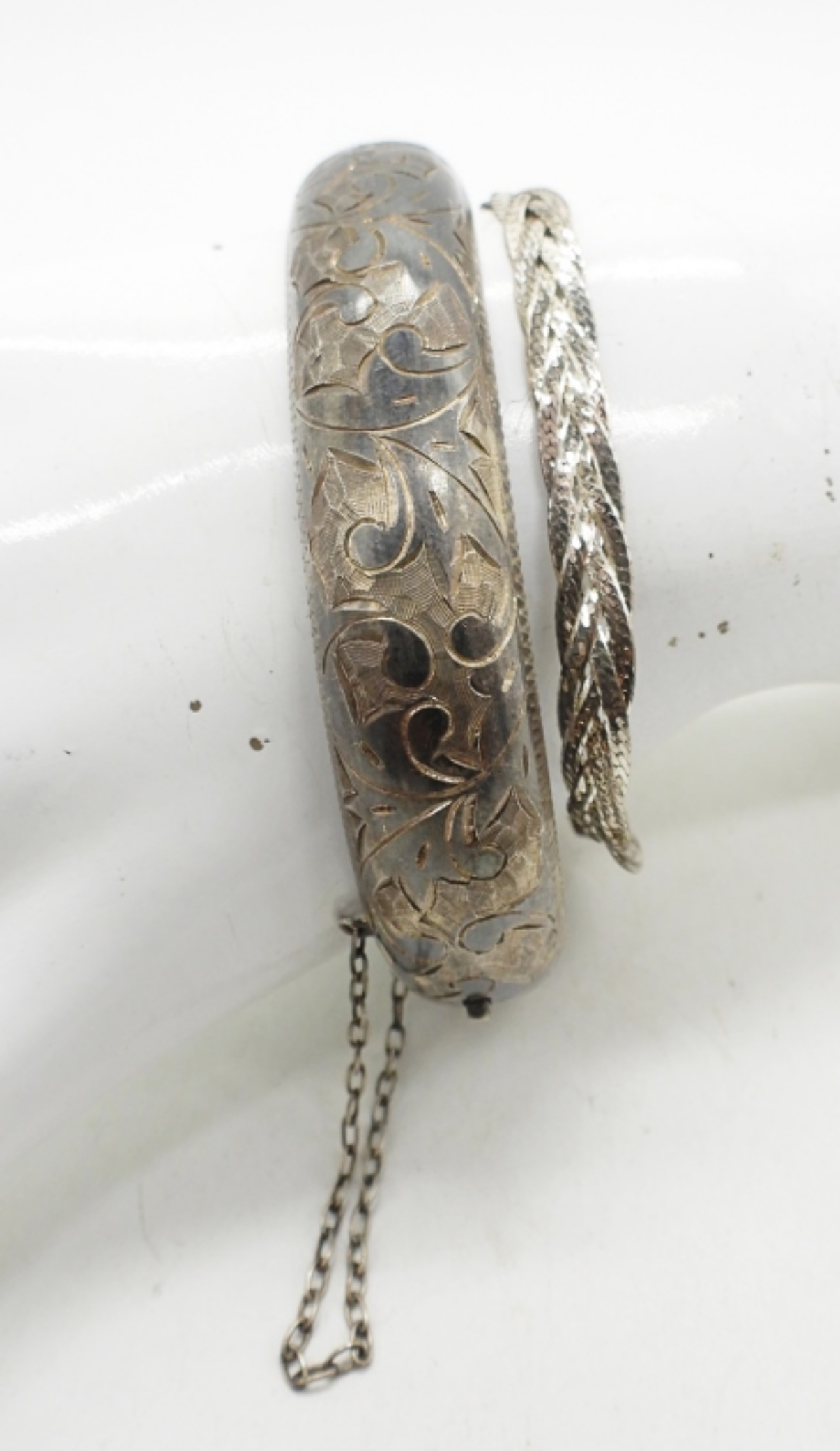 VINTAGE STERLING, HINGED ETCHED BANGLE BRACELET WITH SAFETY CHAIN. 8″. BRAIDED STERLING CHAIN BRACELET, 7″ (24 DWT)