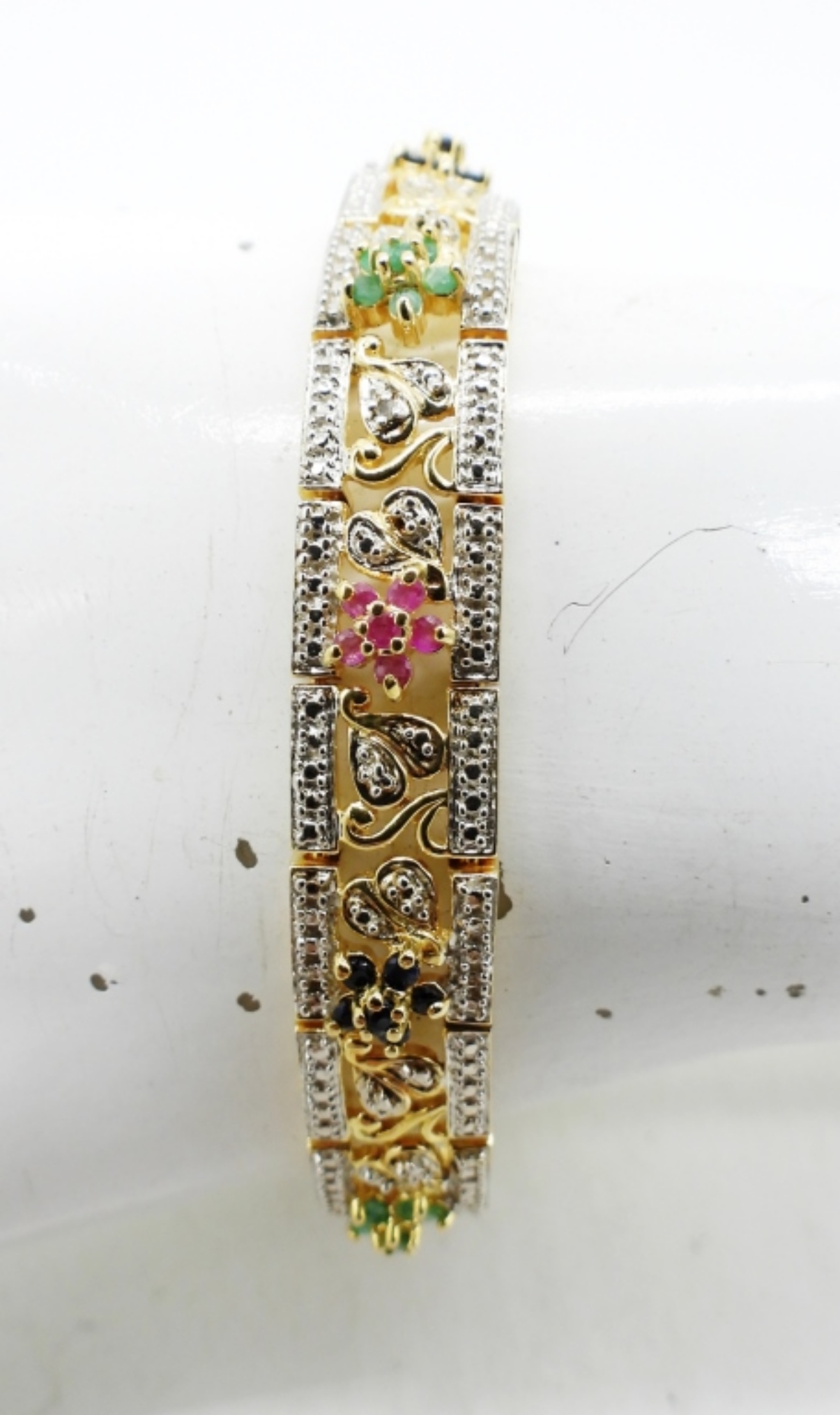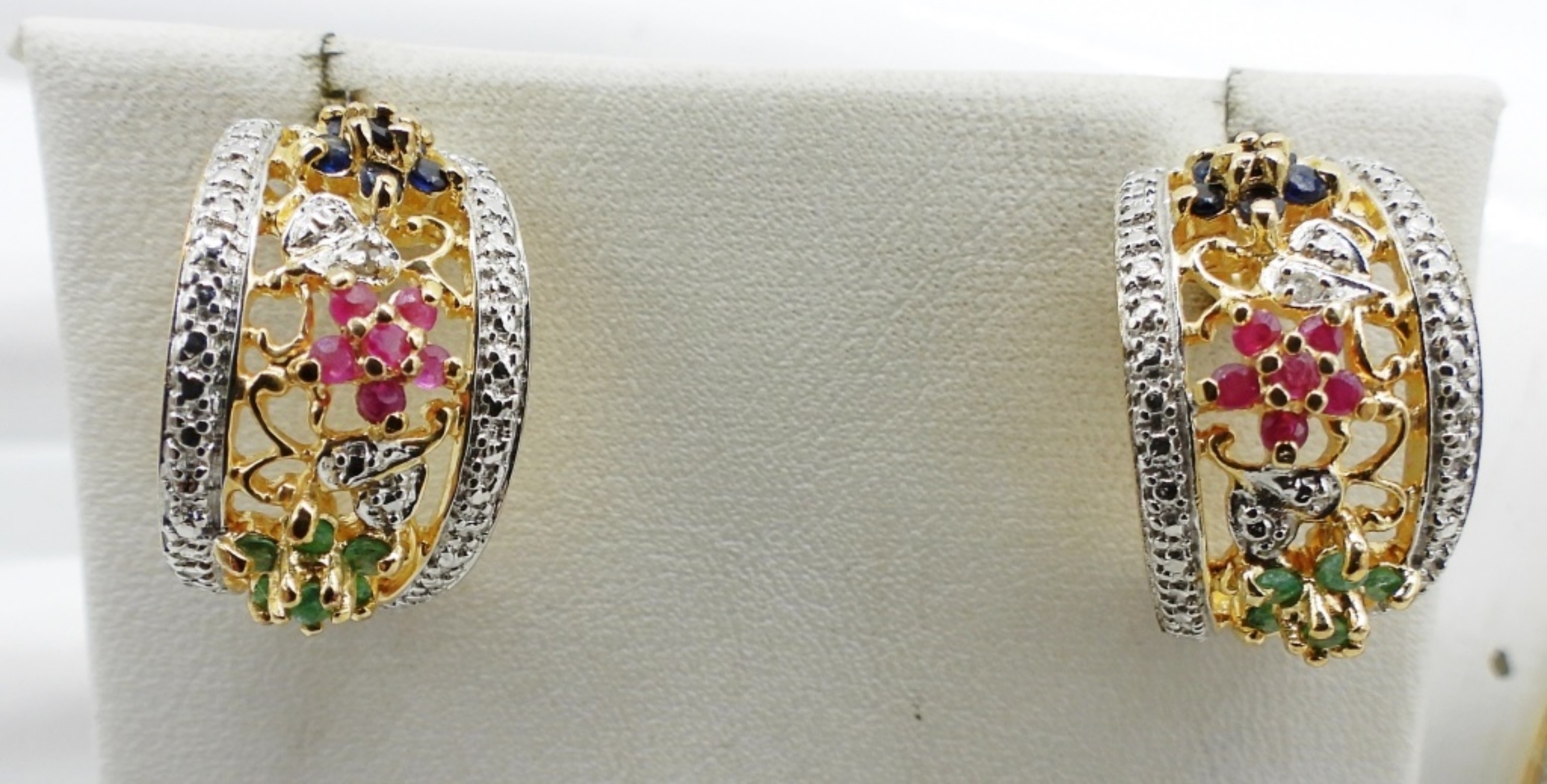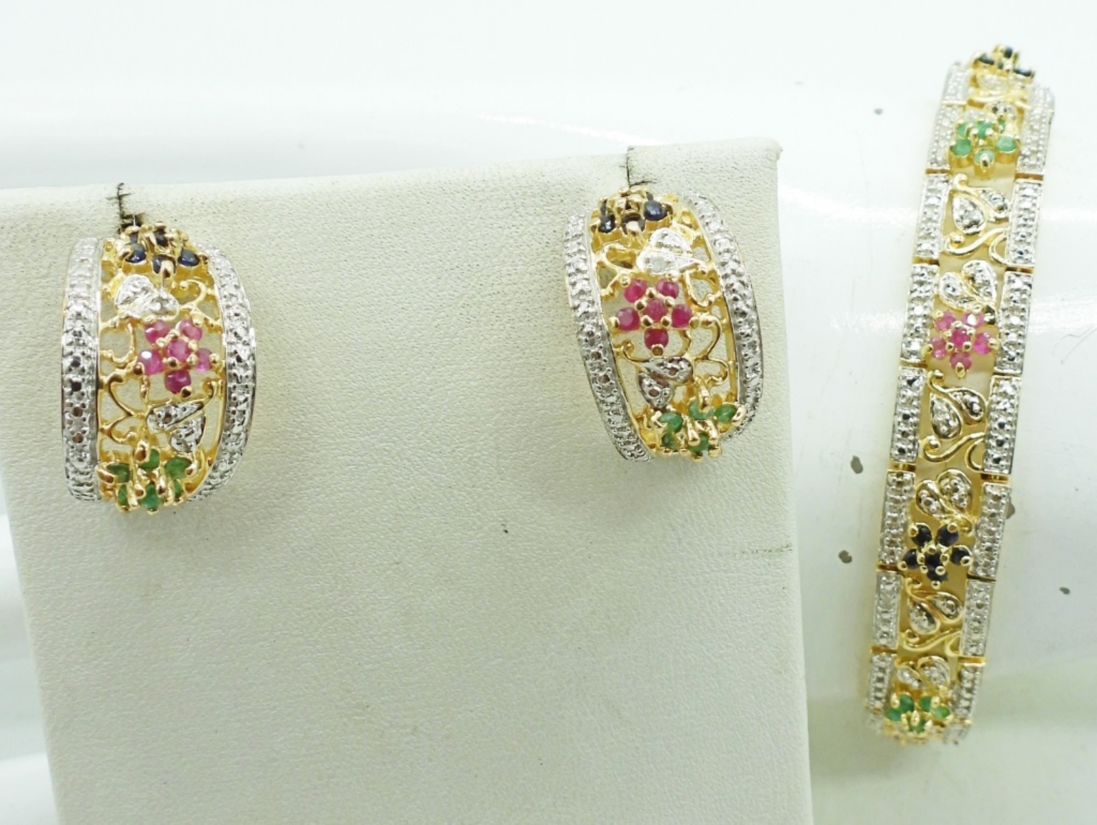 STERLING GOLD TONE. RUBIES, SAPPHIRE, EMERALDS. BRACELET IS 7.5″, WORKING CLASP. A FEW LINKS SLIGHTLY CROOKED (SEE PHOTOS). MATCHING PAIR OF PIERCED EARRINGS. (18.1 DWT)