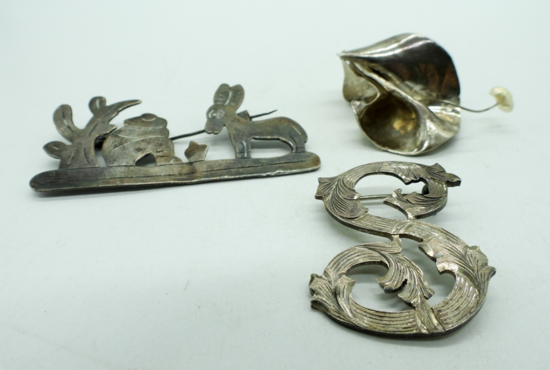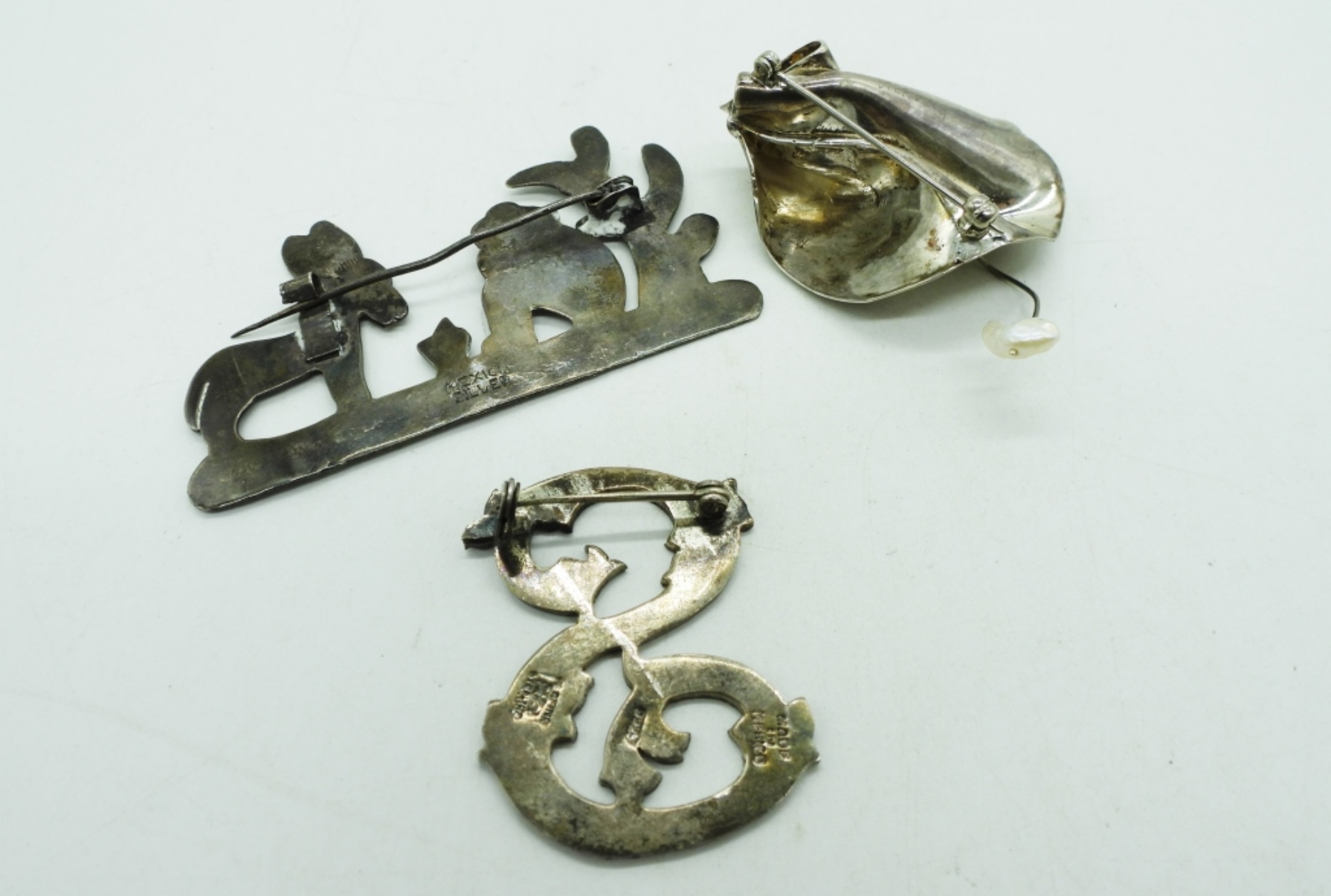 THREE STERLING BROOCHES. TWO ARE MADE IN MEXICO. 2-3″. (21.8 DWT)