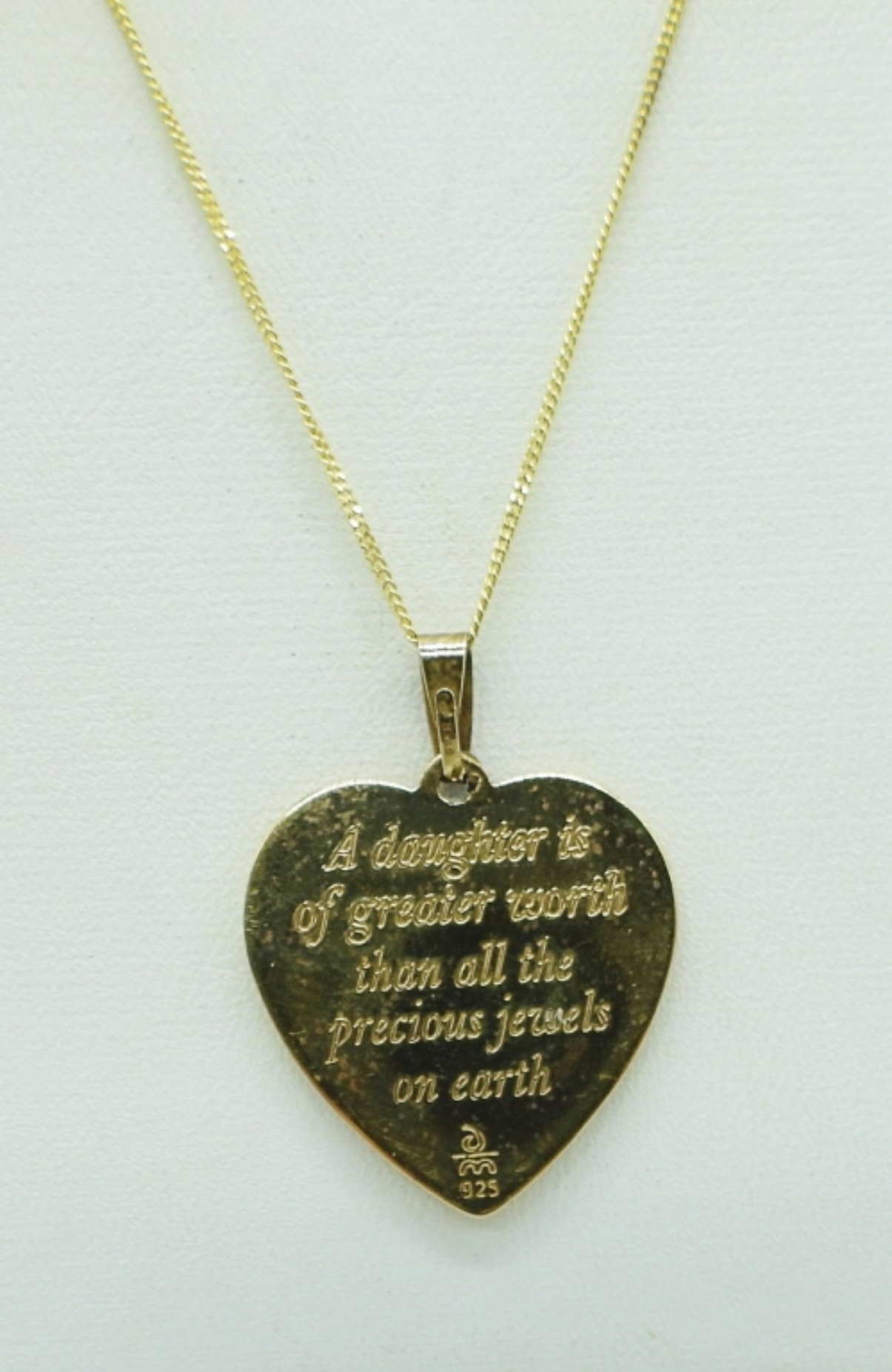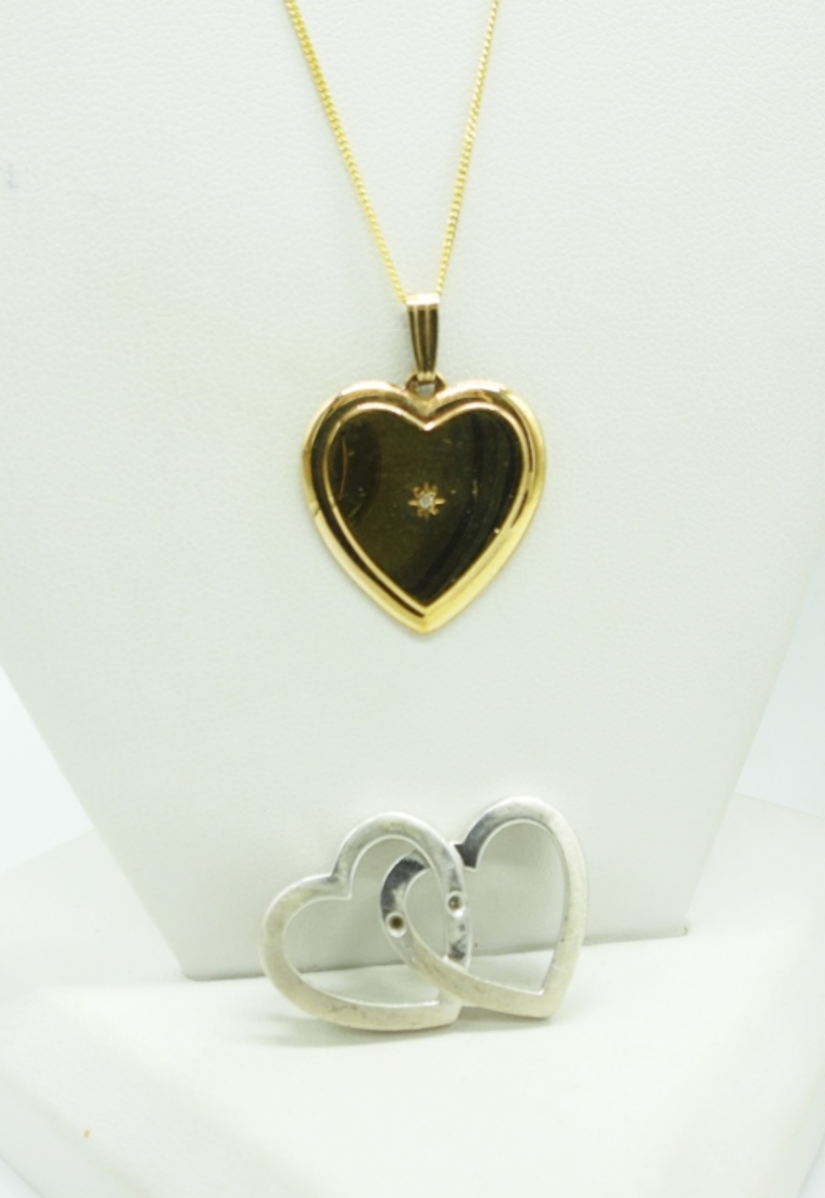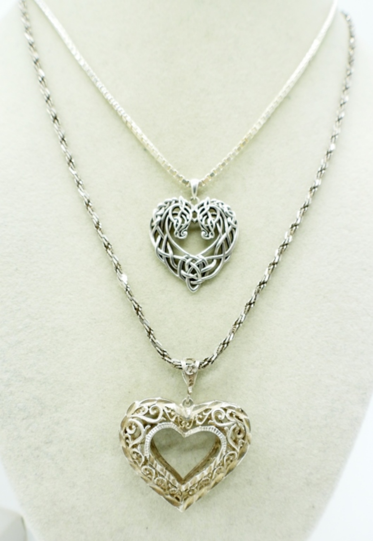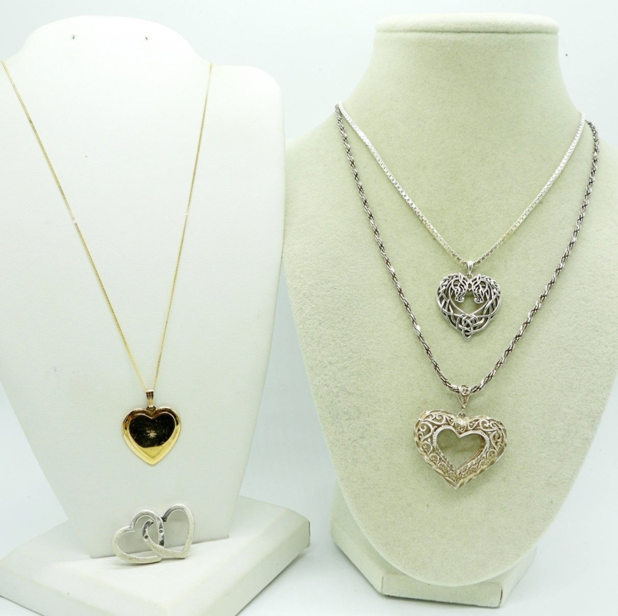 FOUR STERLING GOLD AND SILVER TONE HEART SHAPED PENDANTS. THREE CHAINS, 20, 22, 26″. (22 DWT)