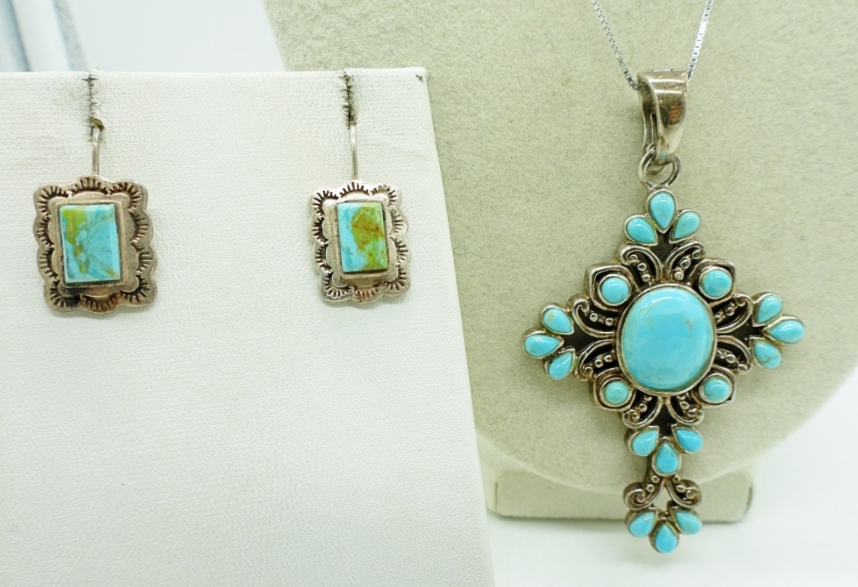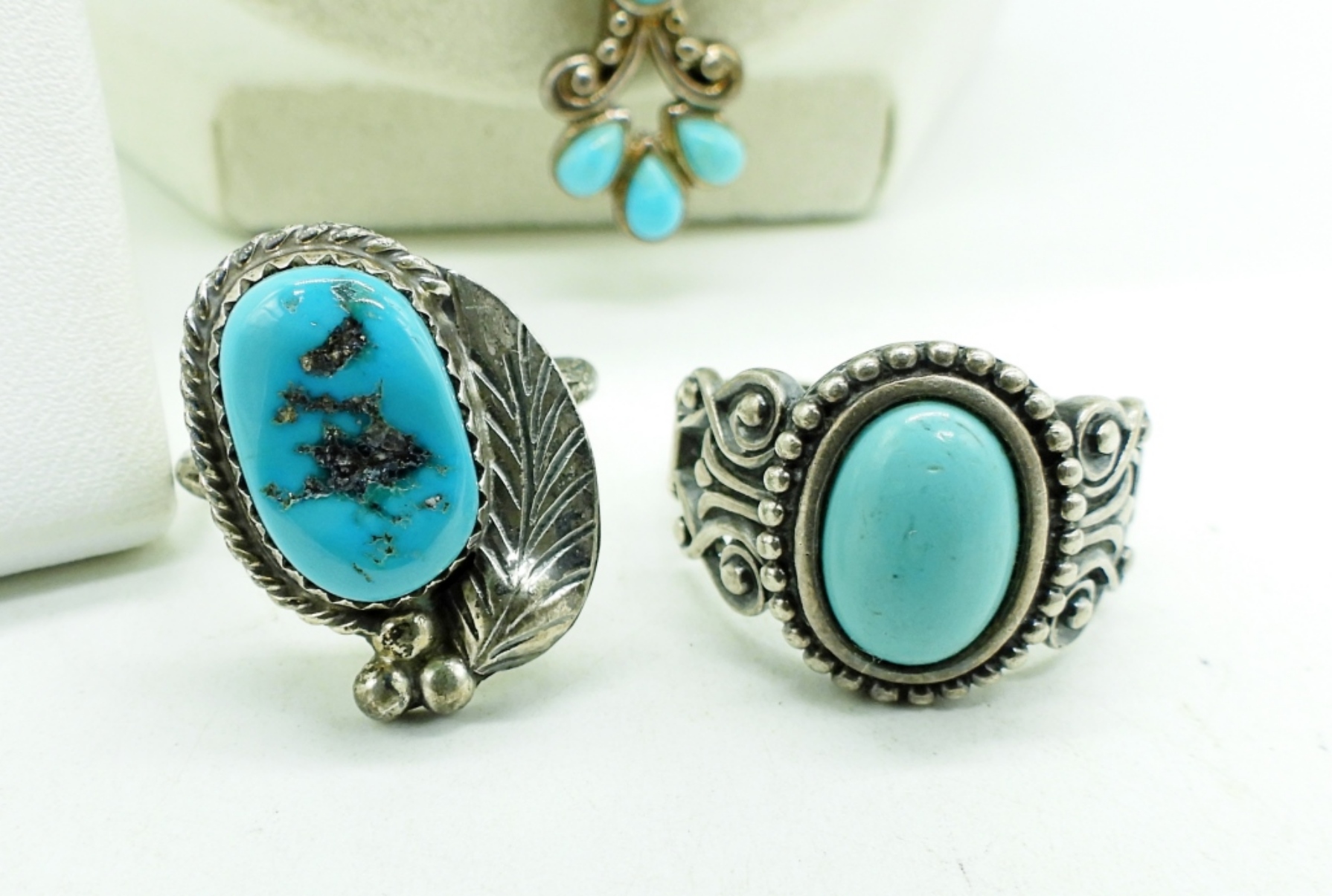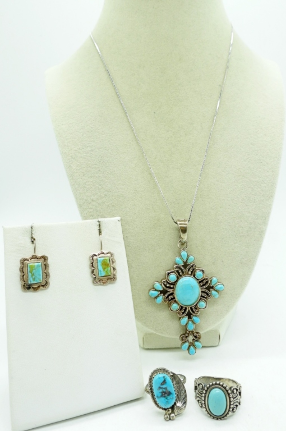 NECKLACE, 20″. TWO STERLING RINGS, SIZE 8 & 9. ONE PAIR VINTAGE PIERCED TURQUOISE 925 EARRINGS. (21 DWT)