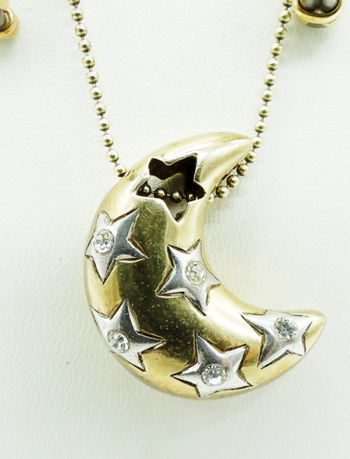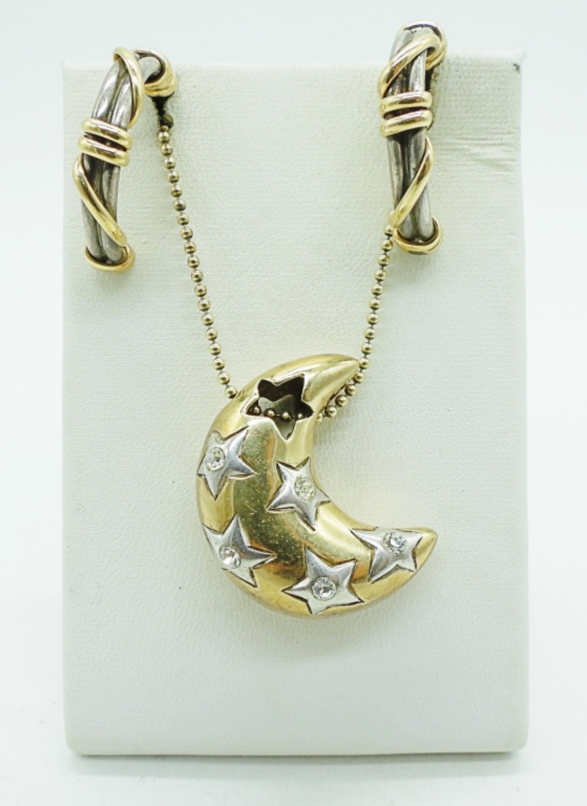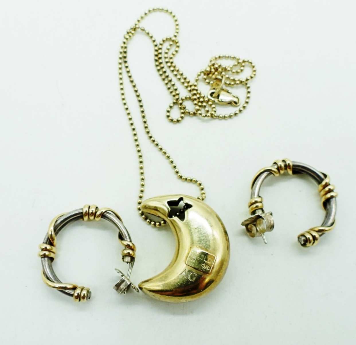 STERLING SILVER AND GOLD TONE MOON & STARS PENDANT ON A STERLING 22″ CHAIN. PRETTY HOOP PIERCED EARRINGS, STERLING WITH GOLD TONE ACCENTS. EARRINGS ARE 1″. (17.4 DWT)
