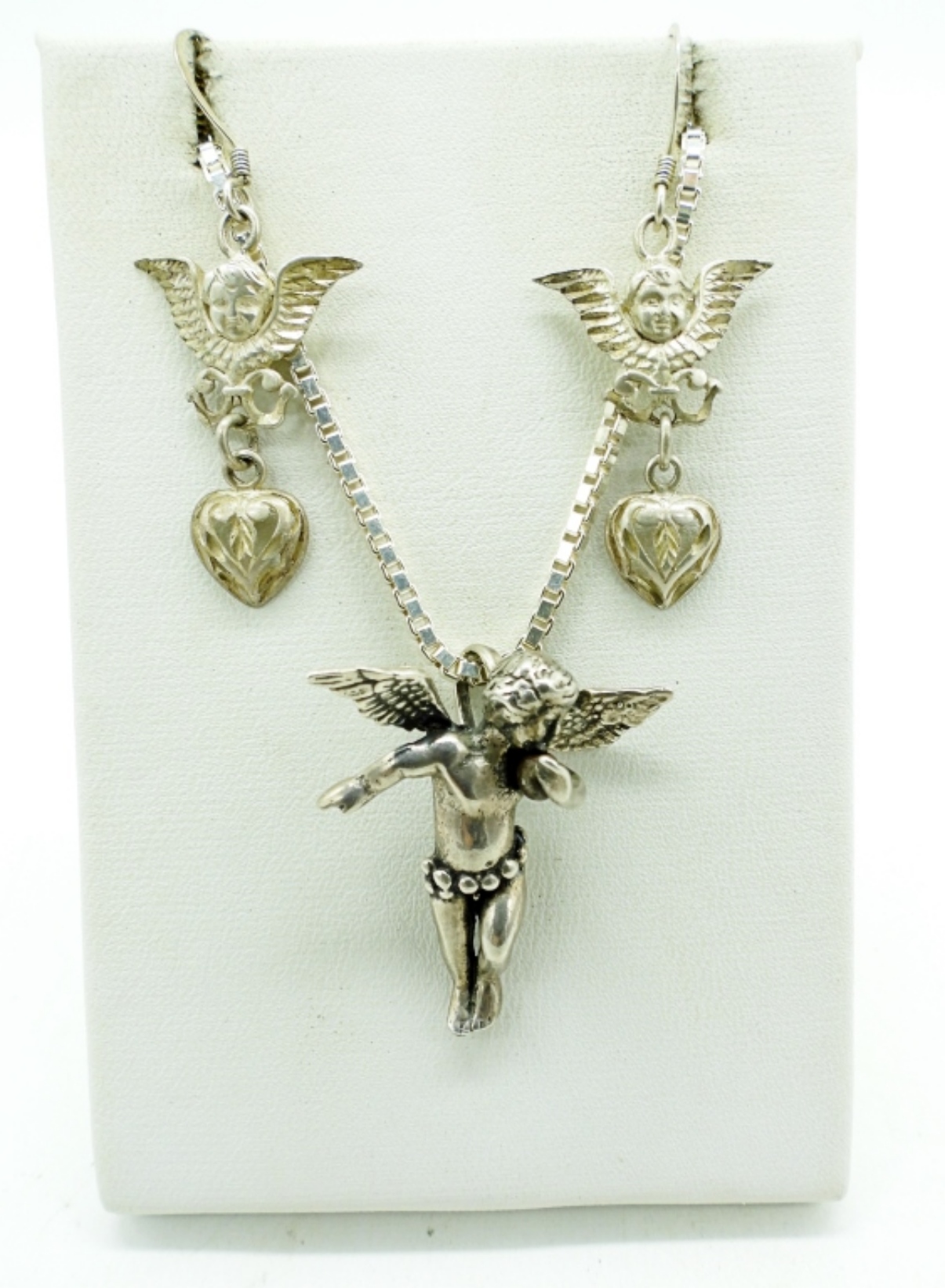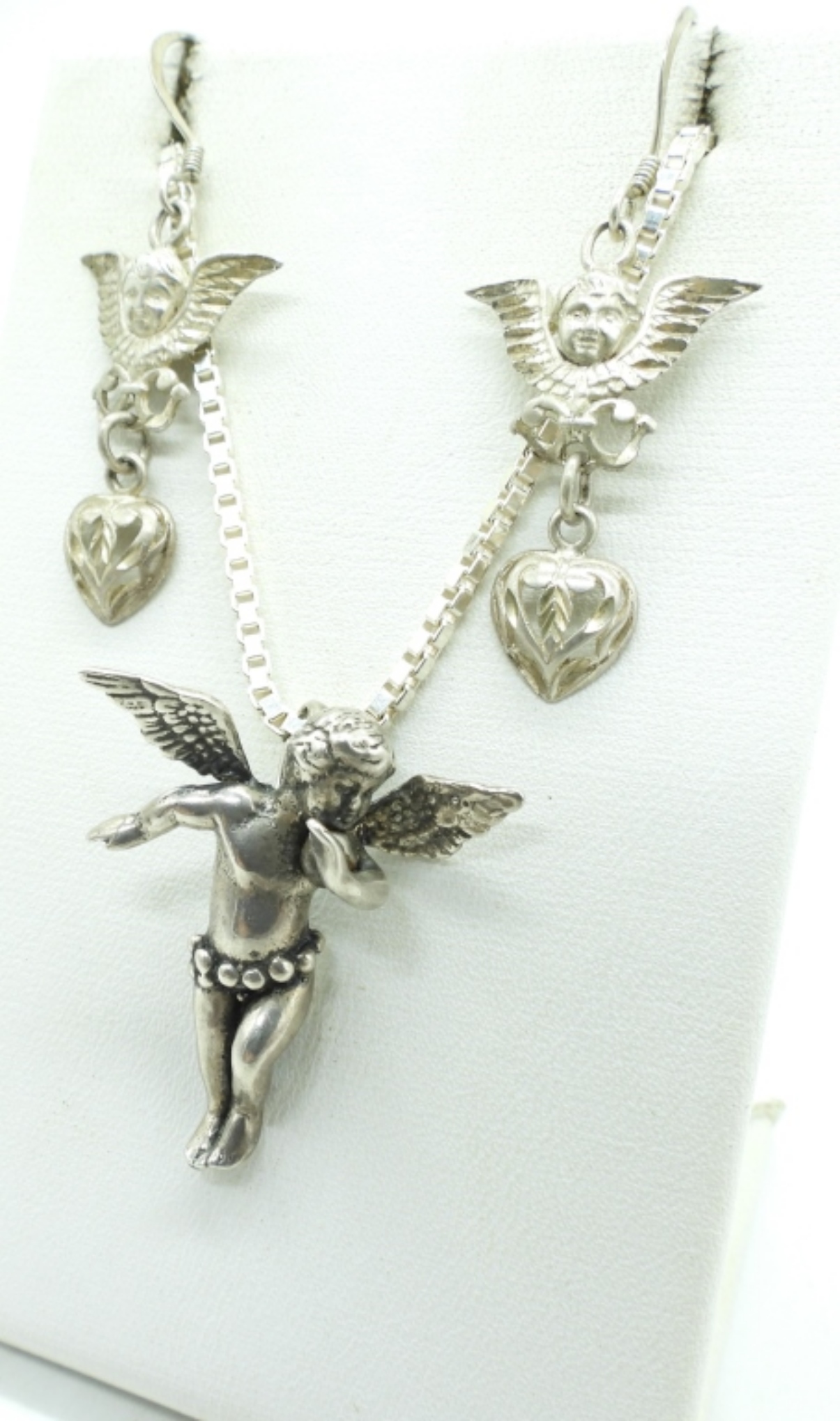 STERLING CHERUB PENDANT ON A 20″ BOX CHAIN. CHERUB HEART PIERCED DROP EARRINGS. (9.8 DWT)