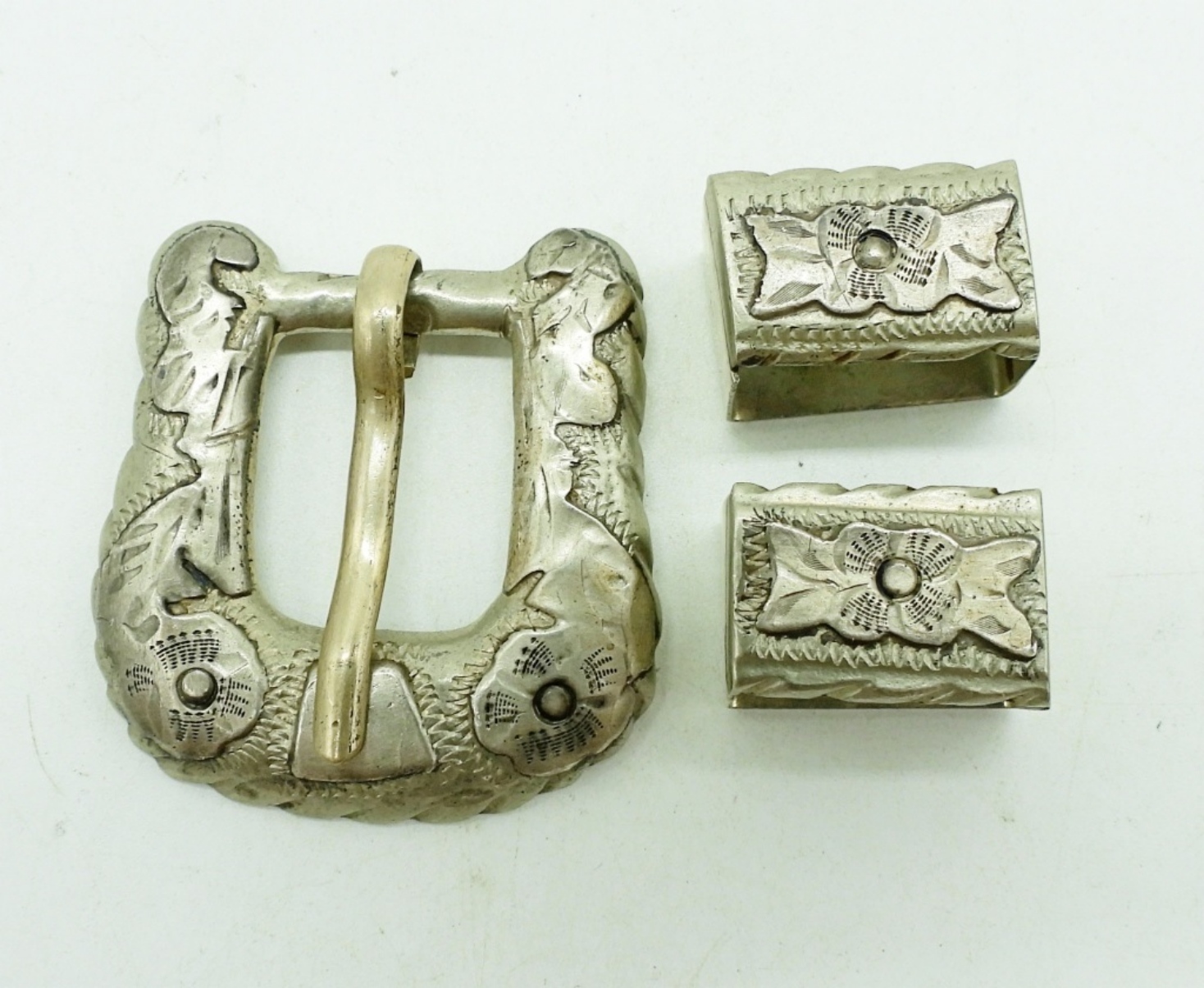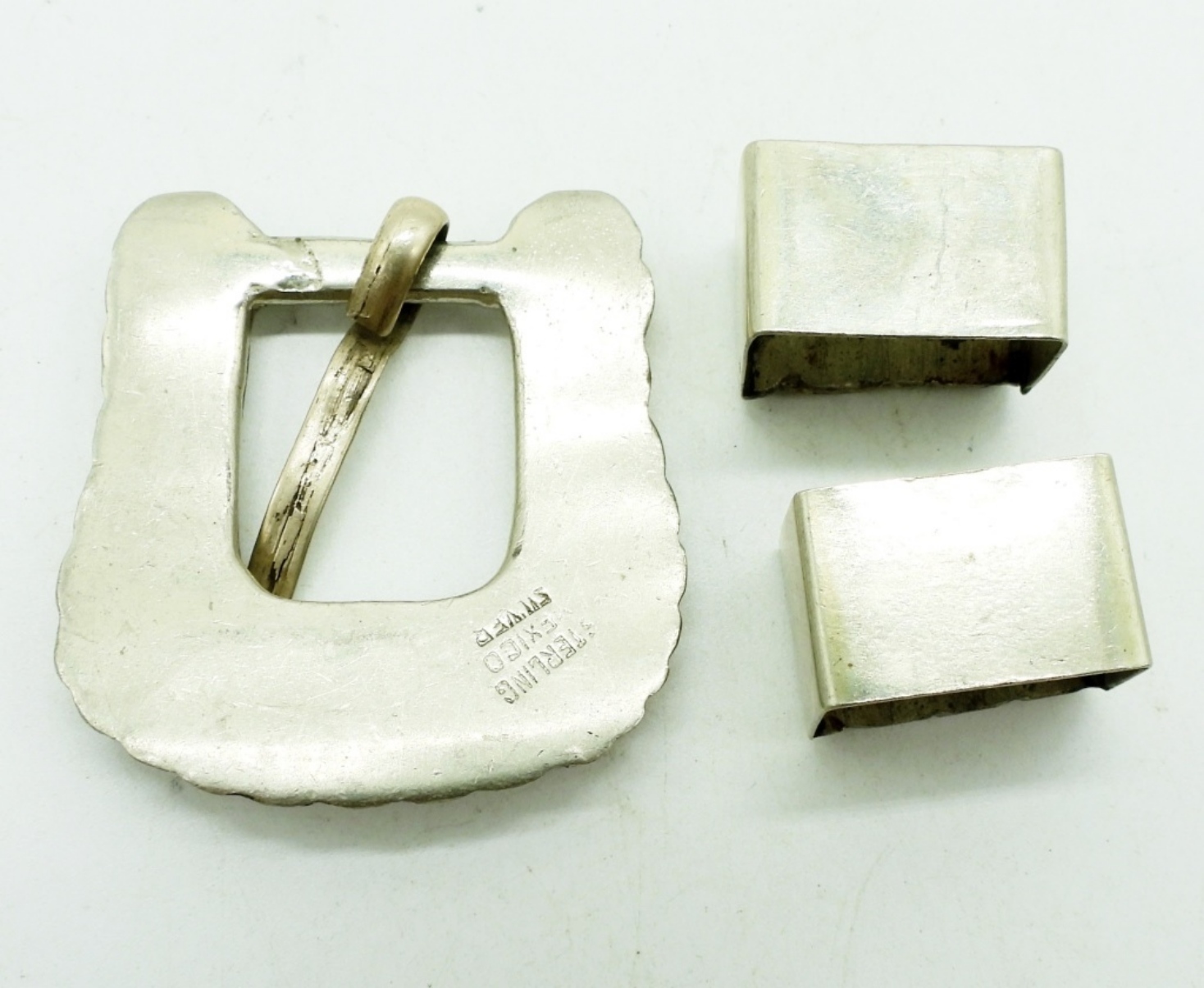 VINTAGE STERLING BELT BUCKLE WITH TWO OTHER PIECES. MARKED “STERLING MEXICO SILVER” (25.8 DWT)