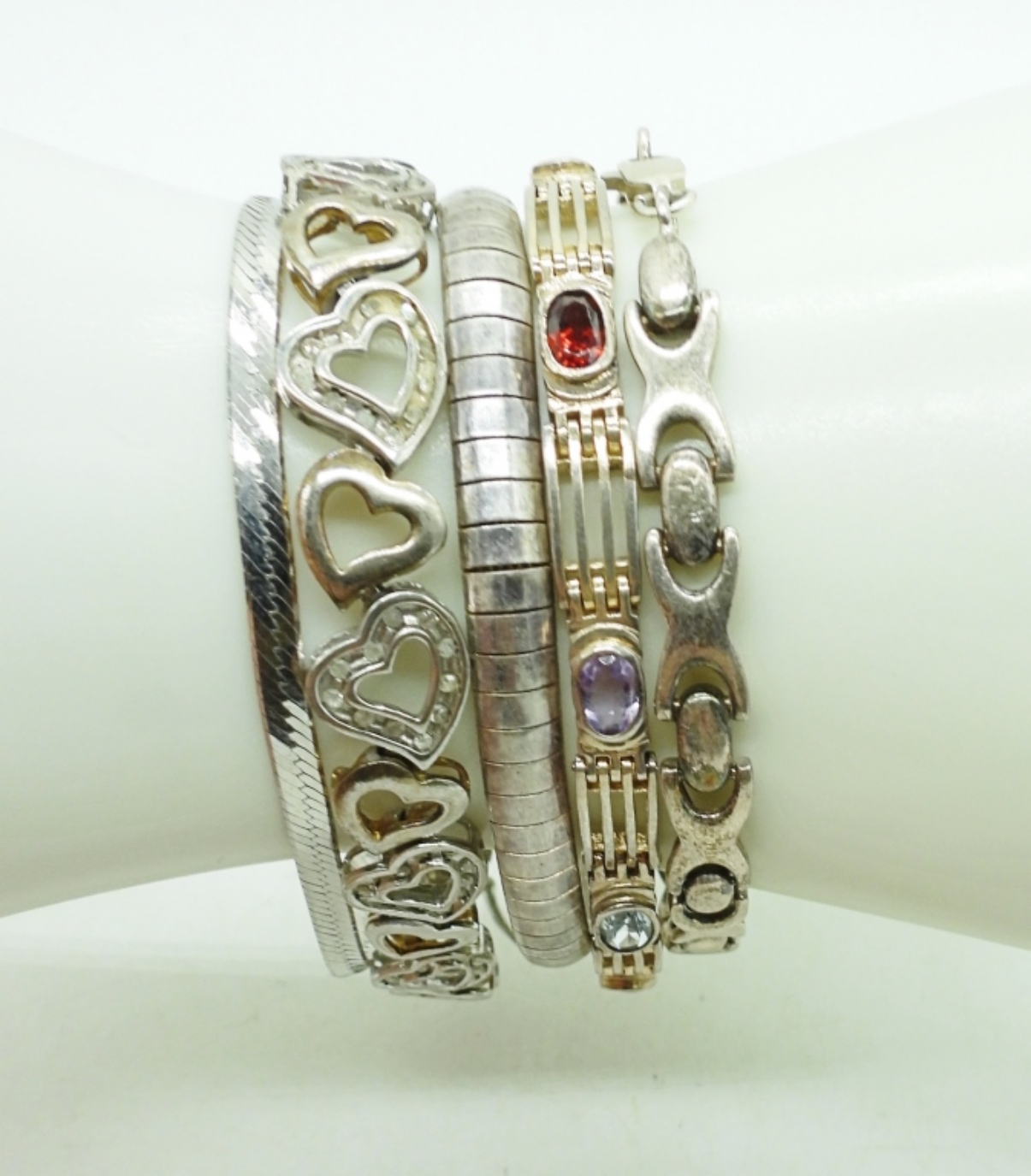 FIVE STERLING FASHION BRACELETS, 7″ – 7.5″. HEART BRACELET IS HARD TO UNCLASP. (36 DWT)