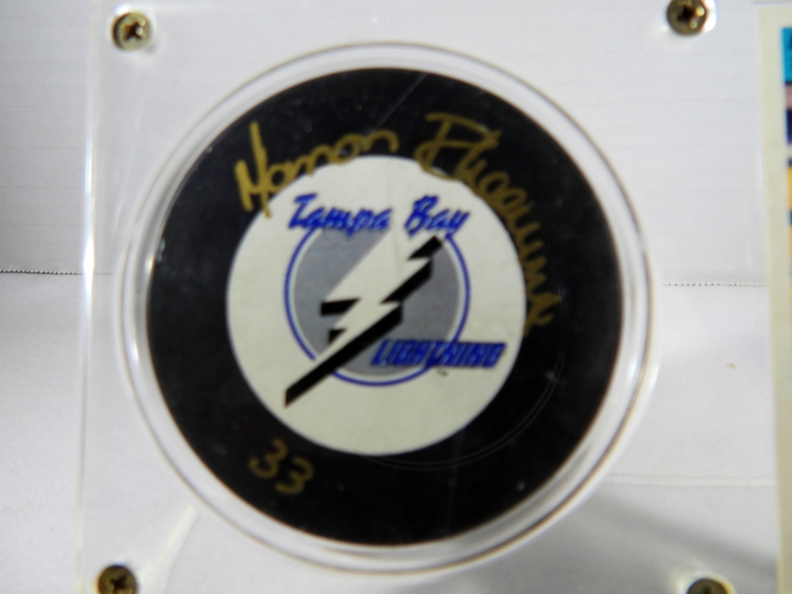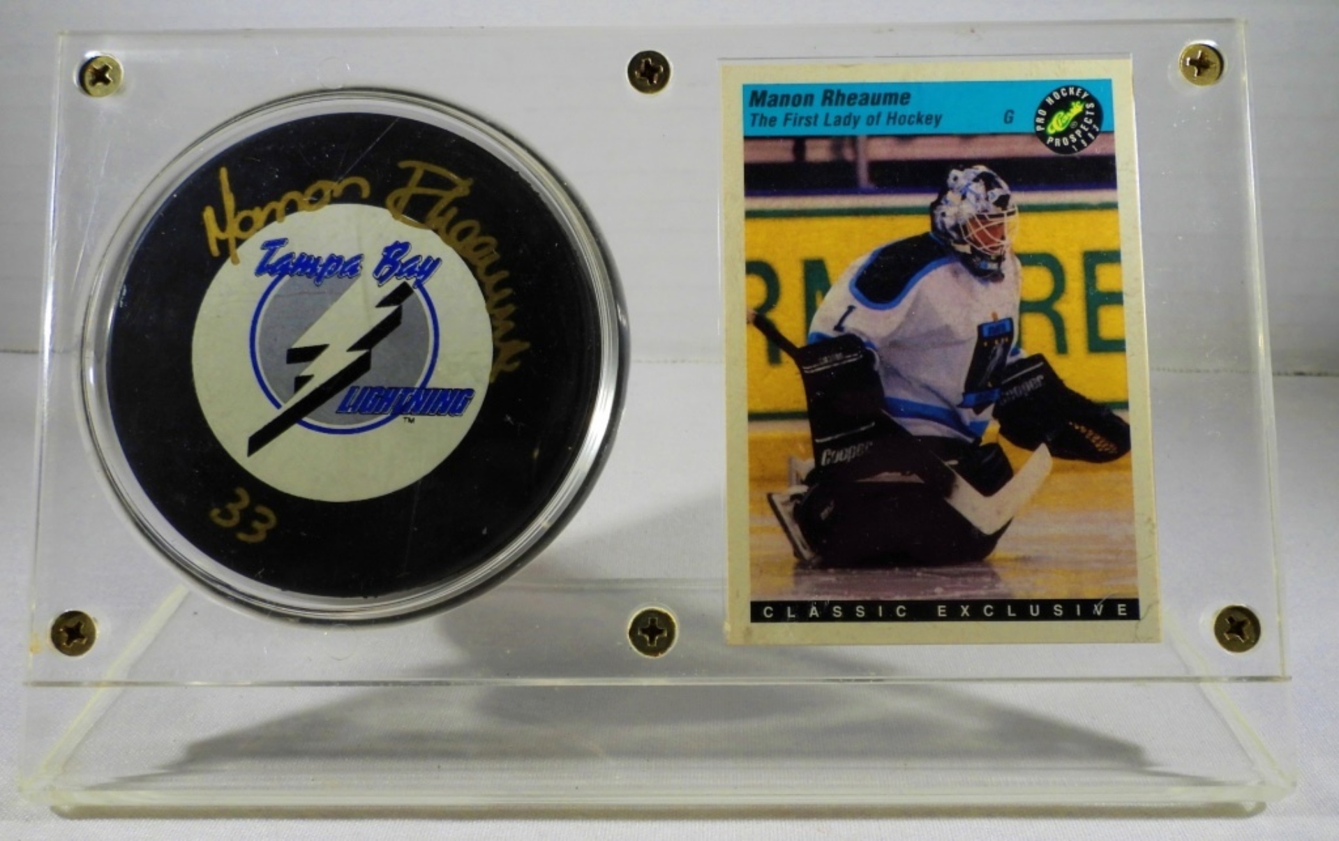MANON RHEAUME AUTOGRAPHED HOKCEY PUCK WITH 1993 TRADING CARD (CARD NOT SIGNED). NO COA / UNVERIFIED. COMES IN A VERY NICE PLASTIC STAND.