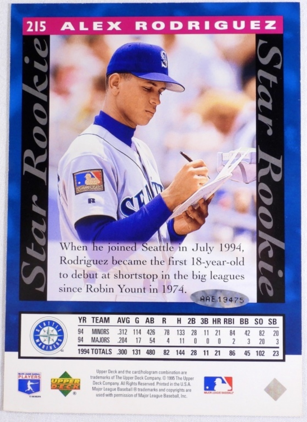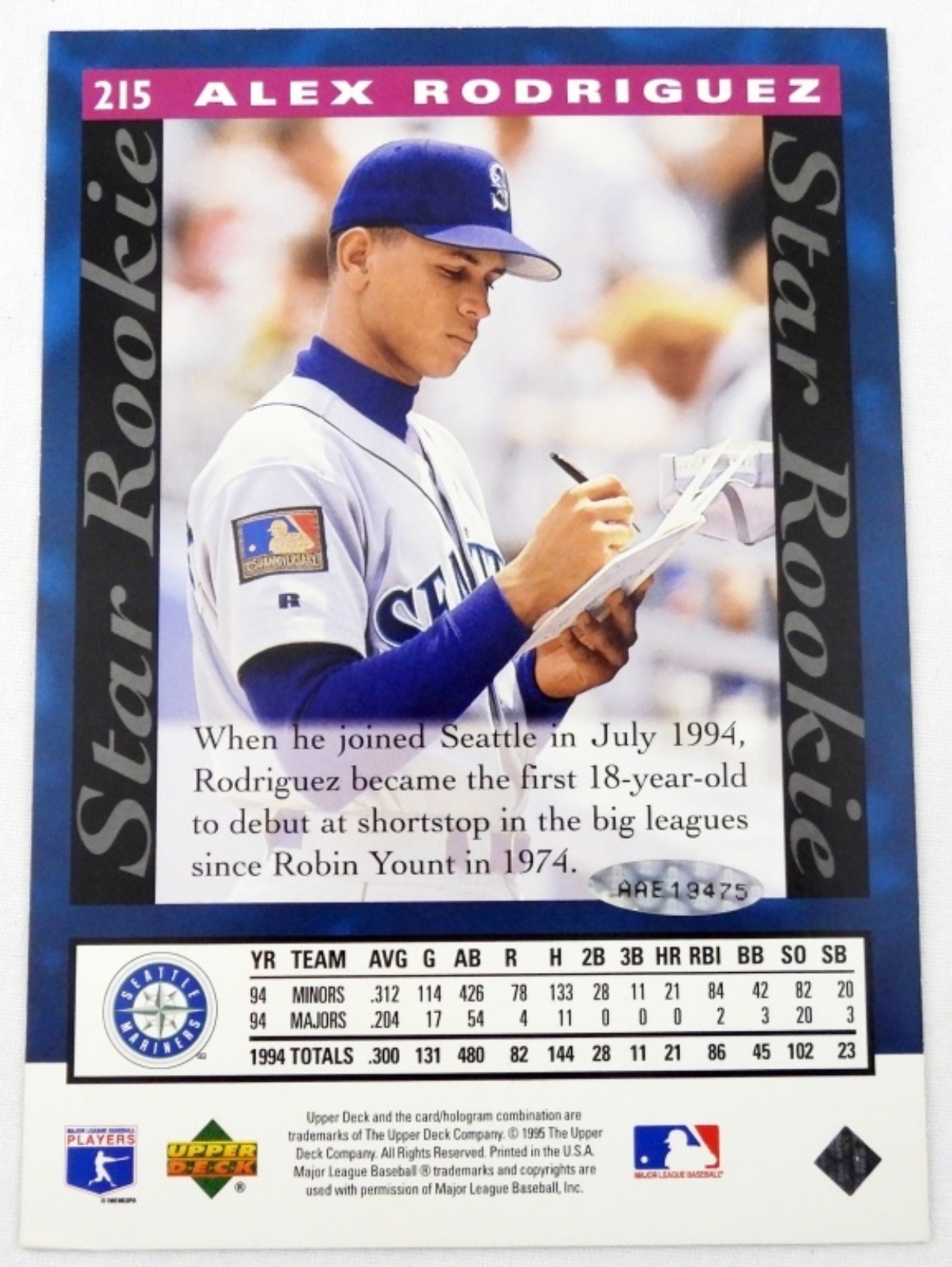 ALEX RODRIGUEZ AUTOGRAPHED UPPER DECK 1995 JUMBO STAR ROOKIE #215- COA NOT VERIFIED.