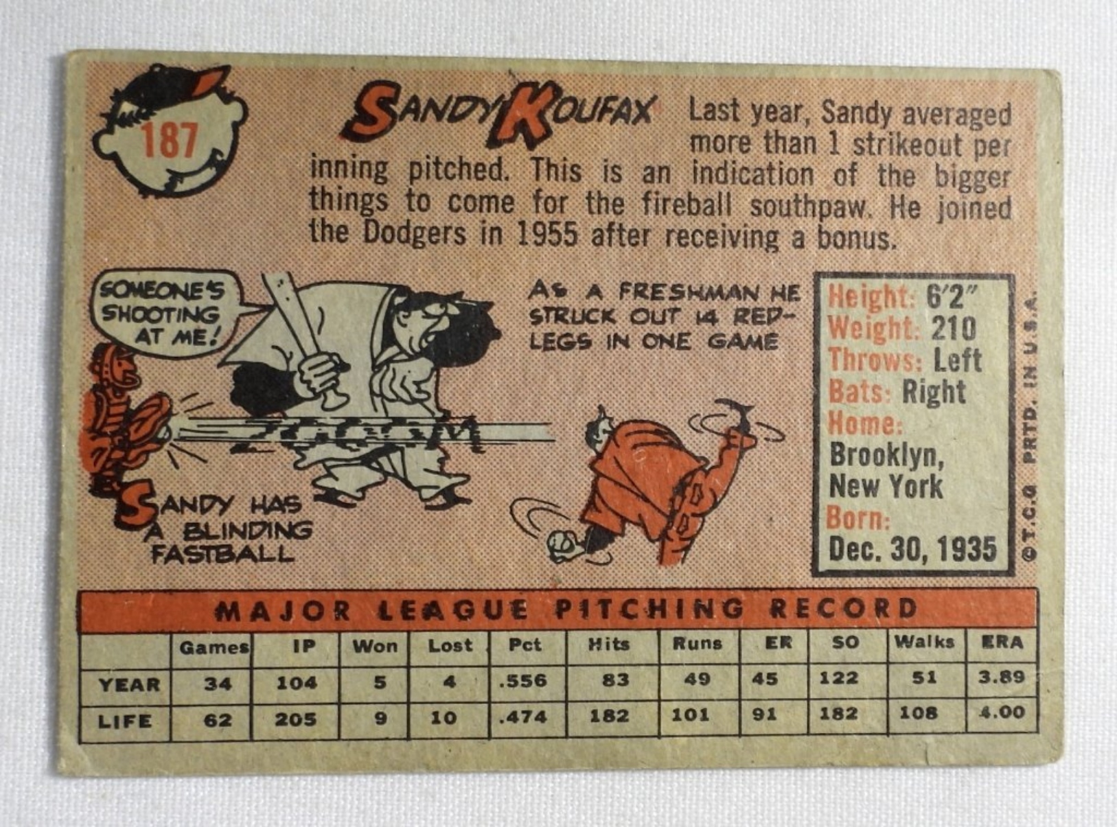 1958 LA DOGERS SANDY KOUFAX CARD BENT BOTTOM RIGH CORRNER