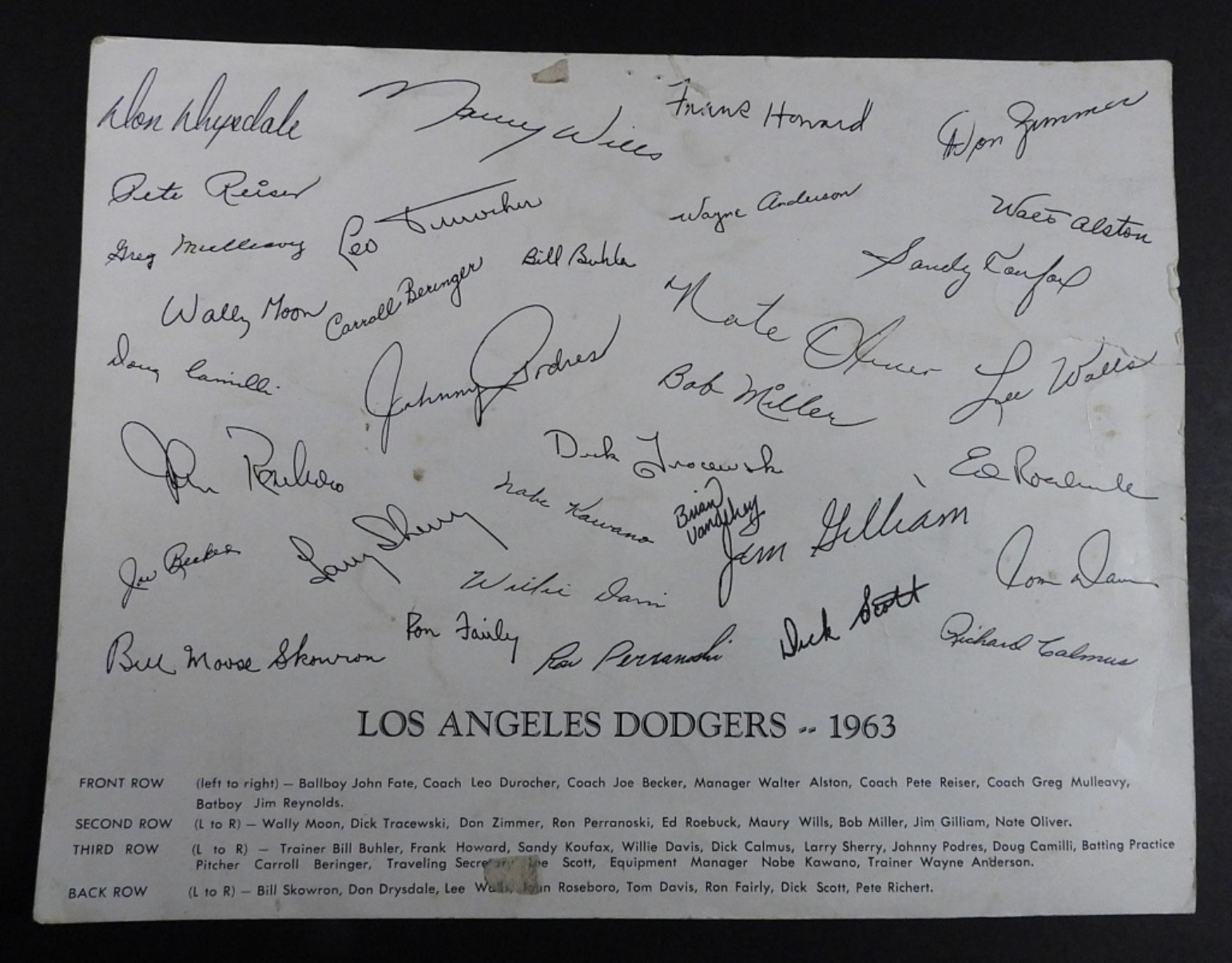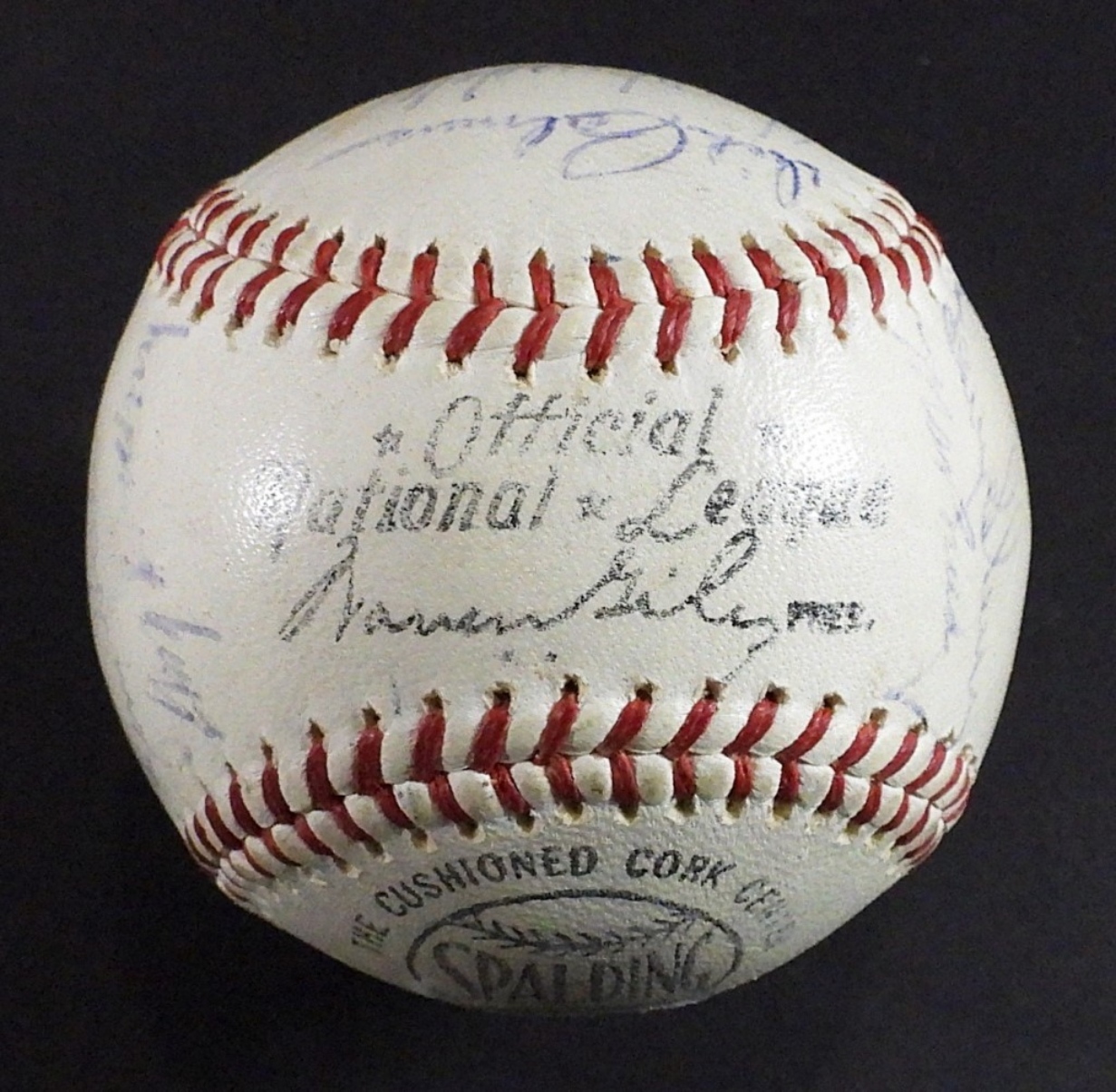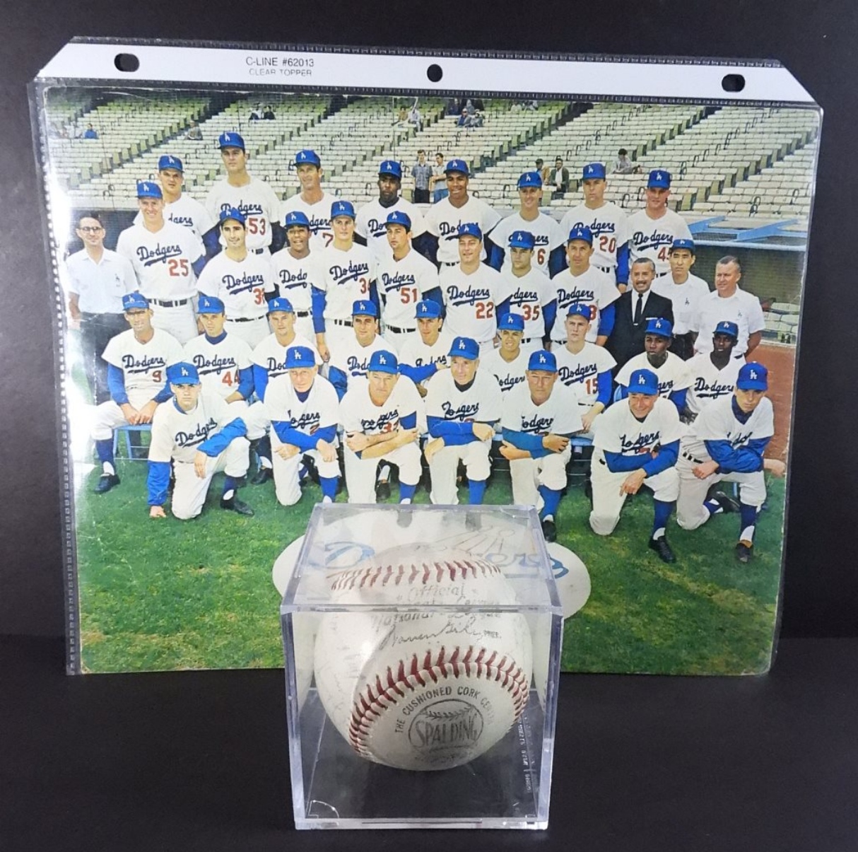 (27) SIGNATURES – SANDY KOUFAX, WALT ALSTON, DON DRYSDALE, MAURY WILLS & MORE – NO COA / UNVERIFIED on NATIONAL LEAGUE BALL with TEAM PHOTO
