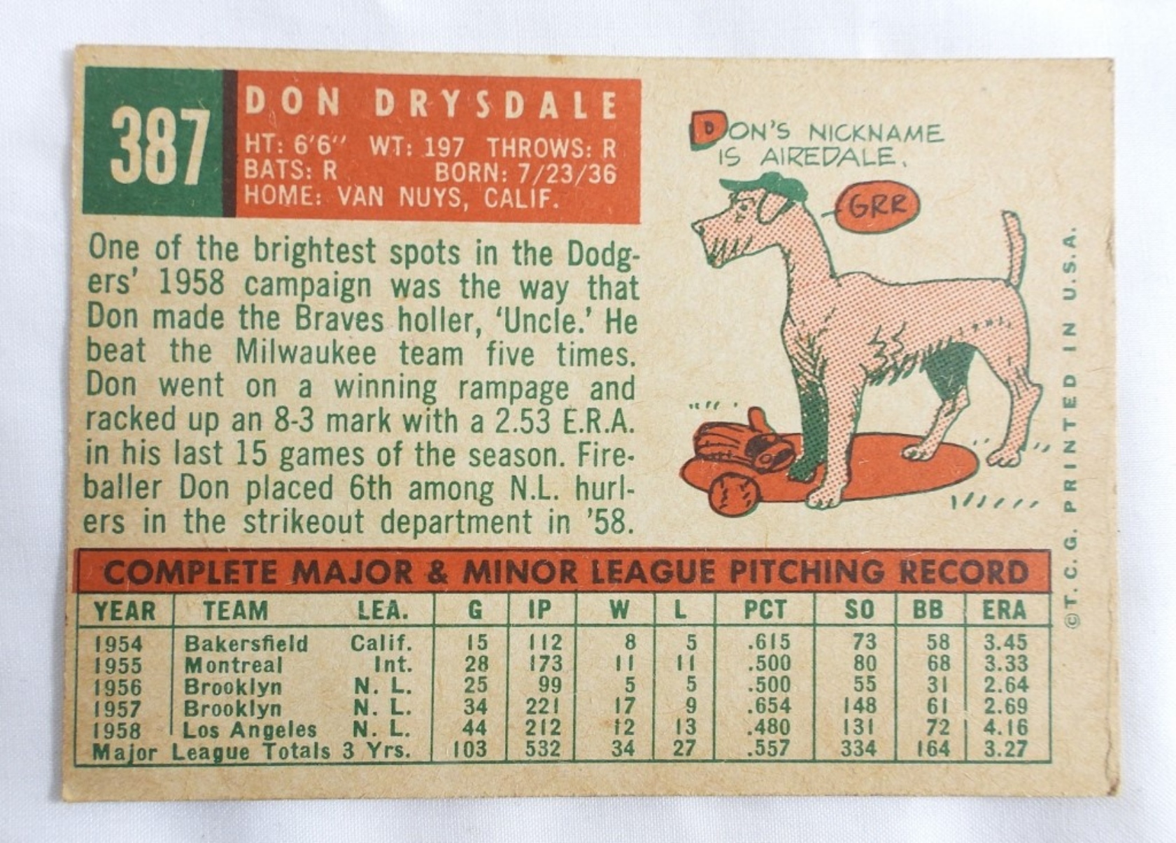 DON DRYSDALE 1959 TOPPS BASEBALL CARD, NM CONDITION.