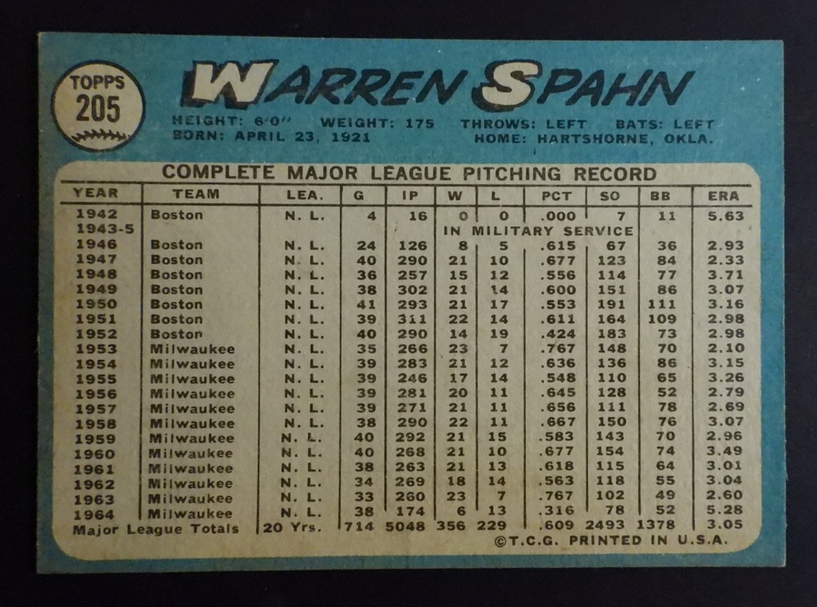 WARREN SPAHN 1965 HoF TOPPS BASEBALL CARD. NM/M CONDITION.
