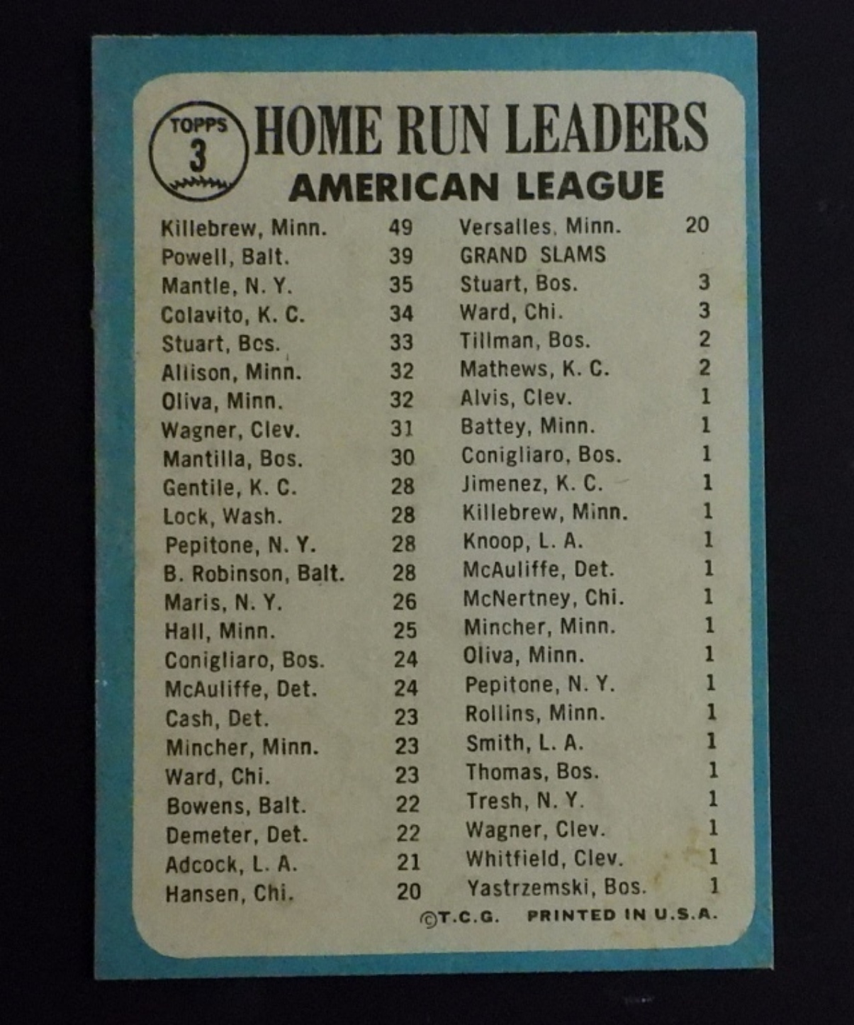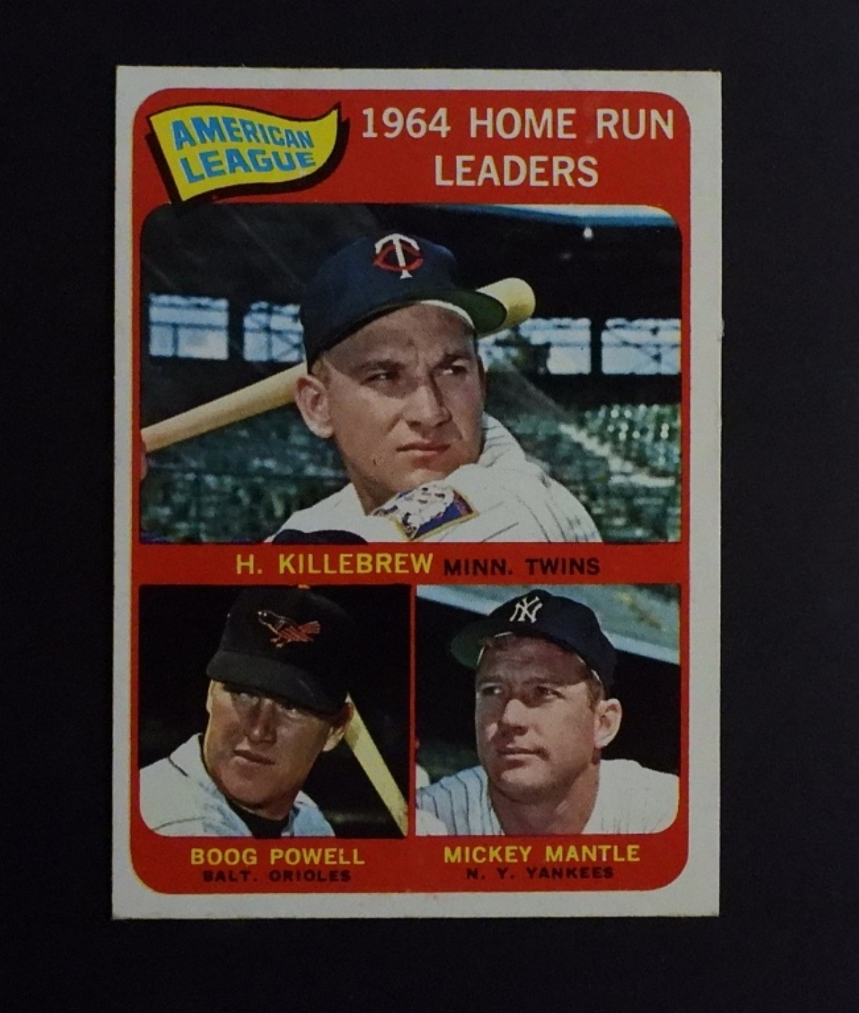 1964 HOME RUN LEADERS TOPPS BASEBALL CARD. FEATURING KILLEBREW, POWELL & MANTLE. ONE LIGHT CREASE IN UPPER LEFT CORNER. GREAT CORNERS! VG DUE TO CREASE.