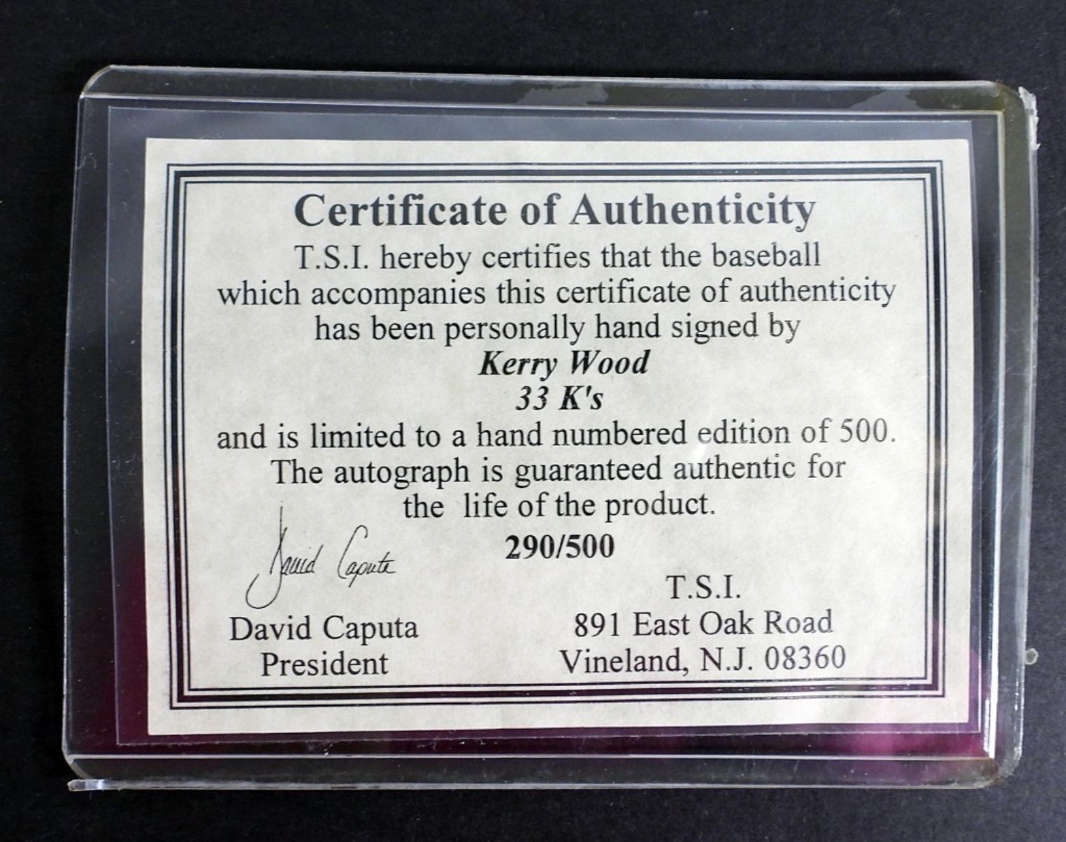 KERRY WOOD AUTO SIGNED ON A OFFICIAL NATIONAL LEAGUE BASEBALL, COA FROM T.S.I 290/500 IS UNVERIFIED