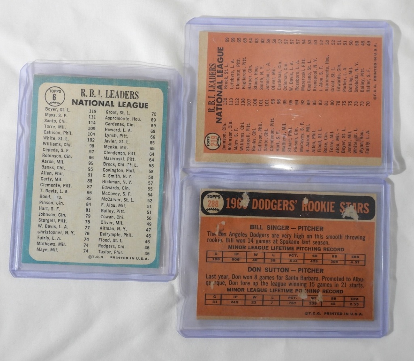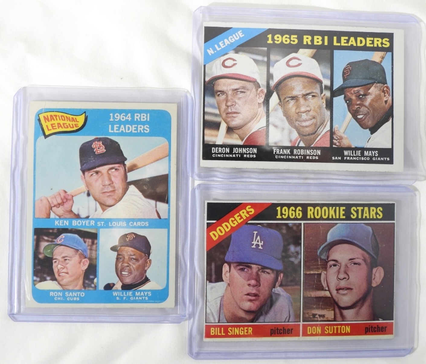 1966 TOPPS DODGERS ROOKIE STARS – BILL SINGER & DON SUTTON – GOOD. 1965 TOPPS N. LEAGUE RBI LEADERS – JOHNSON, ROBINSON & WILLIE MAYS – NM. 1964 TOPPS NATIONAL LEAGUE RBI LEADERS – BOYER, SANTO & WILLIE MAYS – VG.
