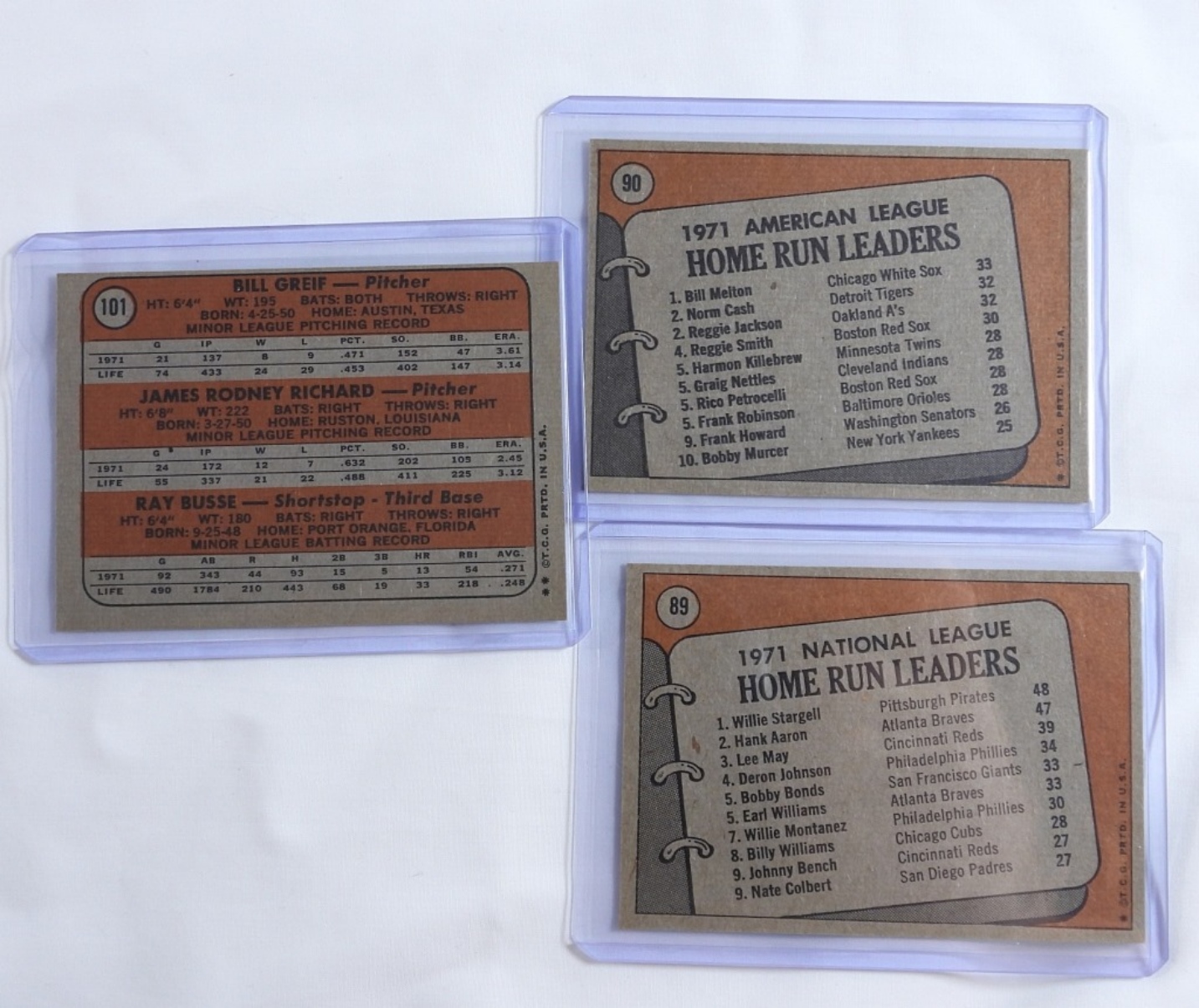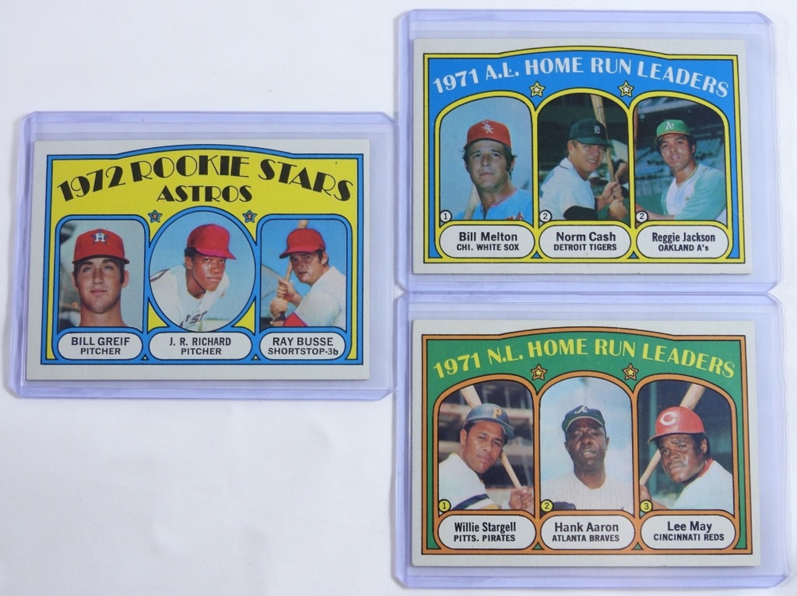 THREE VINTAGE TOPPS CARDS. 1971 A.L. HOME RUN LEADERS – MELTON, CASH, JACKSON – NM/M. 1971 N.L. HOME RUN LEADERS – STARGELL, AARON, MAY – NM/M. 1972 ROOKIE STARS ASTROS – GREIF, RICHARD, BUSSE – NM/M.