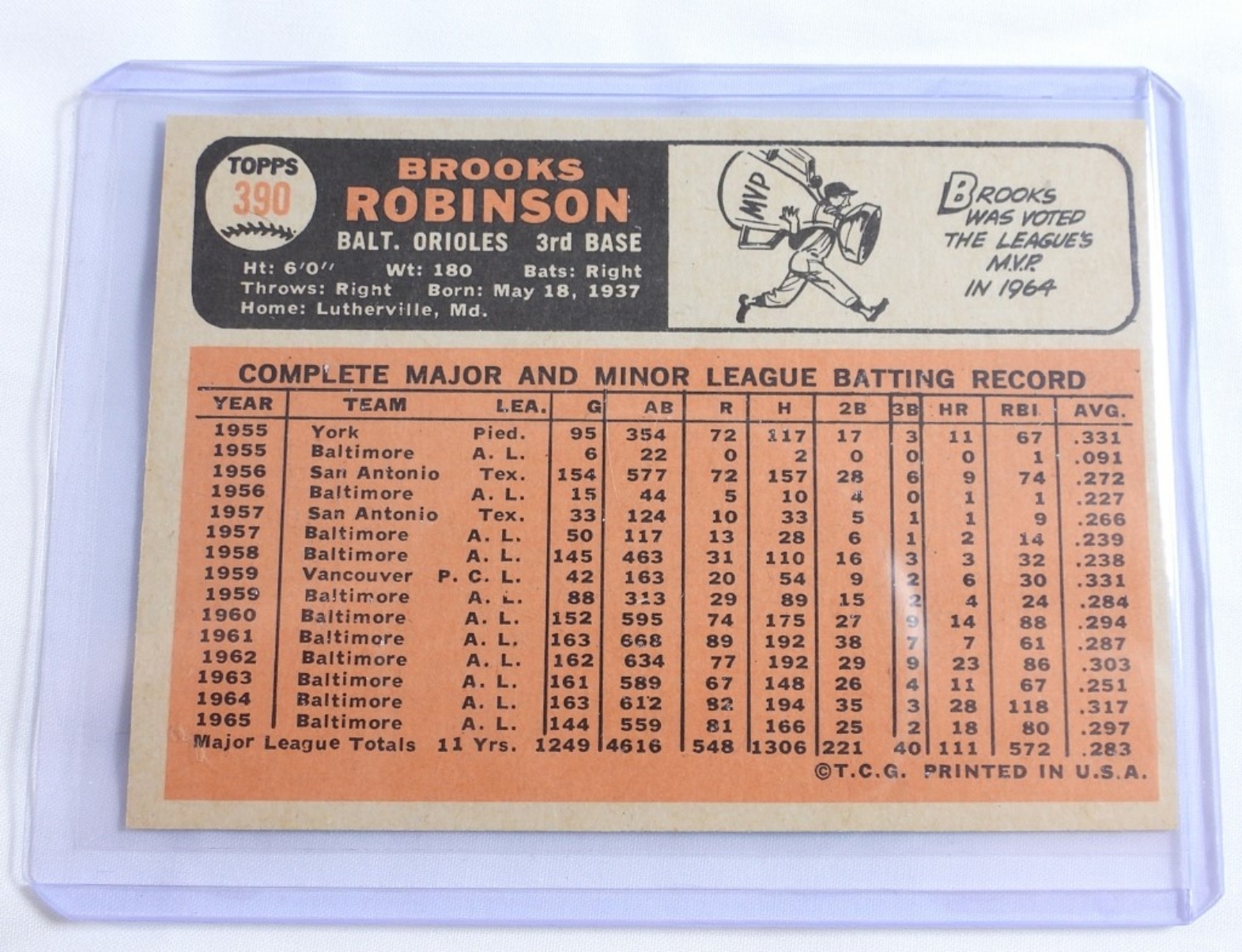 1966 TOPPS BASEBALL CARD # 390 OF BROOKS ROBINSON – NM