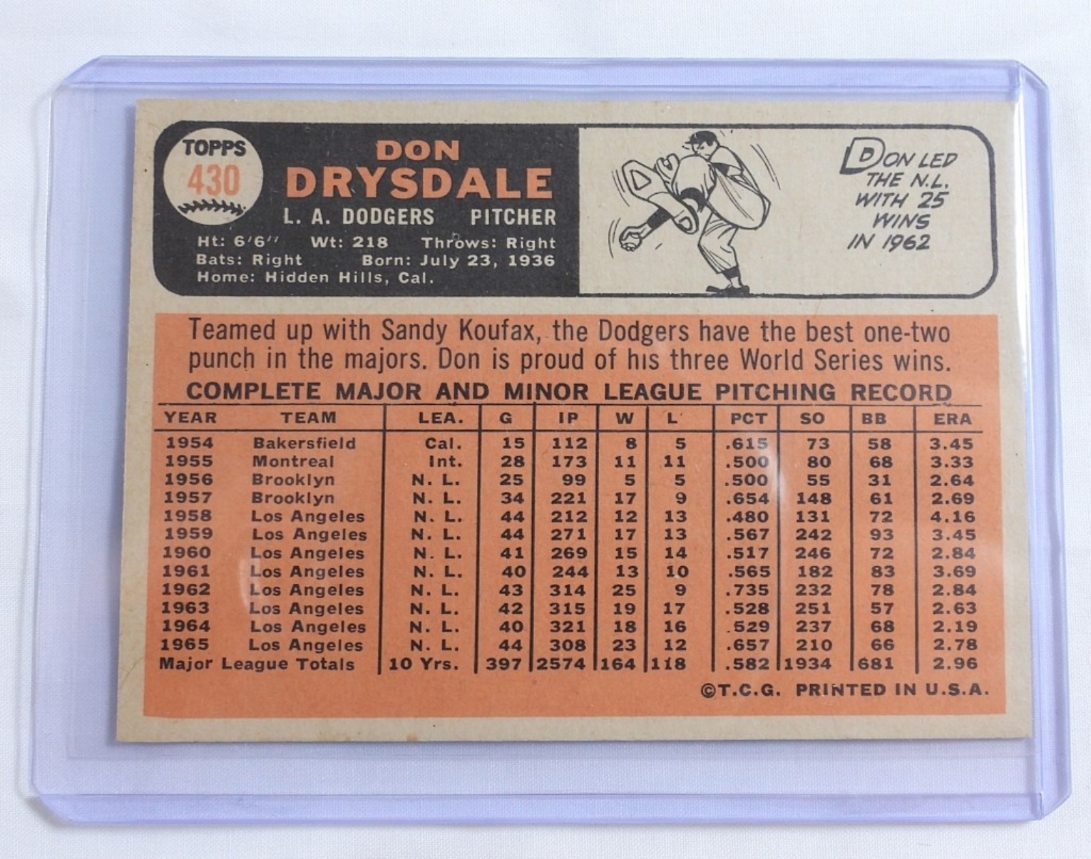 1966 TOPPS #430 BASEBALL CARD. DON DRYSDALE – NM