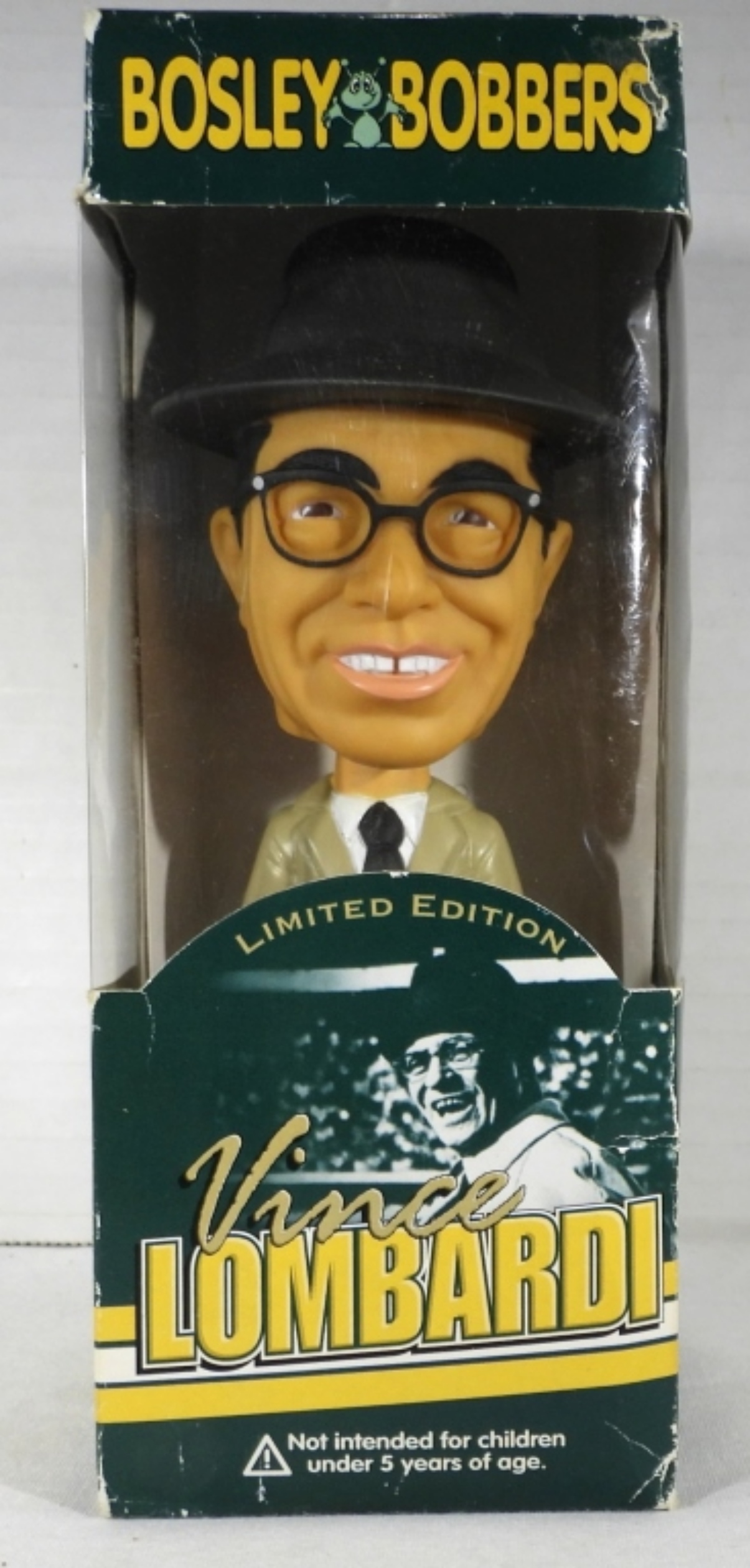 VINCE LOMBARDI BOBBLEHEAD-OPEN BOX- SHOWS WEAR, GREEN BAY PACKERS 1965 NFL CHAMP. FOLDED