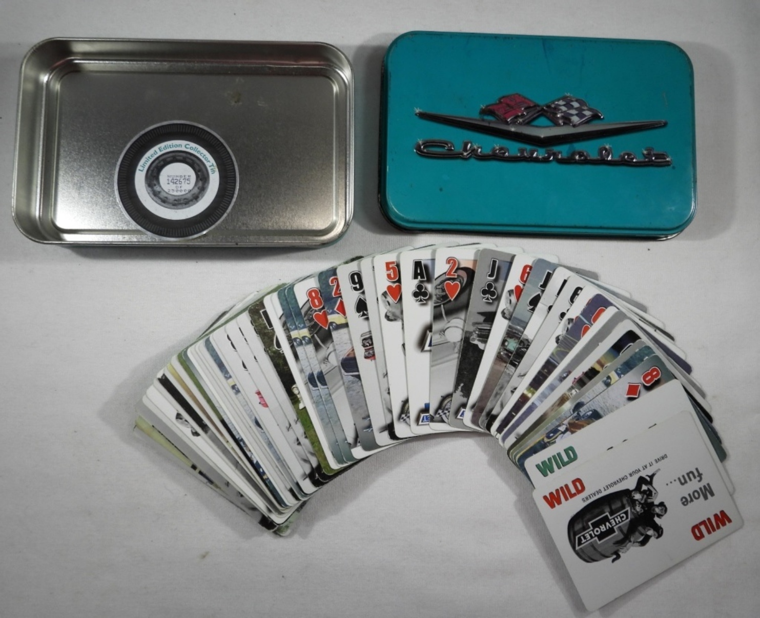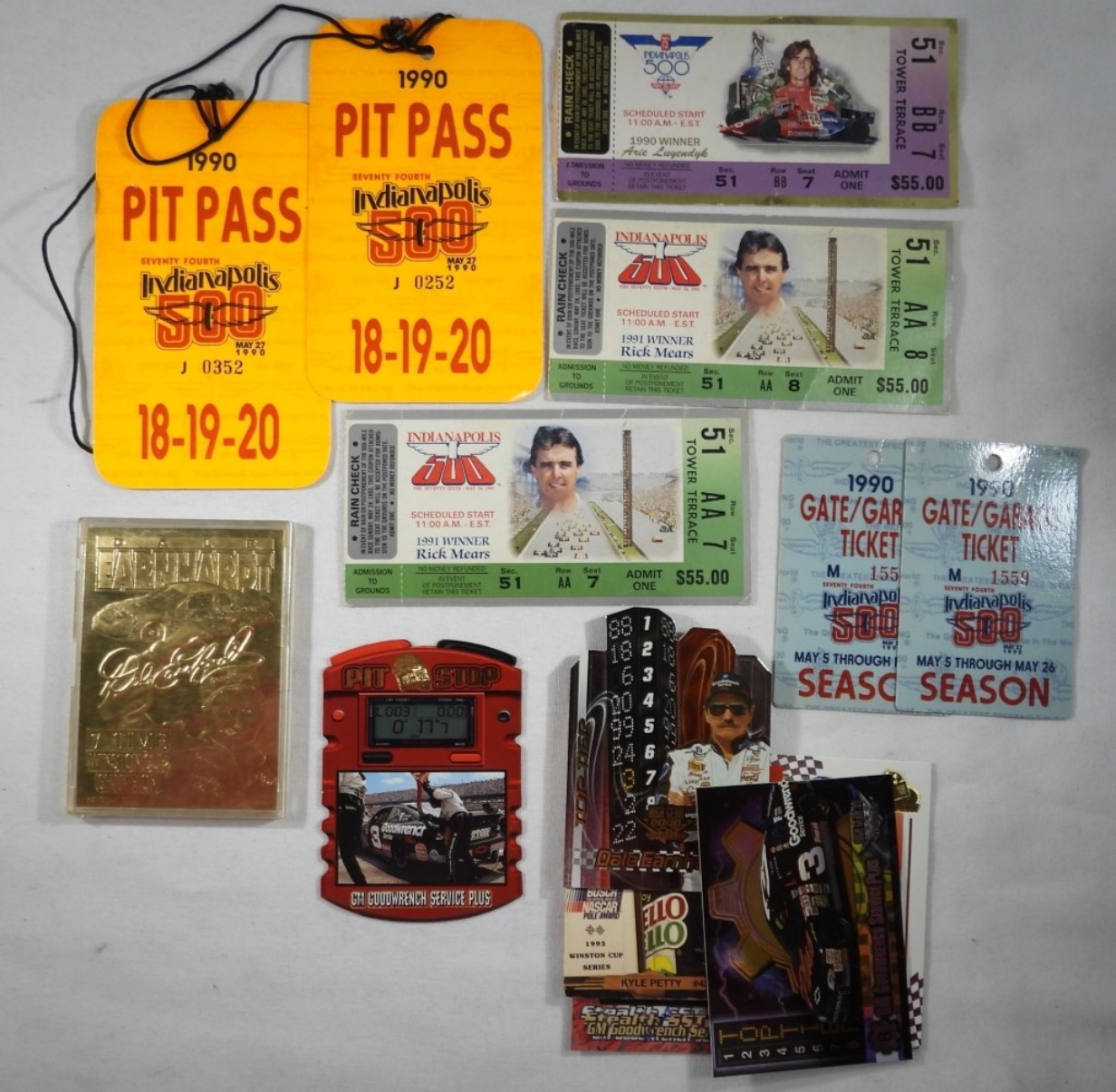 2 1990 PIT PASS INDI 500, 2 1990 GATE/GARAGE TICKETS INDO 500, 2 INDI 500 1991 WINNER RICK MEARS TICKETS, 1 INDI 500 1990 WINNER ARIE LUYEDYK TICKET,NASCAR CARDS, TIN OF CHEVROLET PLAYING CARDS (UNKNOWN IF COMPLETE DECK)