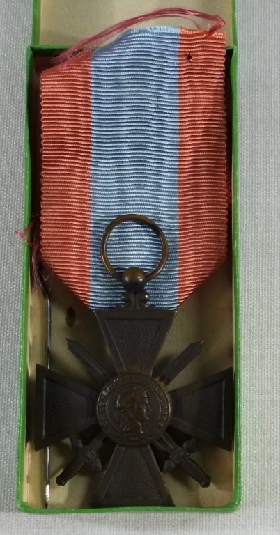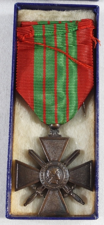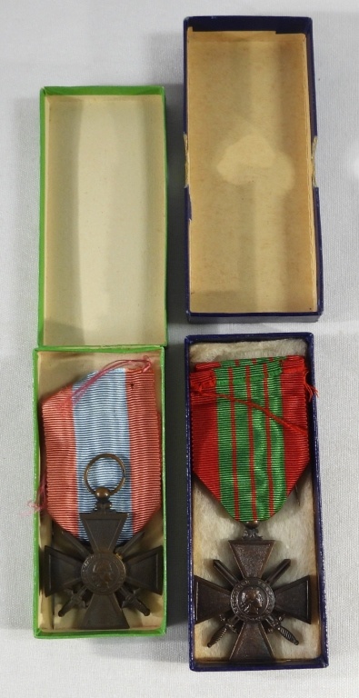 WORLD WAR 2, FRENCH THEATRE OPERATIONS MEDAL WITH RED AND BLUE RIBBON, UNATTACHED. IN A BOX. VINTAGE CROIX DE GUERRE FRENCH MILITARY MEDAL WITH RED AND GREEN RIBBON, UNATTACHED. IN BOX.