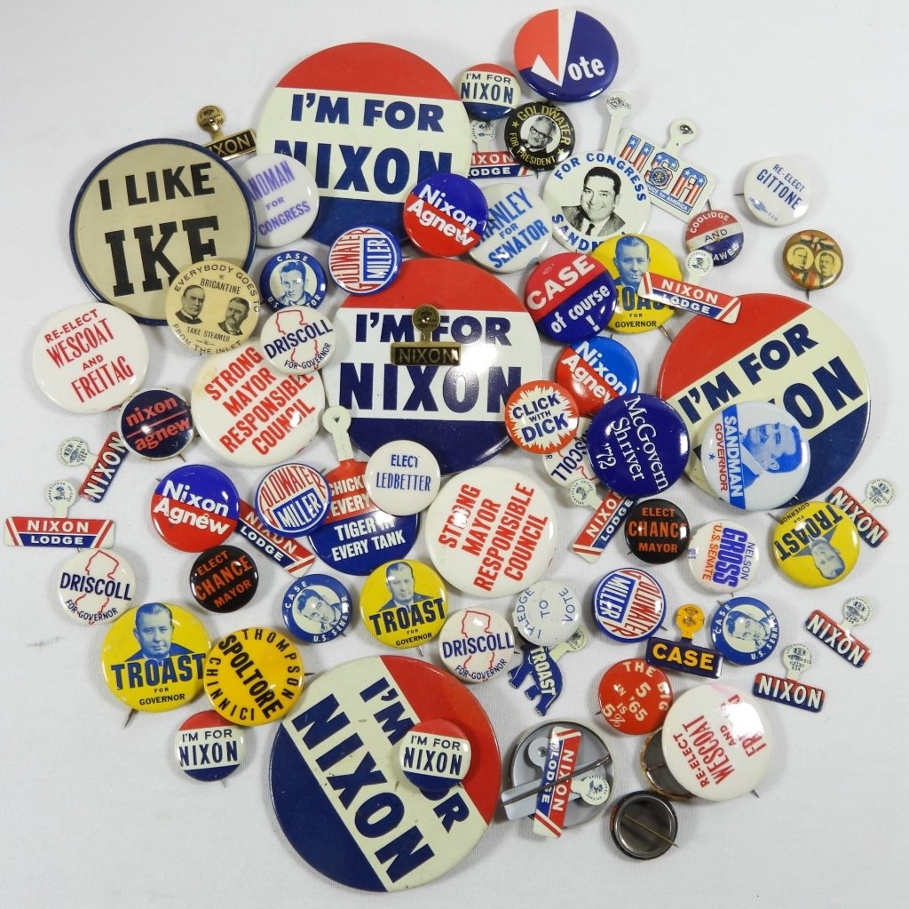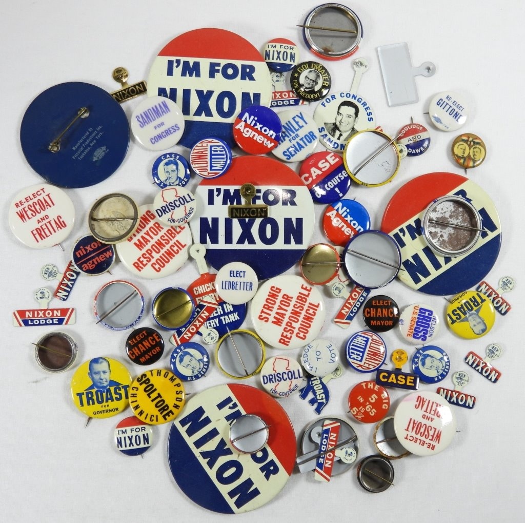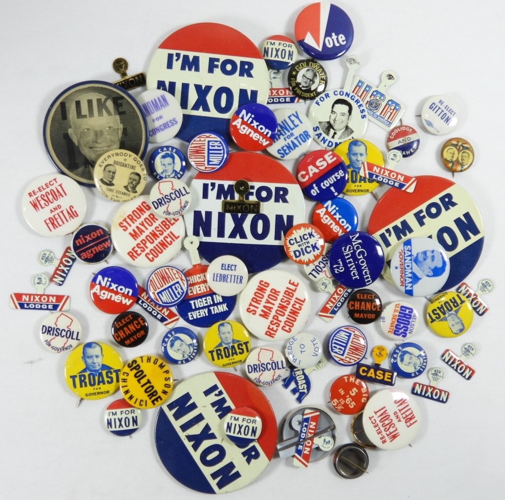 70 VINTAGE POLITICAL PINS. LOTS OF NIXON.