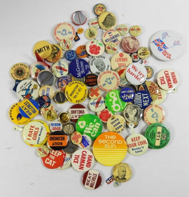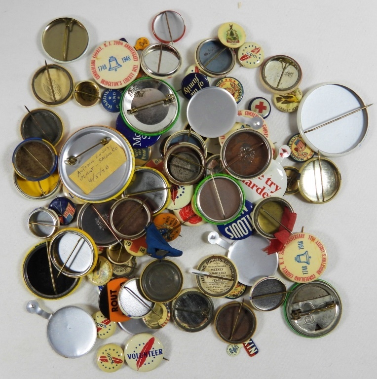 87 VINTAGE MISC PINS. POLITICAL & OTHER. SEE PHOTOS