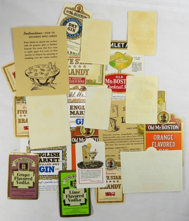 20 VINTAGE ALCOHOL BOTTLE LABELS FOR CRAFTING. COMES WITH DIRECTIONS ON HOW TO DECORATE WITH LABELS.