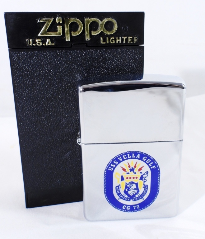 IN A ZIPPO BOX, SEALED, WITH USS VELLA GULF CG 72 LOGO ON THE FRONT