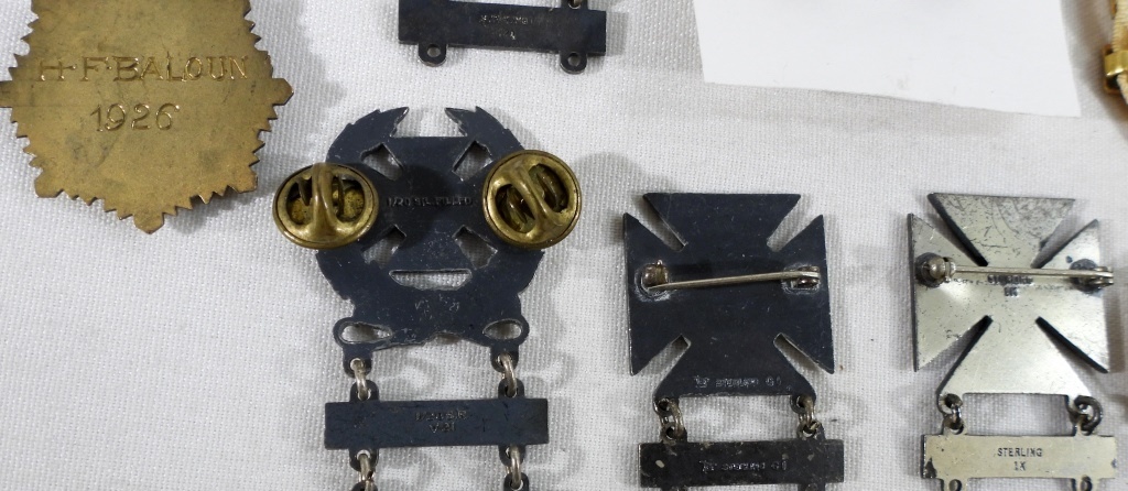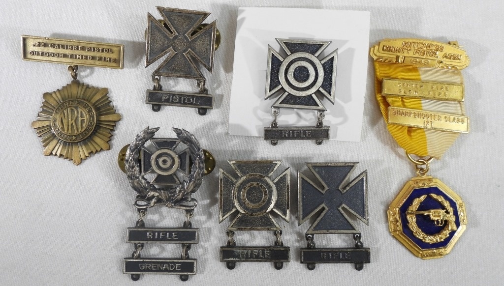 (5) MILITARY SHARPSHOOTER PINS, (1) 1948 DUTCHESS COUNTY PISTOL ASSN (1) NRA PIN