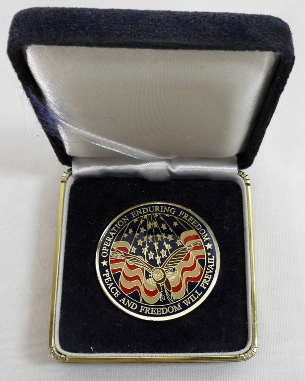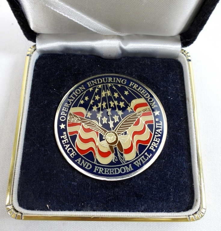 IN A BOX, GOOD CONDITION, ON THE FRONT AMERICA’S AIR FORCE, NO ONE COMES CLOSE WITH A B-2, ON THE BACK AN AMERICAN EAGLE WITH ” OPERATION ENDURING FREEDOM”, “PEACE AND FREEDOM WILL PREVAIL”