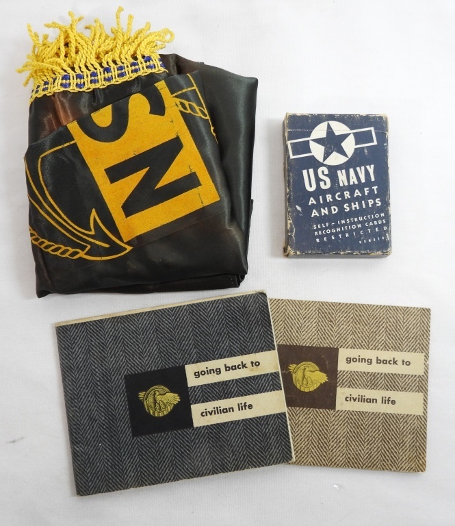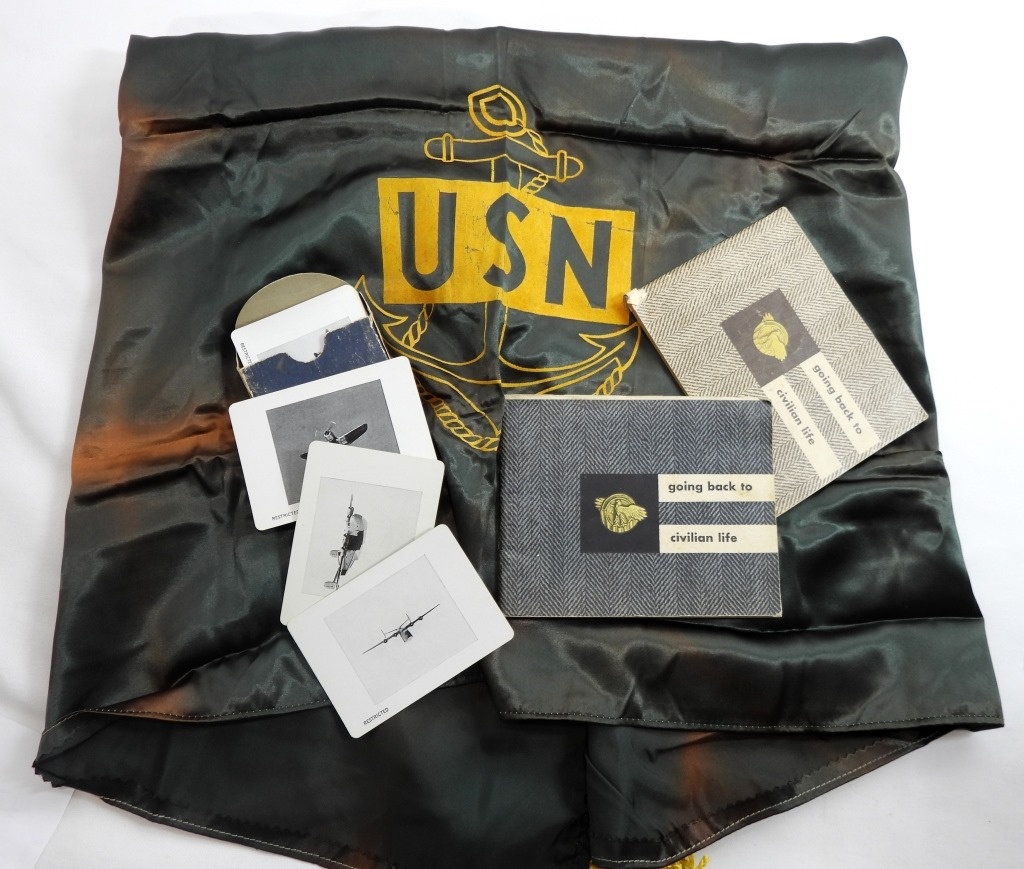 1 SET OF US NAVY AIRCRAFT AND SHIPS SELF-INSTRUCTION RECOGNITION CARDS NUMBER 1, 2 GOING BACK TO CIVILIAN LIFE HANDBOOKS, 1- USN SILK BANNER