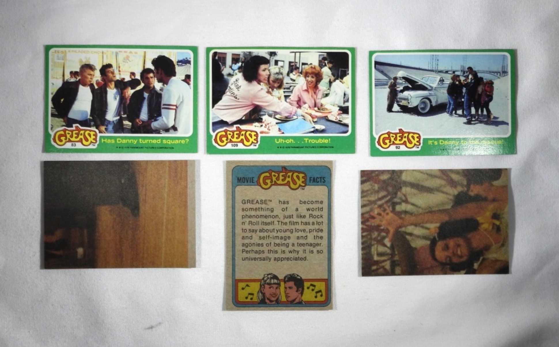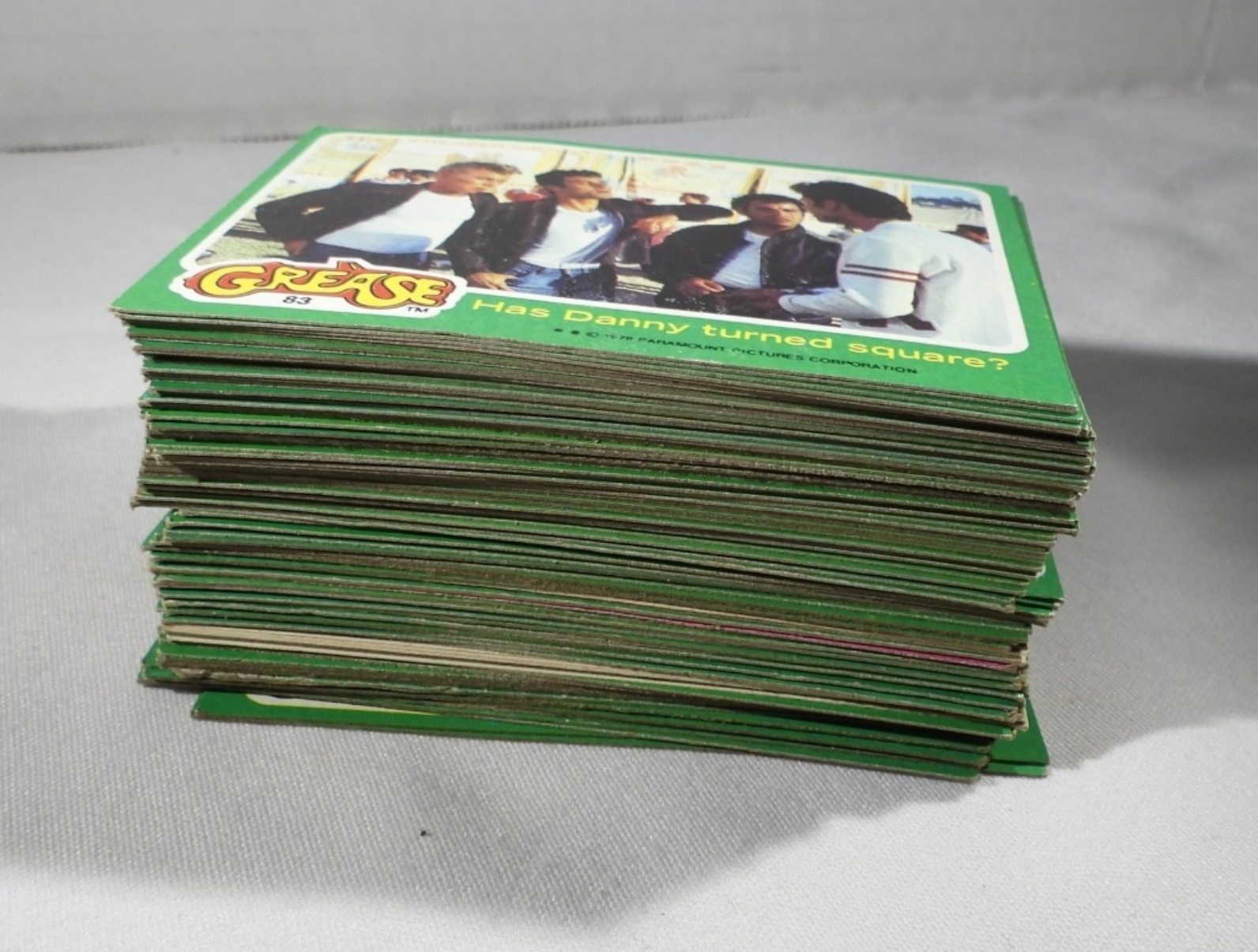 104 GREASE TRADING CARDS, 1978. TRADING CARDS, STICKERS AND 1 FULL (4 PIECE) JOHN TRAVOLTA PUZZLE POSTER. ALL GREEN, THERE ARE SOME DUPLICATES! ALL IN PRETTY GOOD CONDITION. SEE PHOTOS