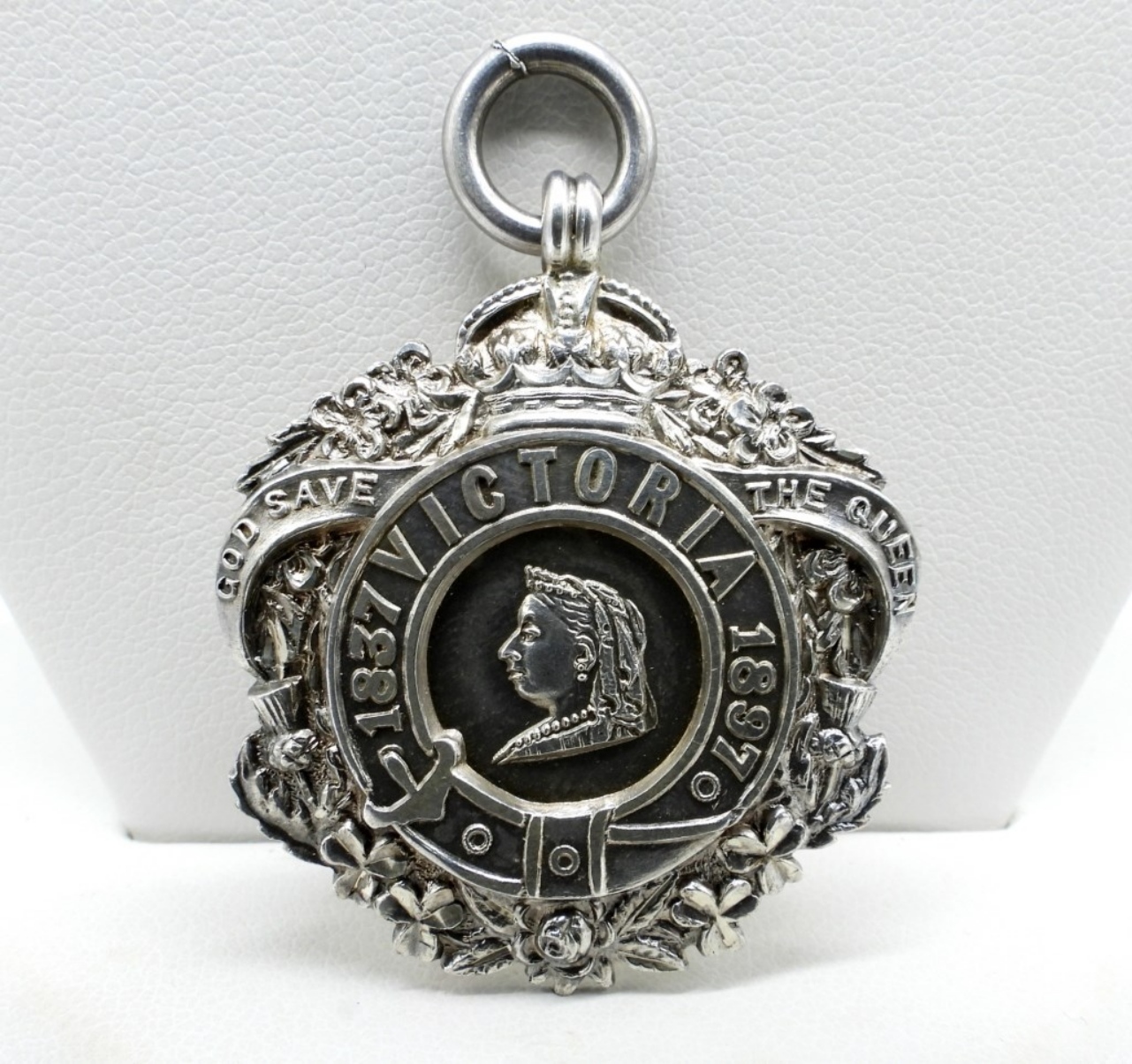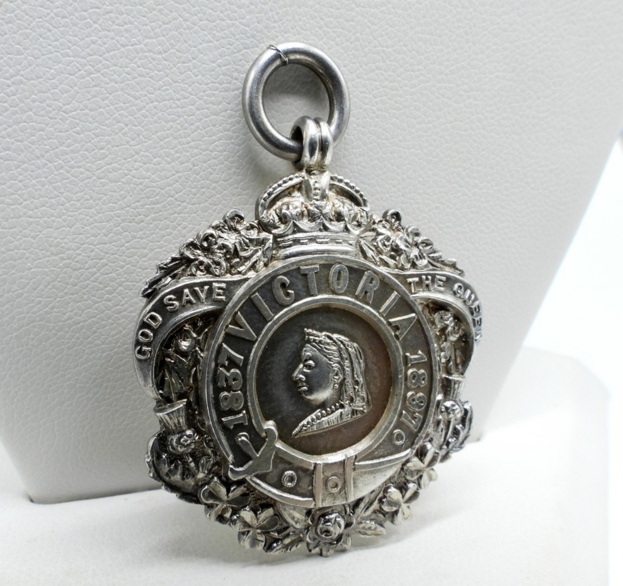 QUEEN VICTORIA DIAMOND JUBILEE STERLING, 60TH ANNIVERSARY PENDANT, 1897. 94% SILVER. 2″ LONG. (10.4 DWT)