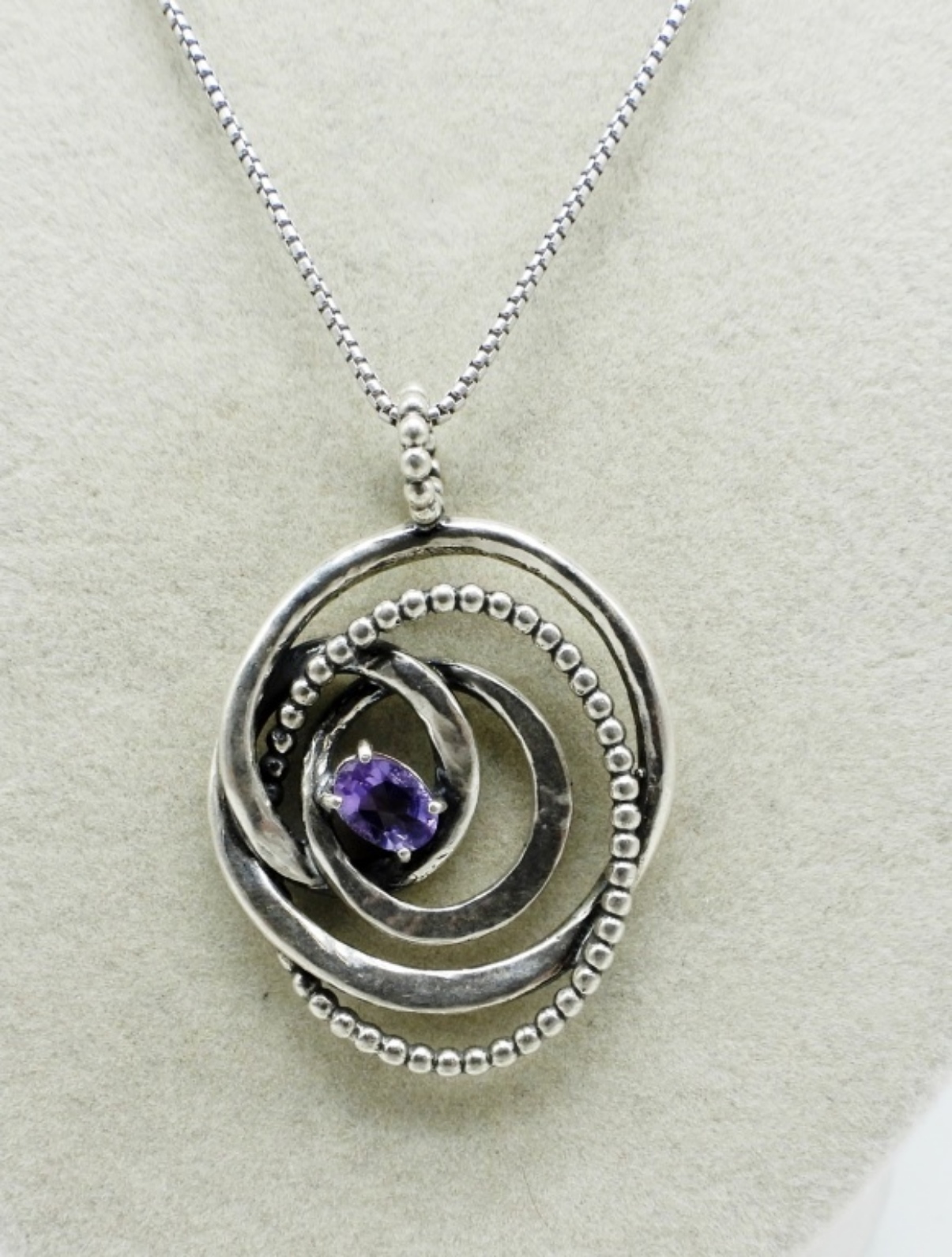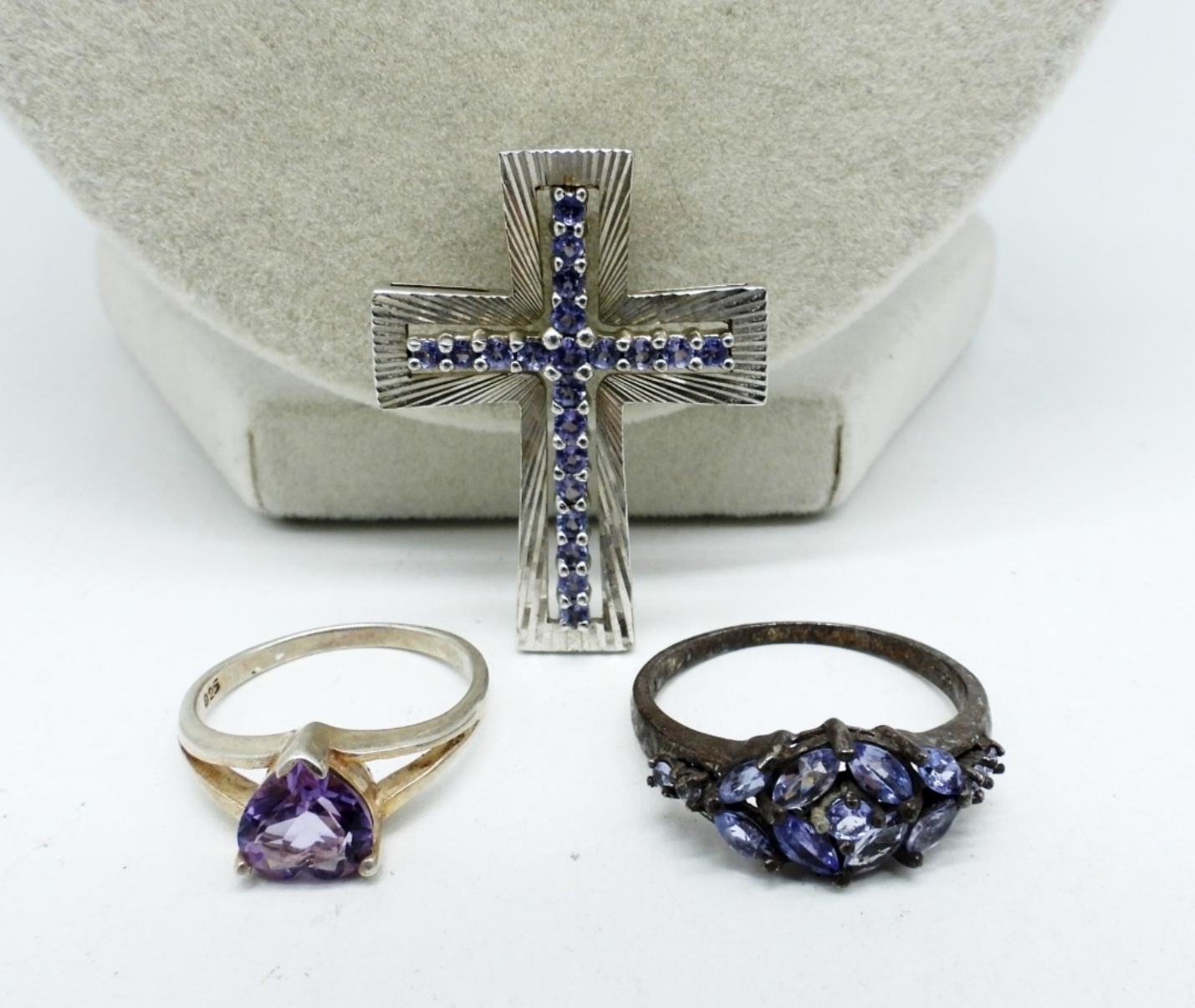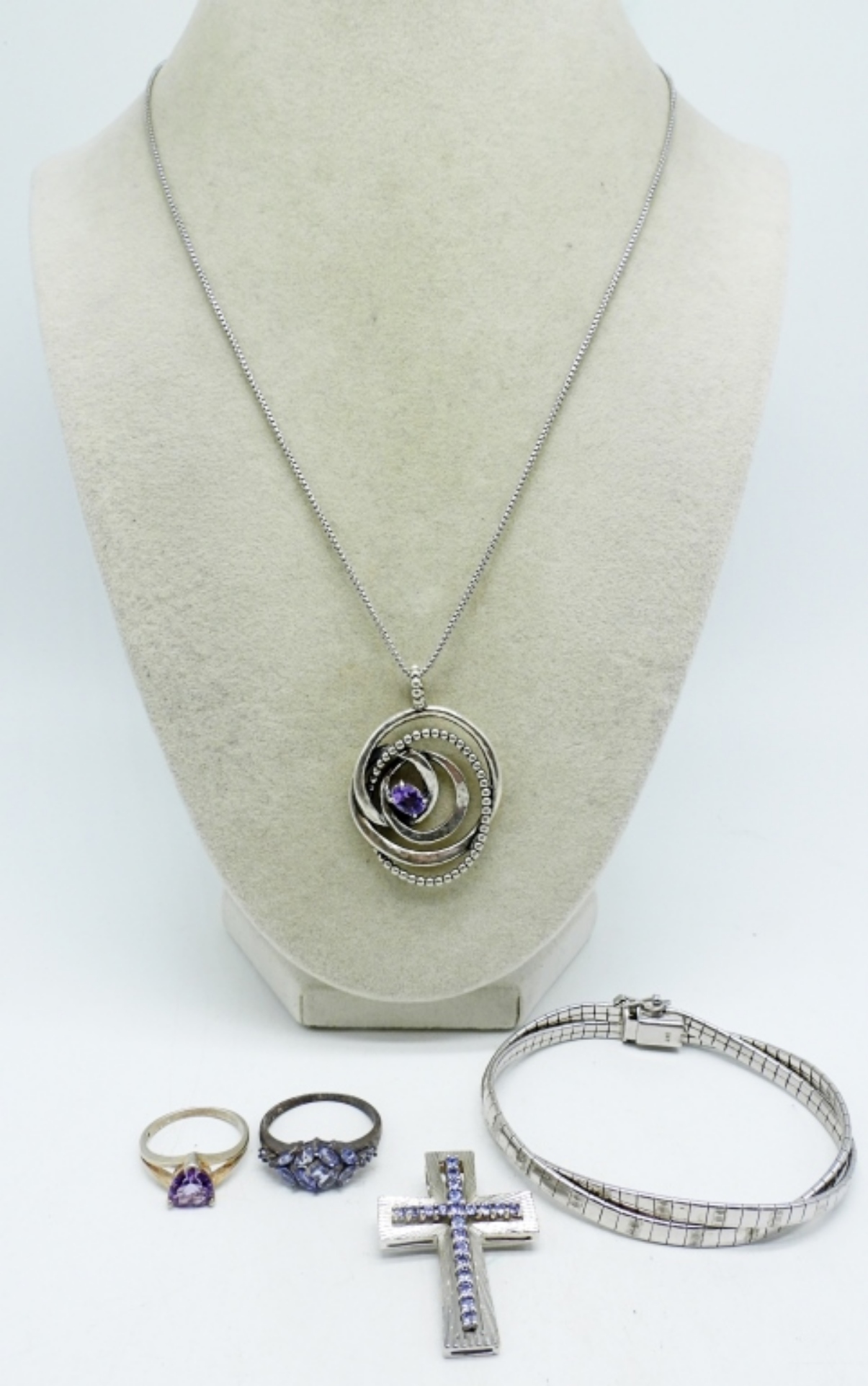 STERLING AMETHYST GEMSTONE RINGS, SIZE 6 & 9. 18″ CHAIN & TWO AMETHYST PENDANTS. BRACELET IS 7″. (24.7 DWT)