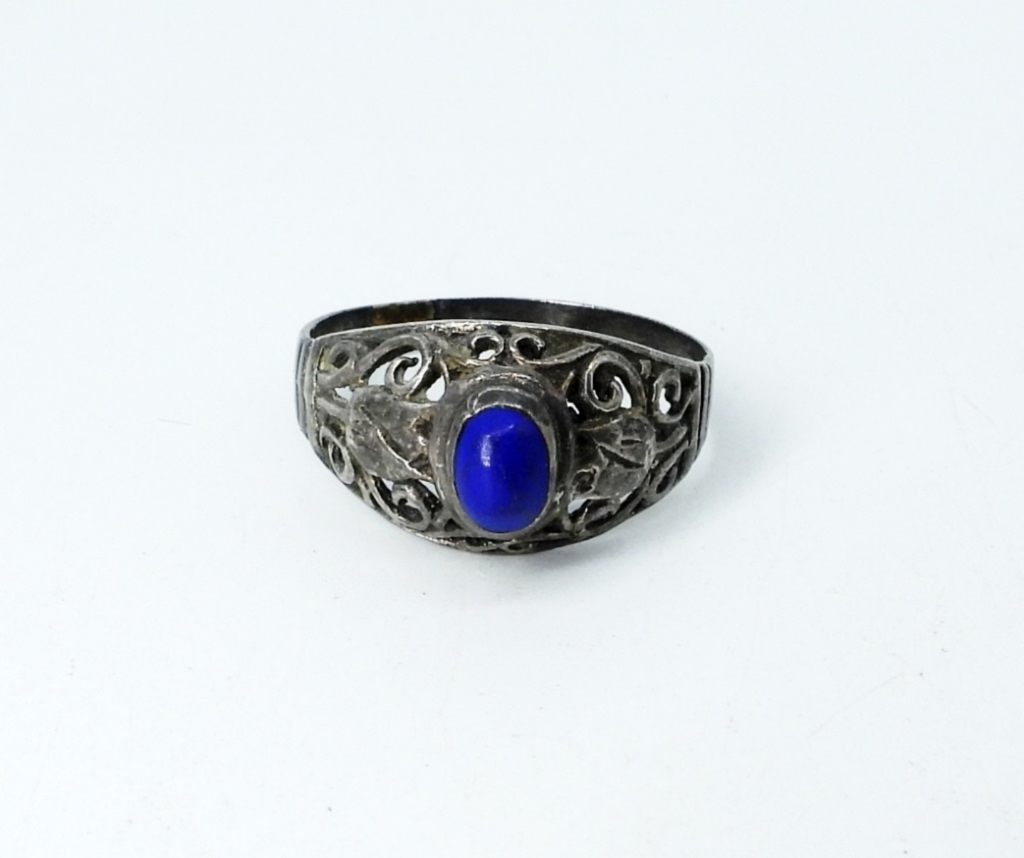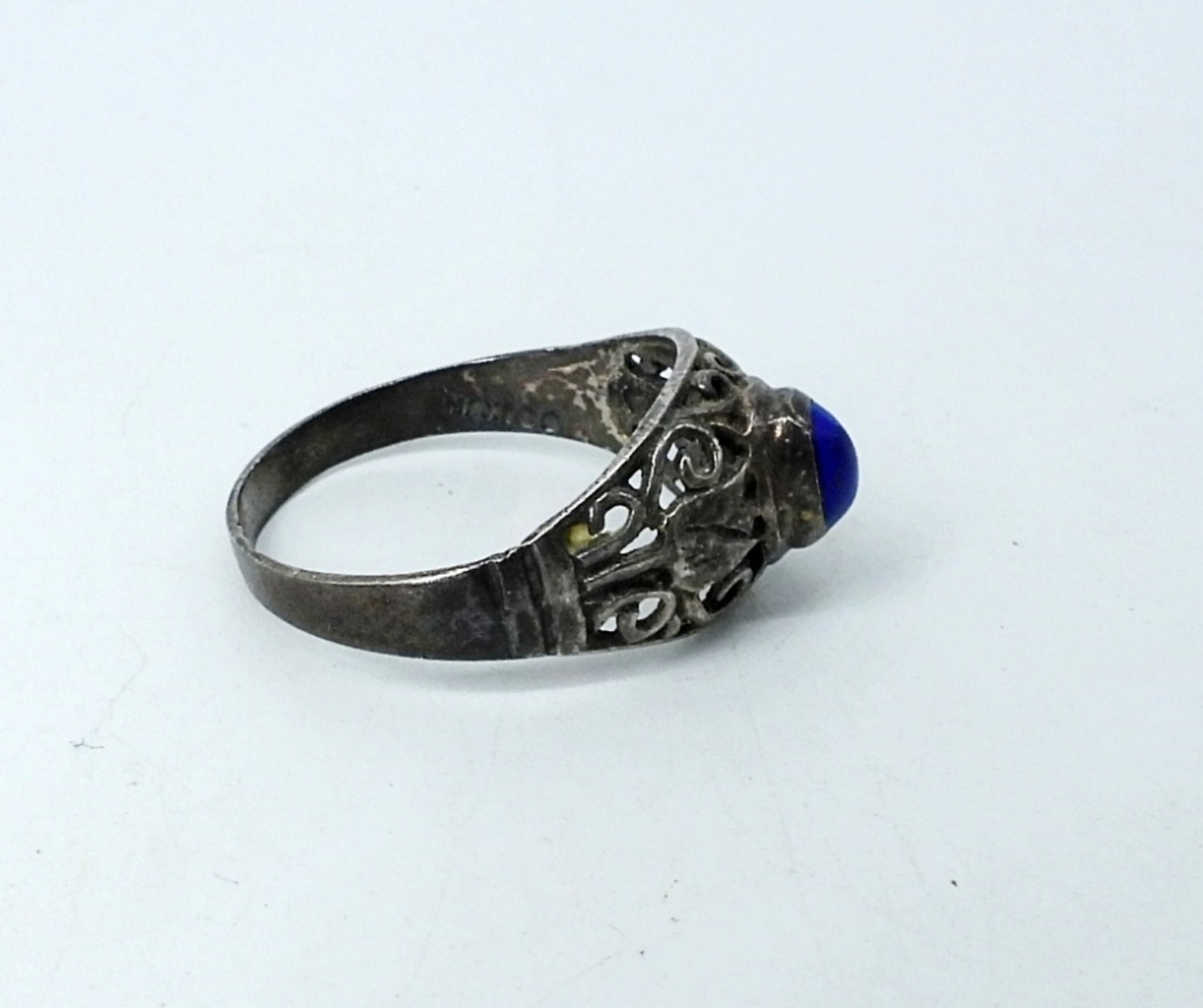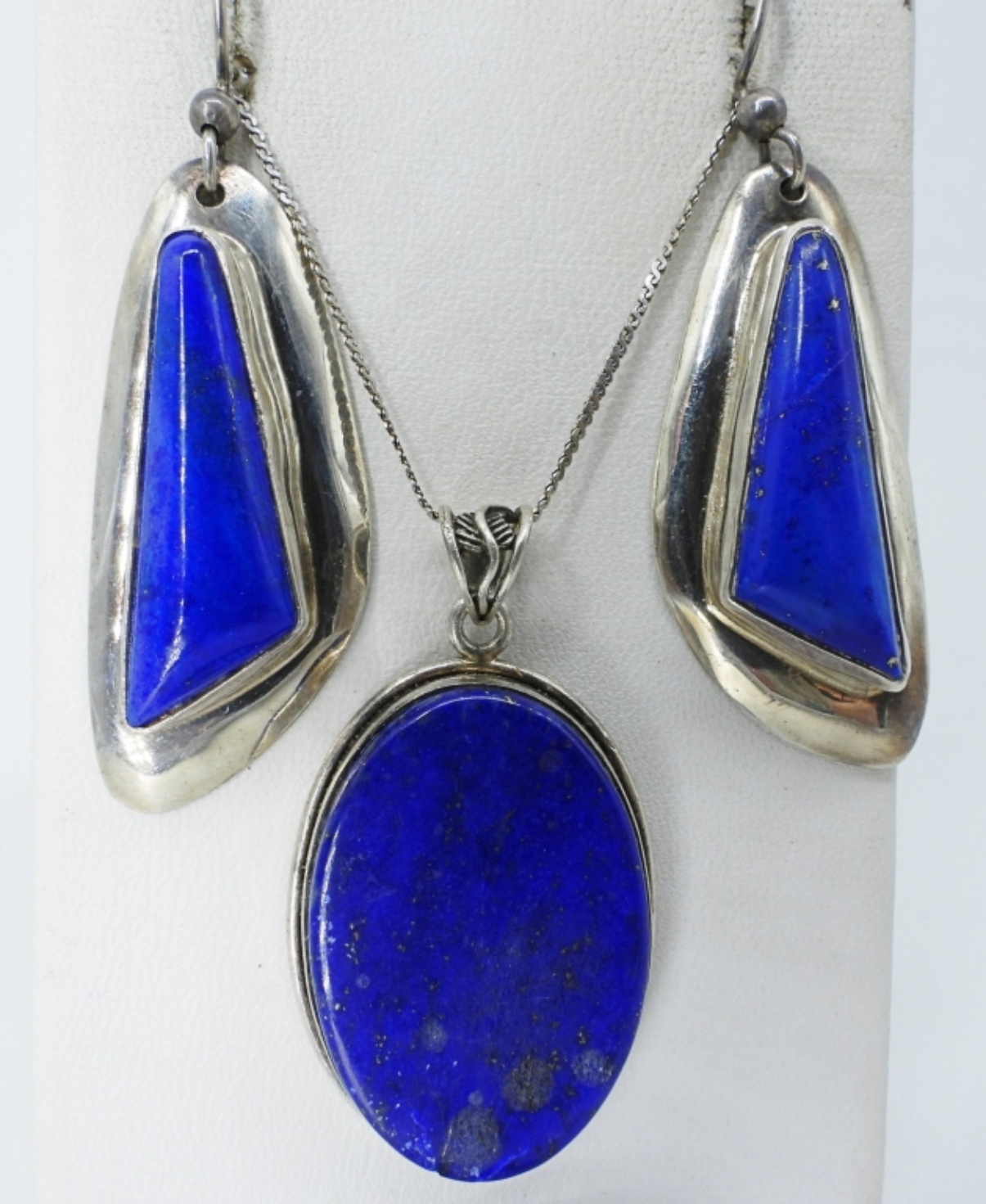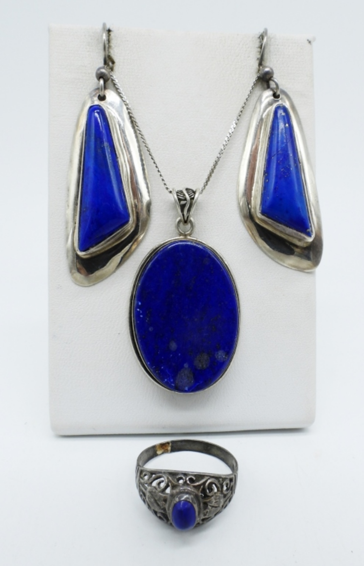 LAPIS LAZULI GEMSTONES, STERLING SILVER. NECKLACE 18″. RING SIZE 8.5 PIERCED EARRINGS. (20.4 DWT)