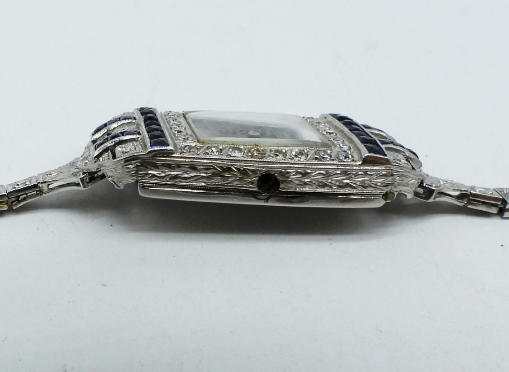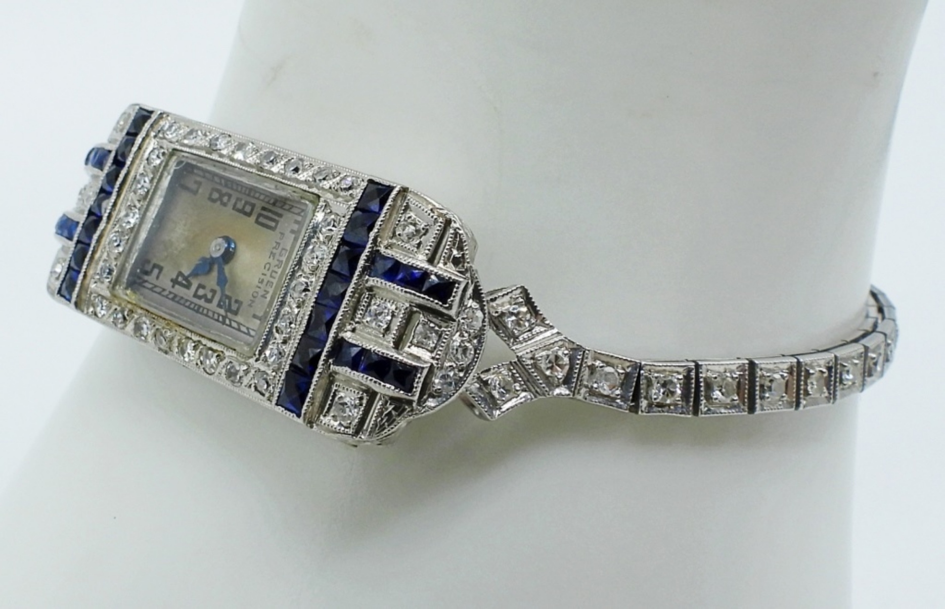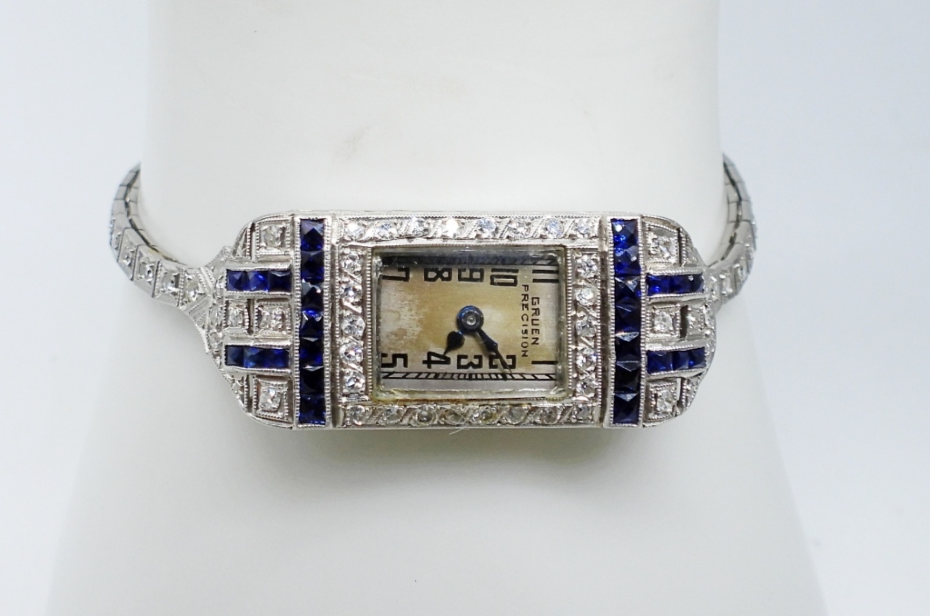 GRUEN ANTIQUE STERLING WATCH WITH DIAMONDS (TESTED) AND SAPPHIRES. THE CROWN IS MISSING / BROKEN. CLASP BROKEN. SOME DISCOLORATION ON THE FACE. 6″ LONG. VERY BEAUTIFUL WATCH! (12.7 DWT)
